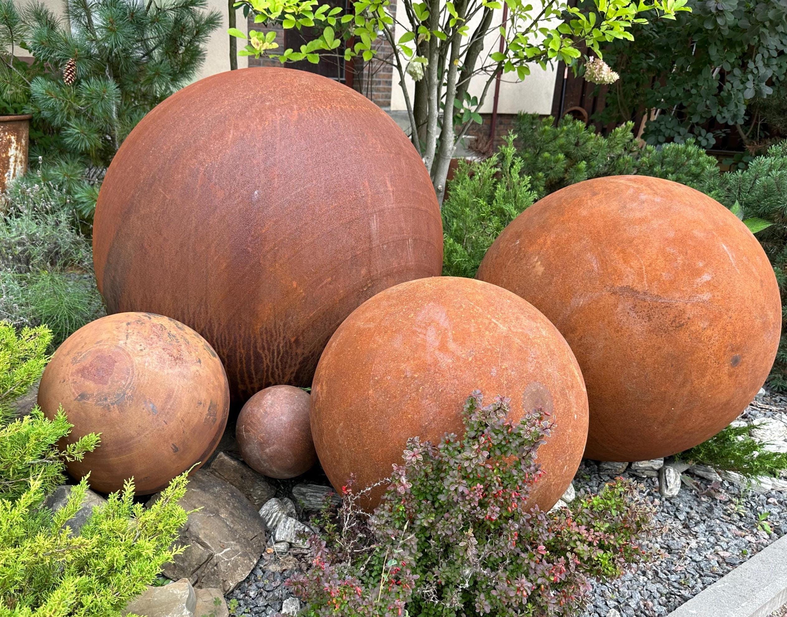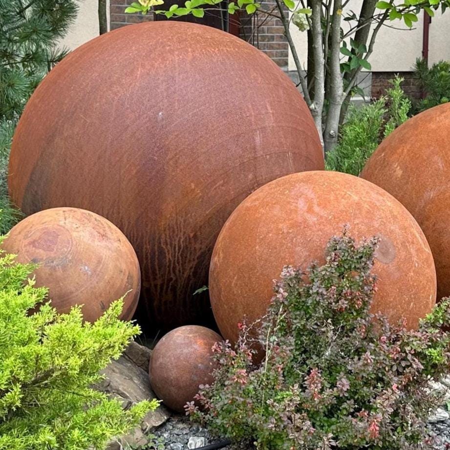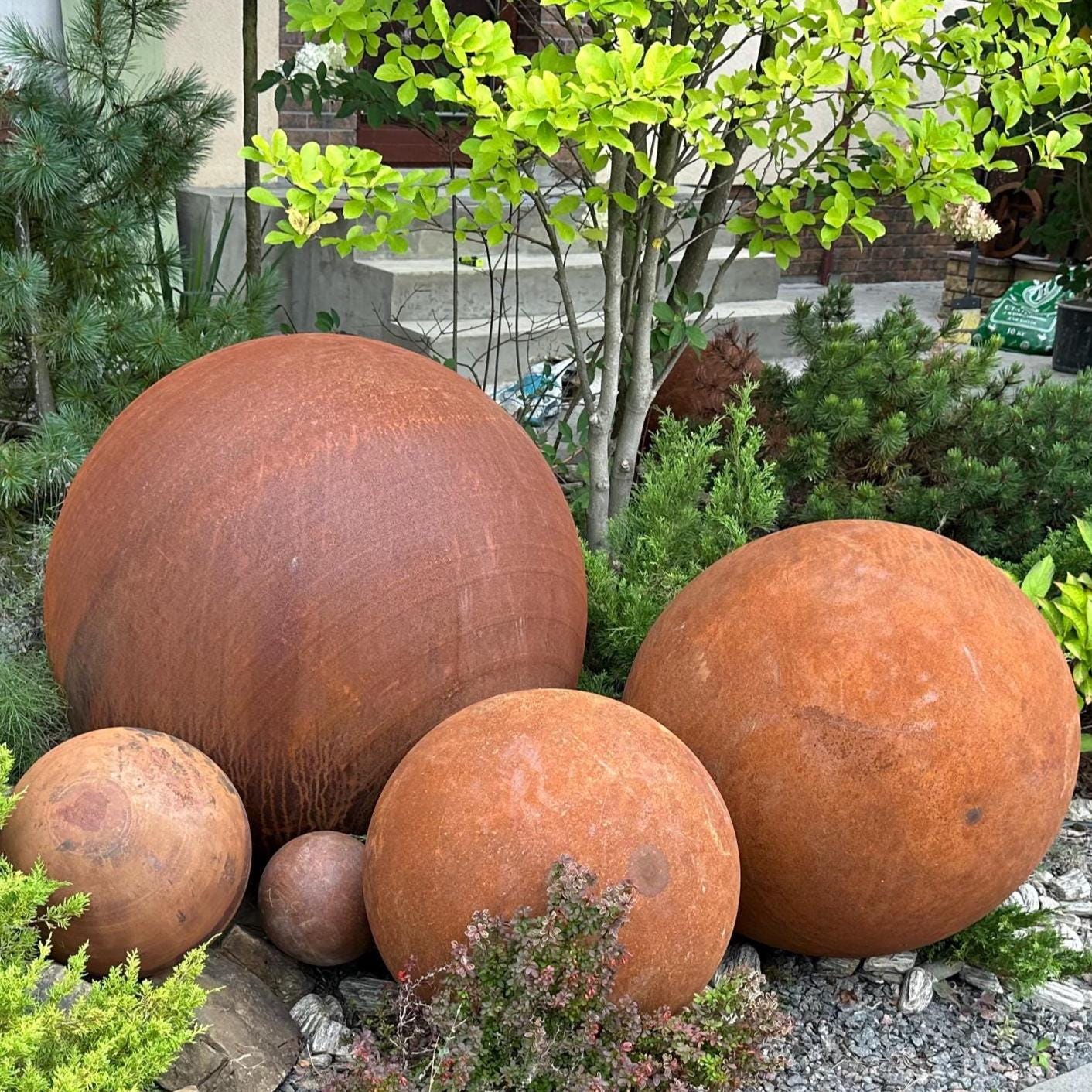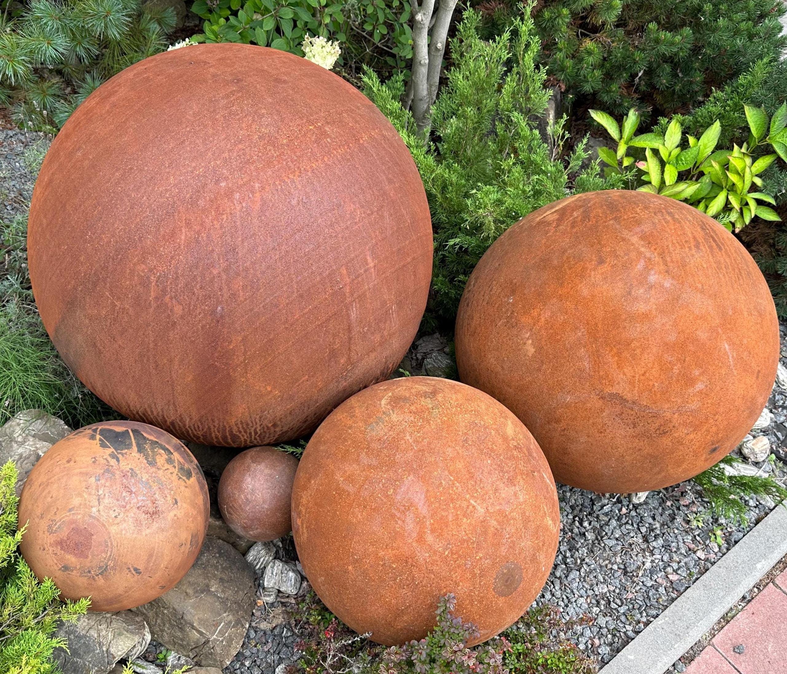 Add a serene and calming touch to your outdoor space with our unique really big set of five 35”, 27”, 20”, 14” and 10” Rusty Metal Simple Shapes Zen Garden Spheres. This large spherical sculpture set adds a modern and minimalist flair to your garden while promoting a peaceful and meditative atmosphere. Made with high-quality metal, the sphere features a rustic, weathered finish that creates a natural and organic look. Place it in your garden or on your patio, and watch the sphere beautifully age over time. This sphere will blend perfectly with the surrounding flora, creating a truly Zen experience. Use it as the centerpiece of your mini Japanese rock garden or use this sphere to decorate your lawn, garden, or patio all year round. It's also a great conversation piece for your living room or office, a unique way to bring nature into your home. Don't miss your chance to own this stunning Big Rusty Metal Zen Garden Spheres set! The possibilities are endless with this unique and stunning decor item. Shop today and add a touch of tranquility to your outdoor living space!