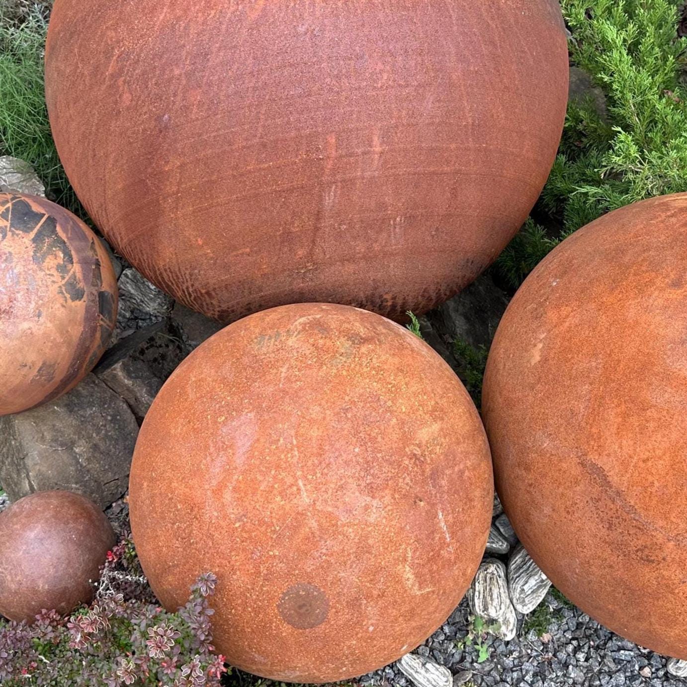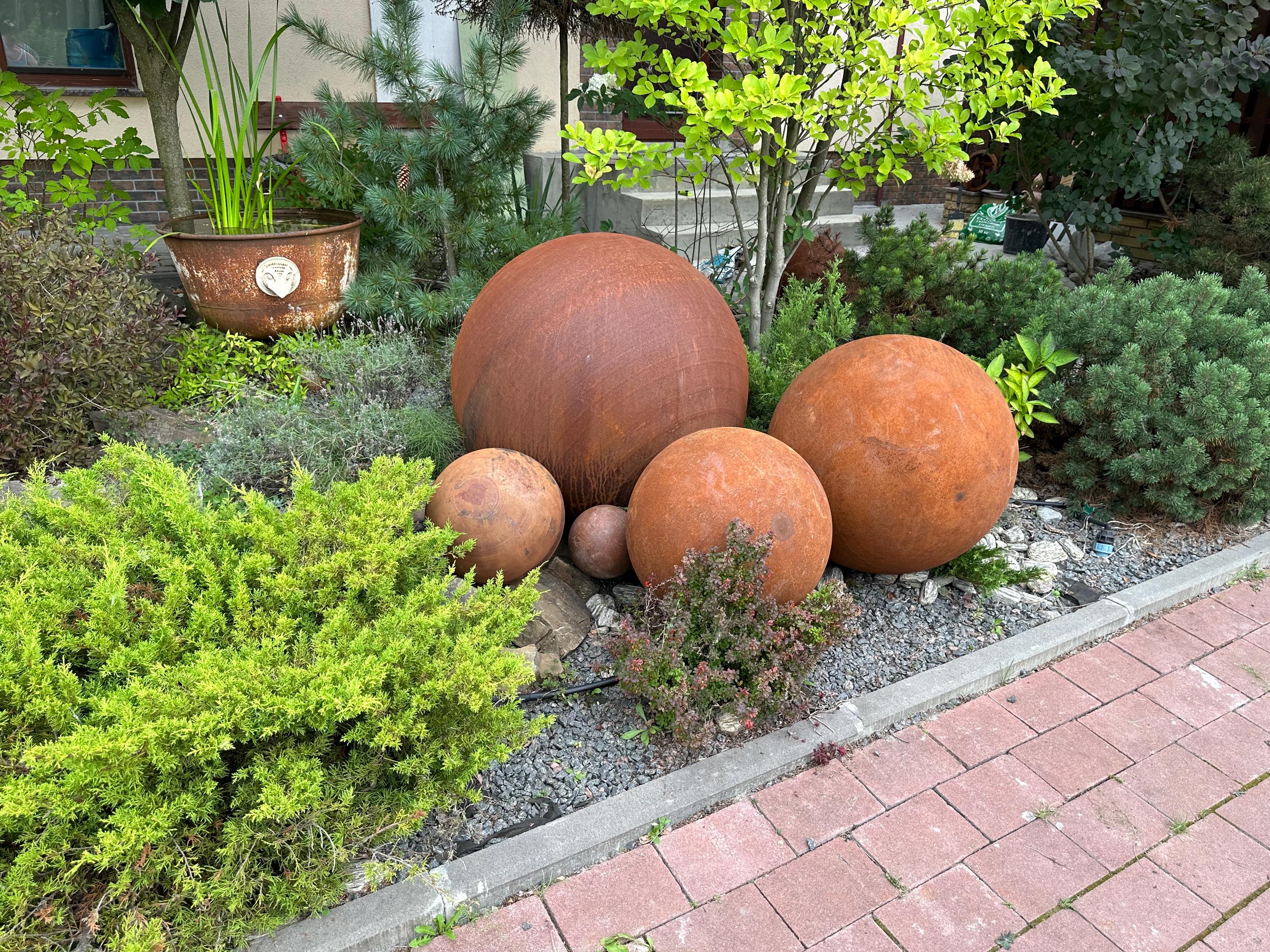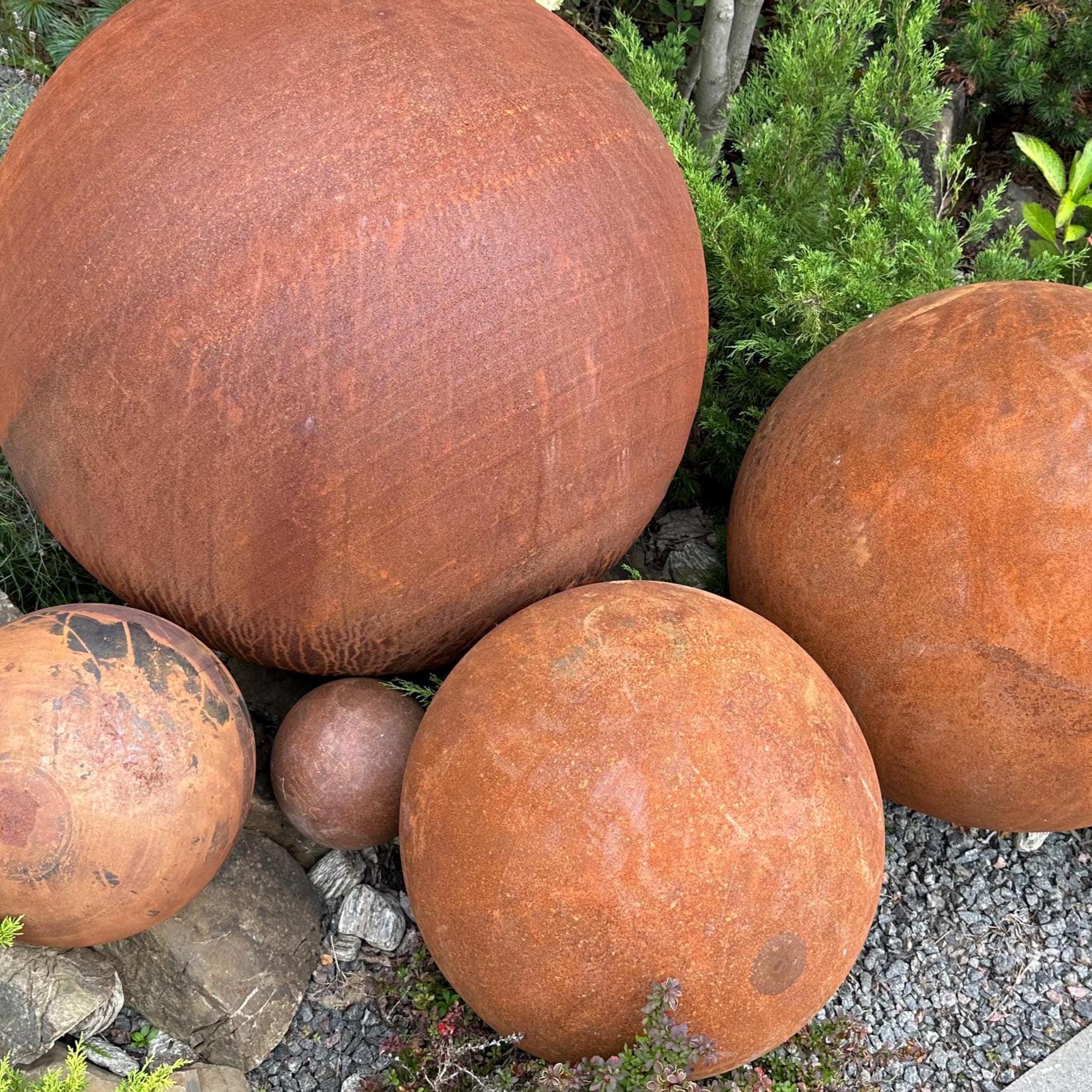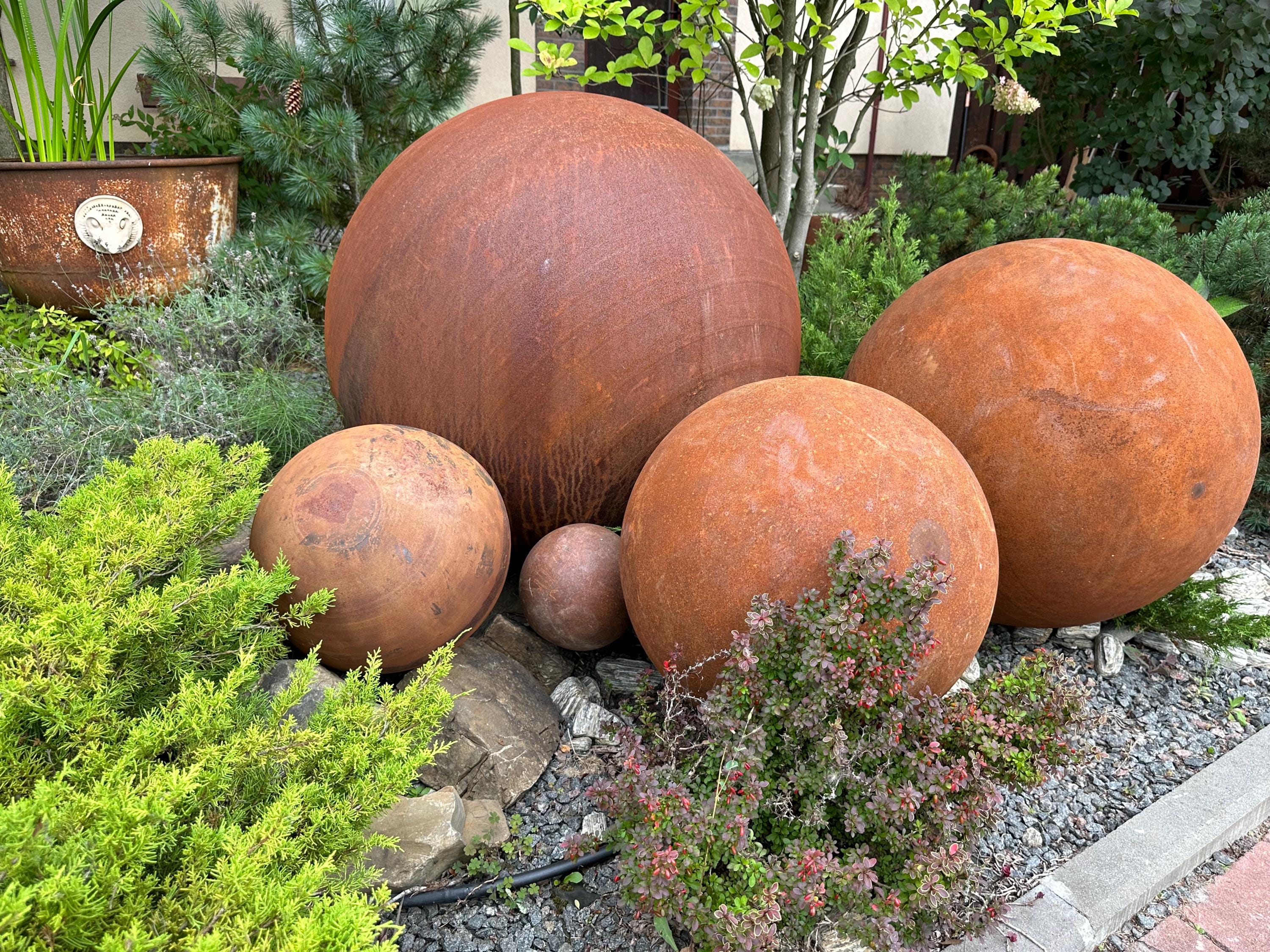 Add a serene and calming touch to your outdoor space with our unique really big set of five 35”, 27”, 20”, 14” and 10” Rusty Metal Simple Shapes Zen Garden Spheres. This large spherical sculpture set adds a modern and minimalist flair to your garden while promoting a peaceful and meditative atmosphere. Made with high-quality metal, the sphere features a rustic, weathered finish that creates a natural and organic look. Place it in your garden or on your patio, and watch the sphere beautifully age over time. This sphere will blend perfectly with the surrounding flora, creating a truly Zen experience. Use it as the centerpiece of your mini Japanese rock garden or use this sphere to decorate your lawn, garden, or patio all year round. It's also a great conversation piece for your living room or office, a unique way to bring nature into your home. Don't miss your chance to own this stunning Big Rusty Metal Zen Garden Spheres set! The possibilities are endless with this unique and stunning decor item. Shop today and add a touch of tranquility to your outdoor living space!
