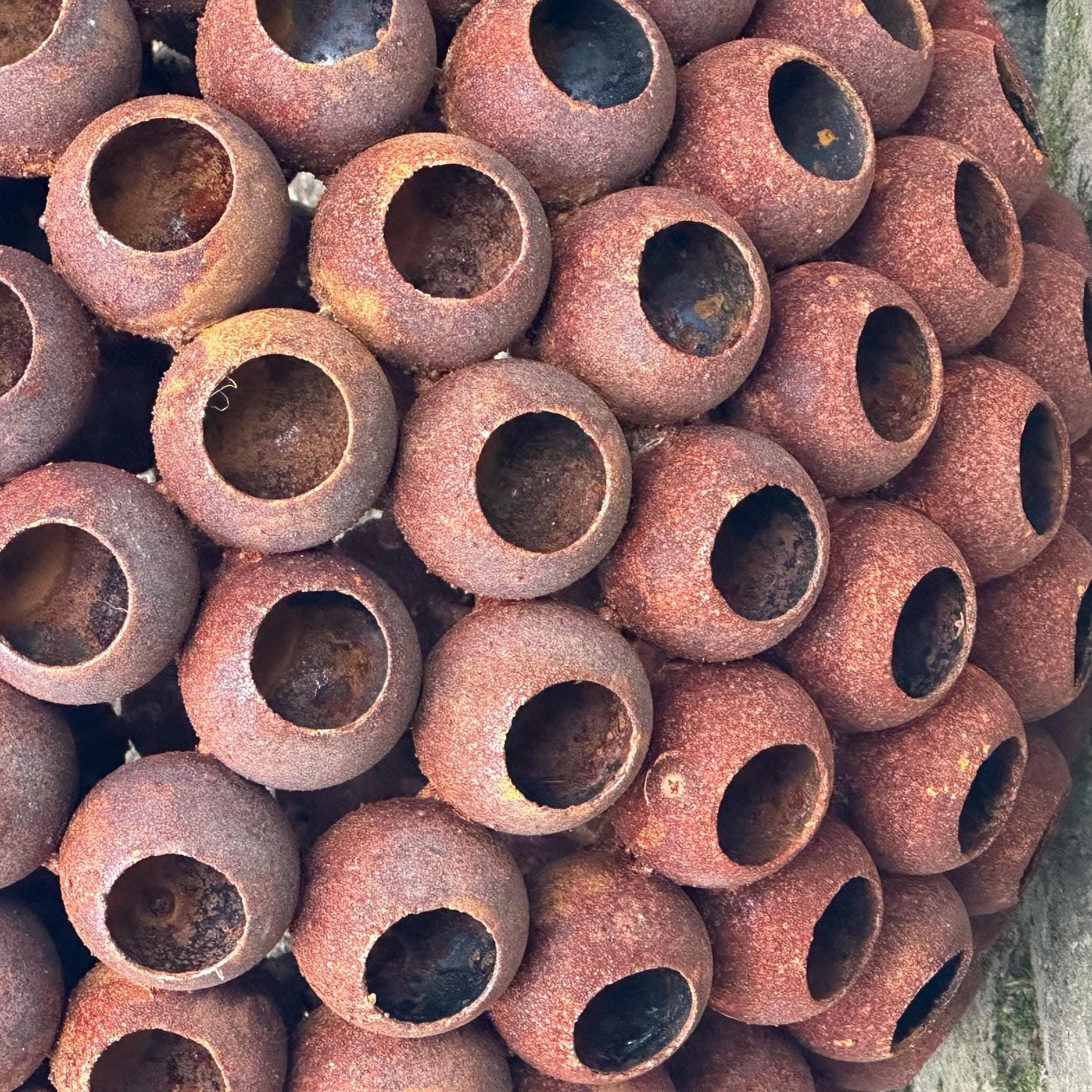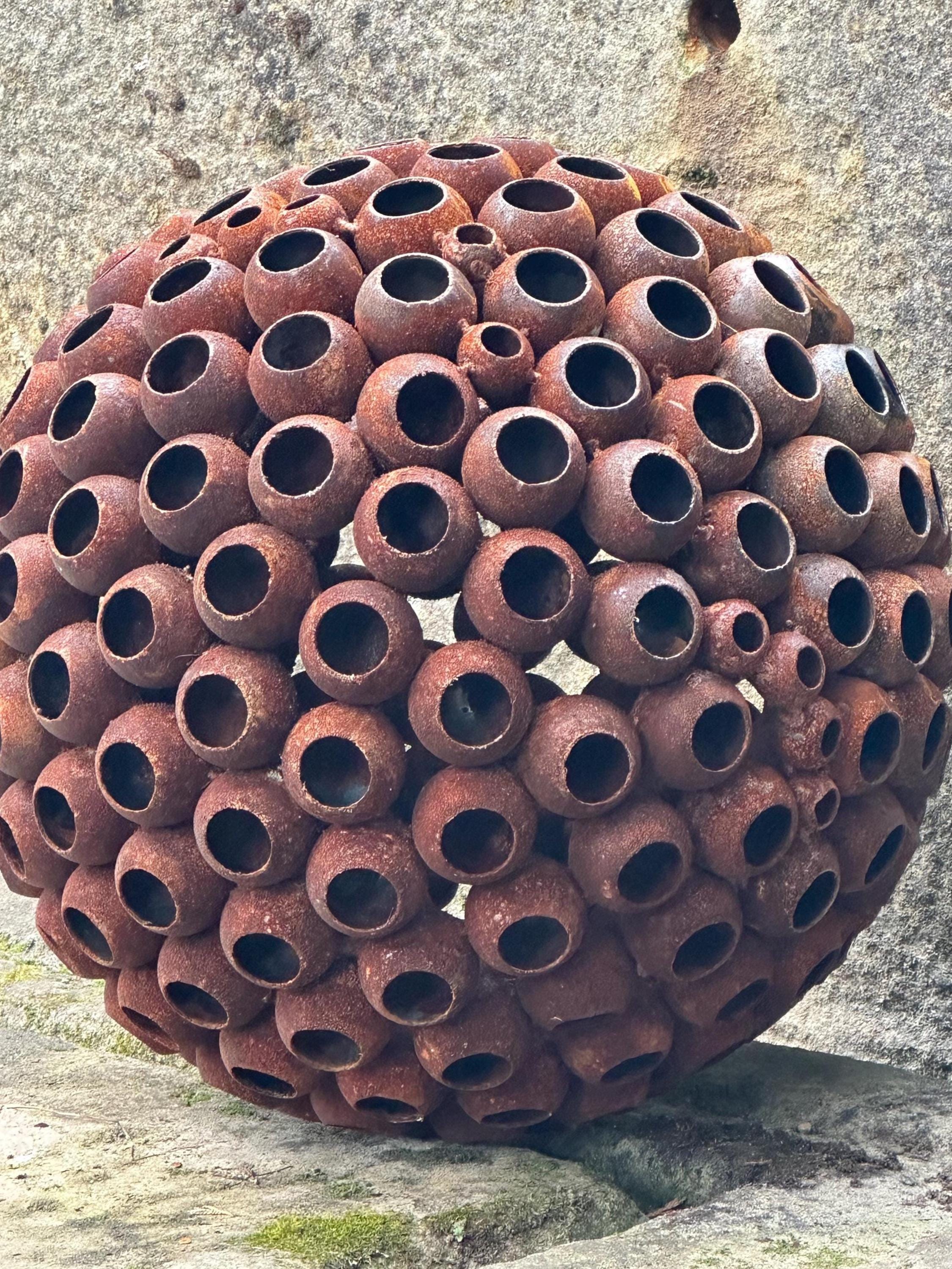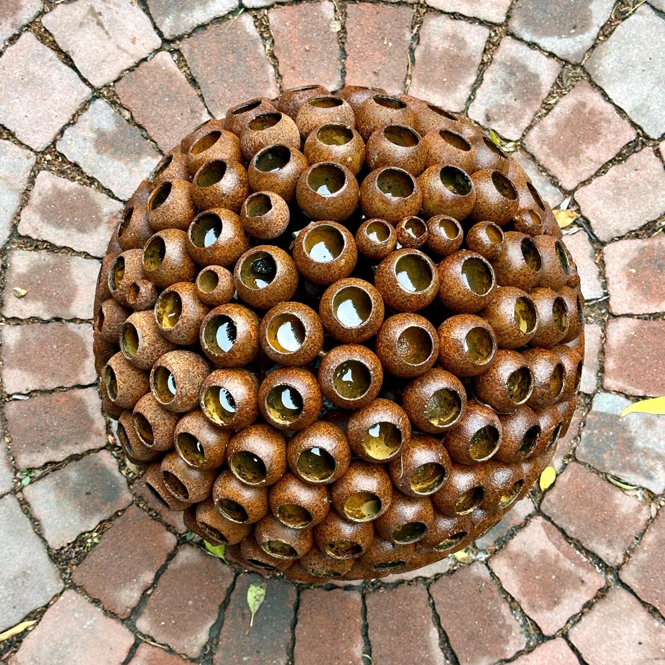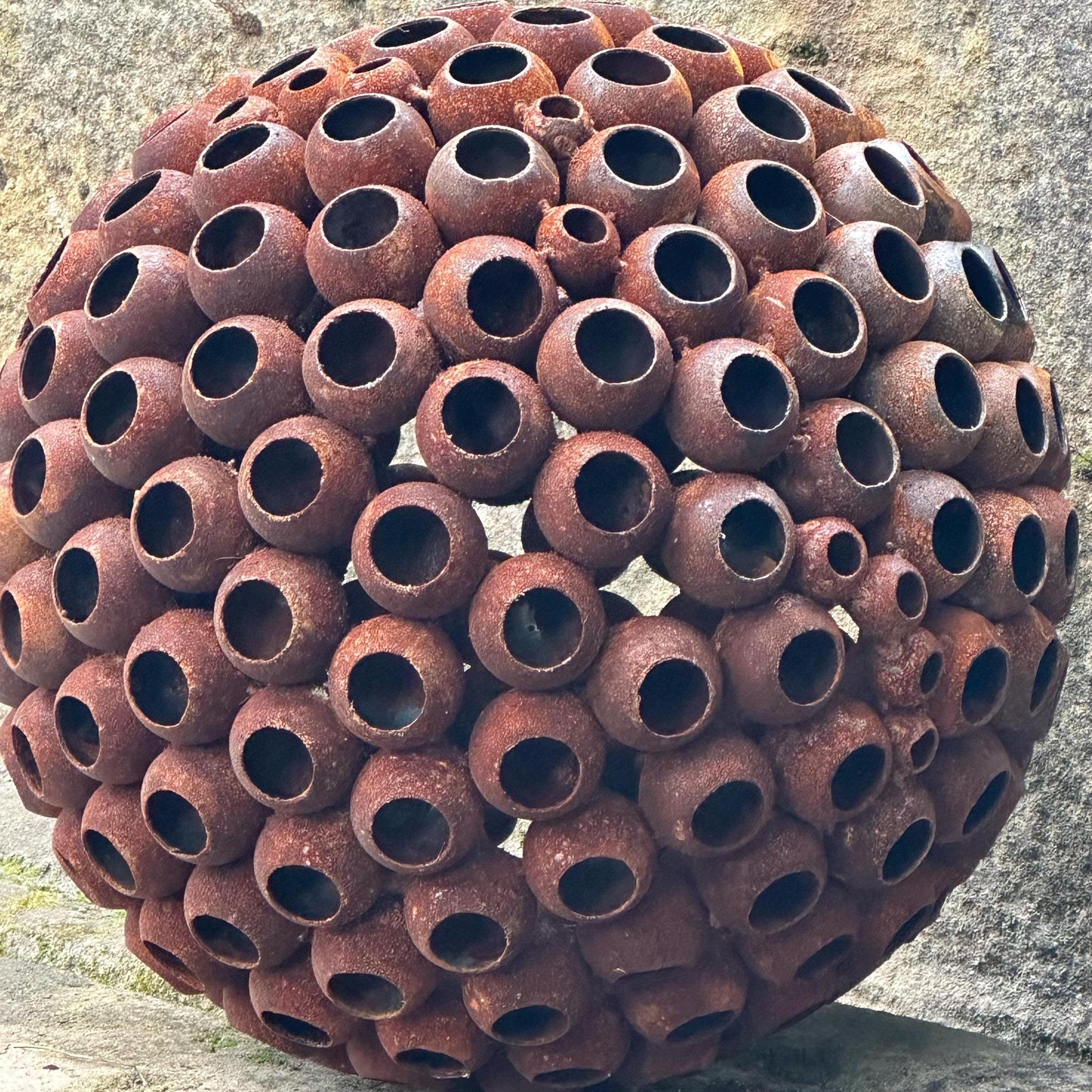 This garden rusty metal abstract sculpture is made of more than 200 small 1.5” metal balls with a holes.