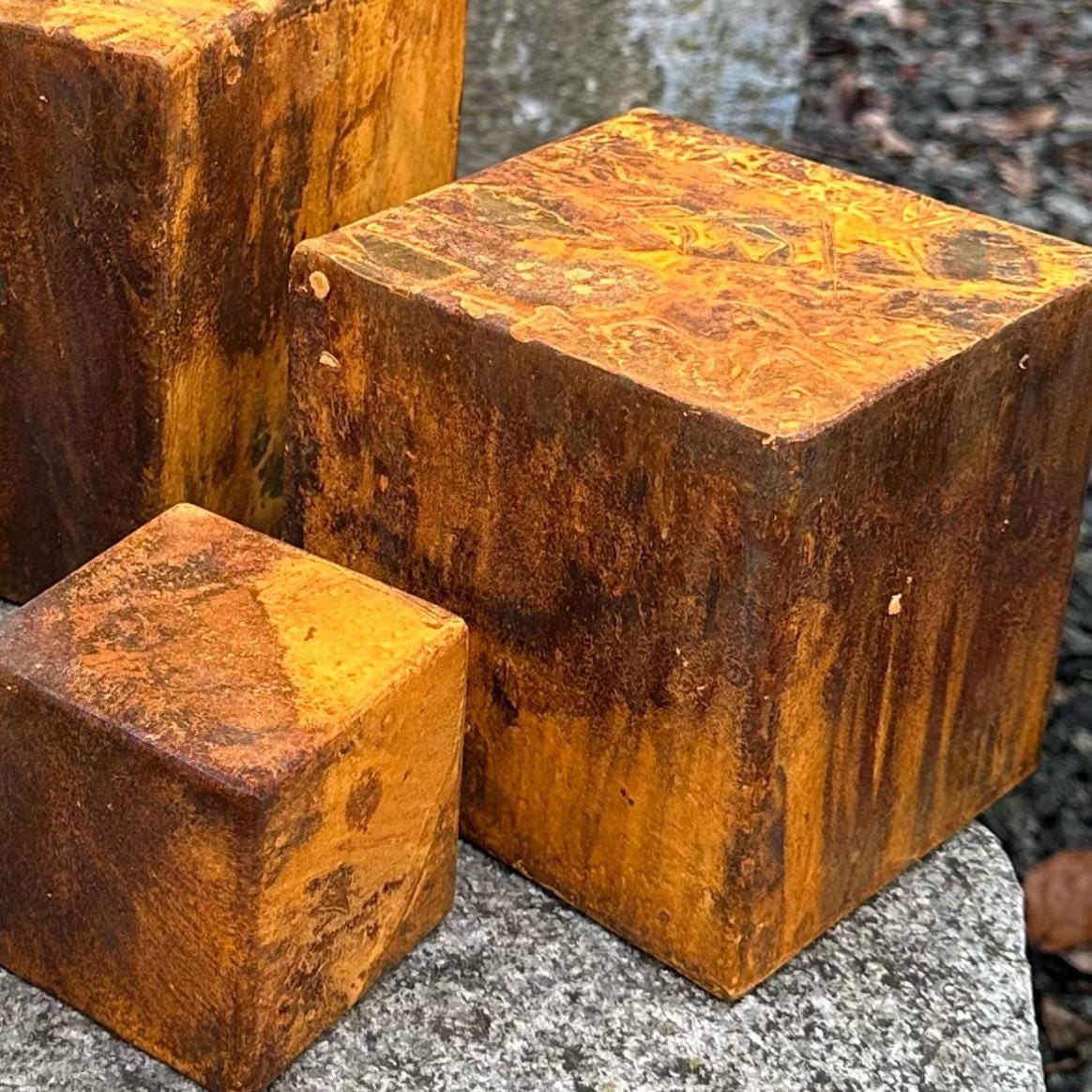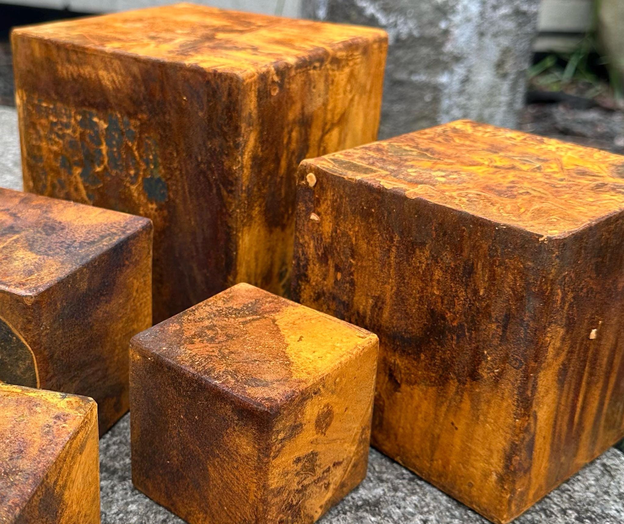 - One 5” (12 cm) rusty metal cube. Weight is around 1,5 lbs (700 gr) each.