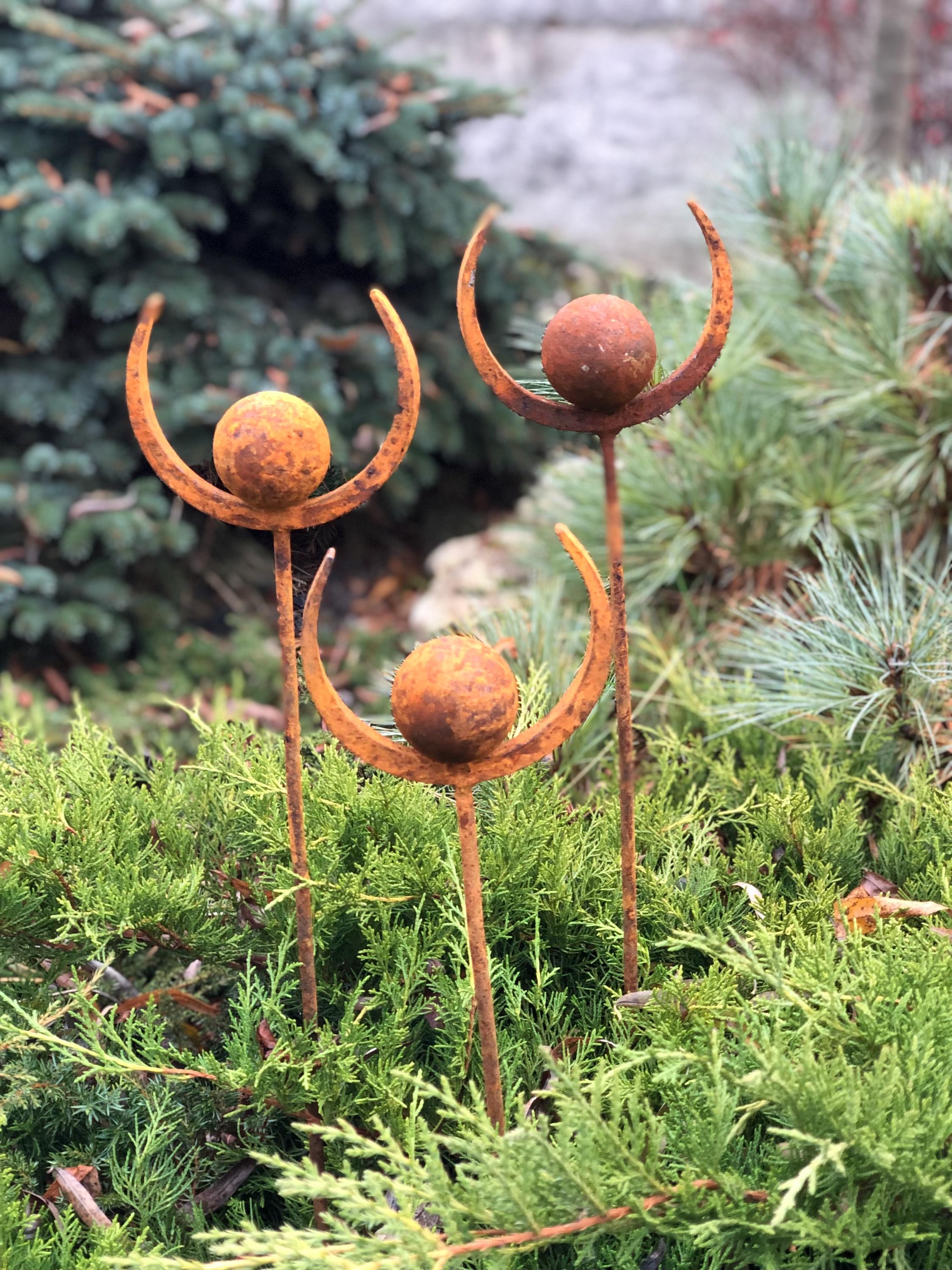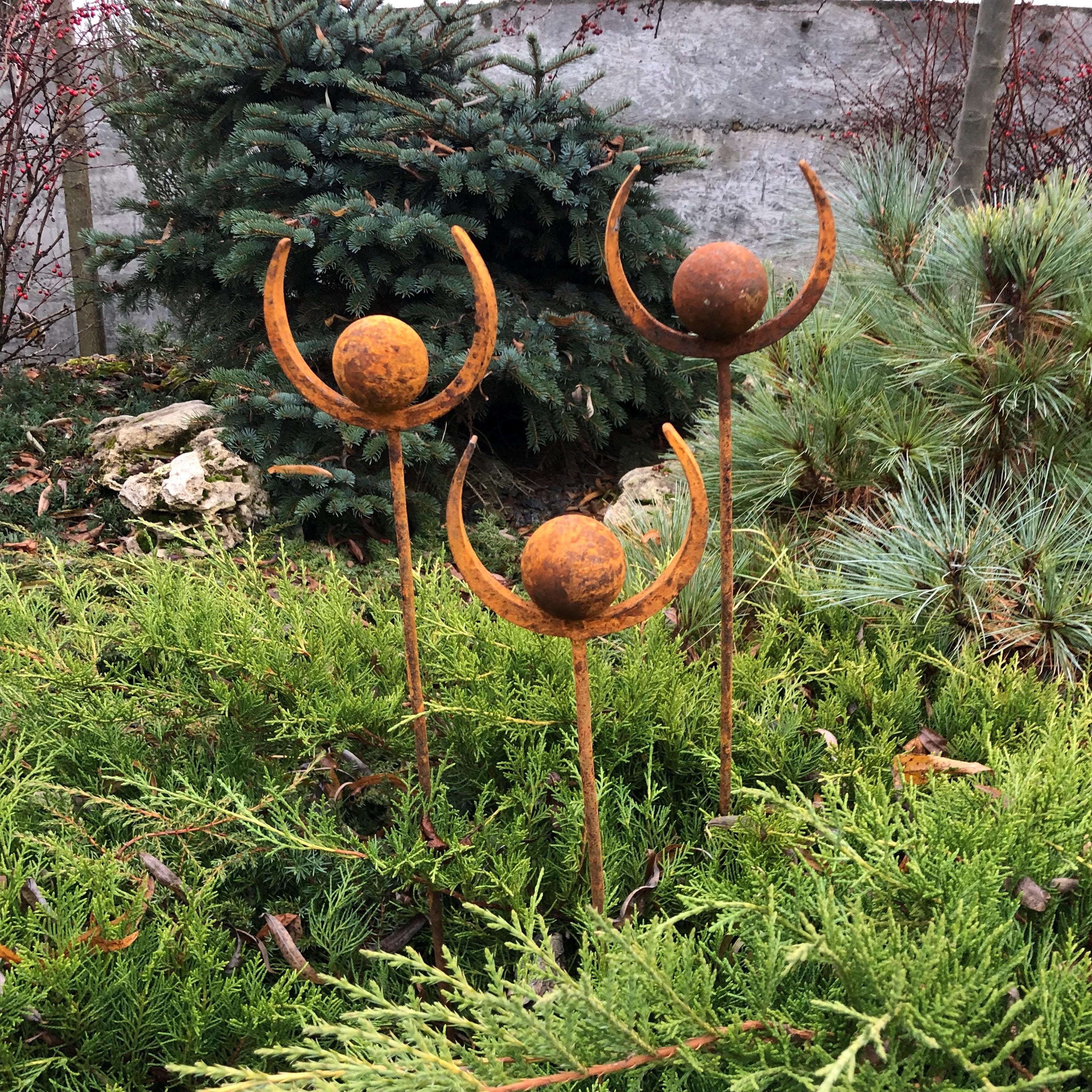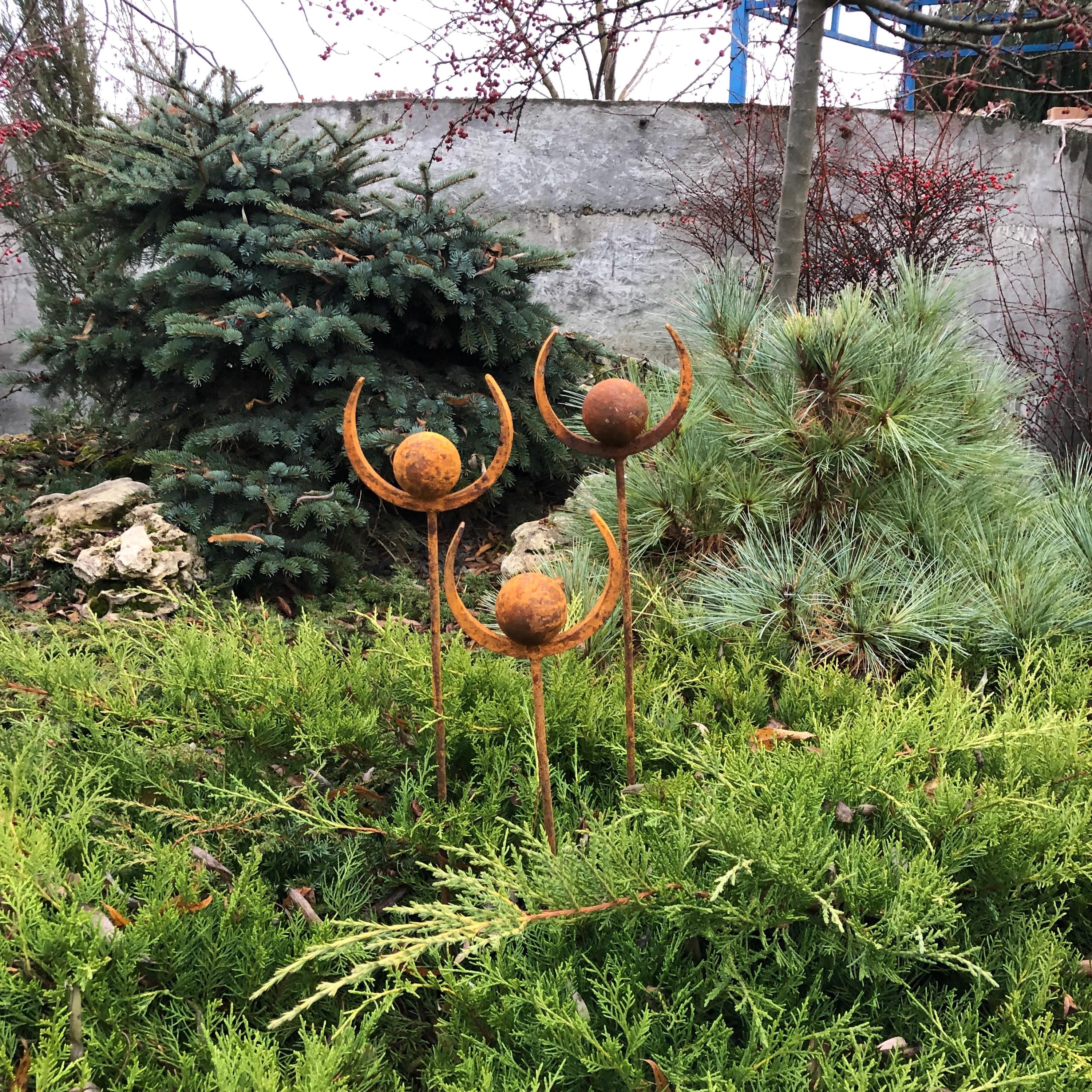 This Rustic metal garden finials set of 3 will place decorative accent in the garden compositions and landscape, create an atmosphere of romance and coziness in your home. This rusty metal art could be used as decoration at your home, in your garden, backyard, terrace or entrance to your home. This yard decor made from natural metal and it covered with a natural rust. This rusty garden decor can be used all year round, it is not afraid of precipitation, direct sunlight, etc.