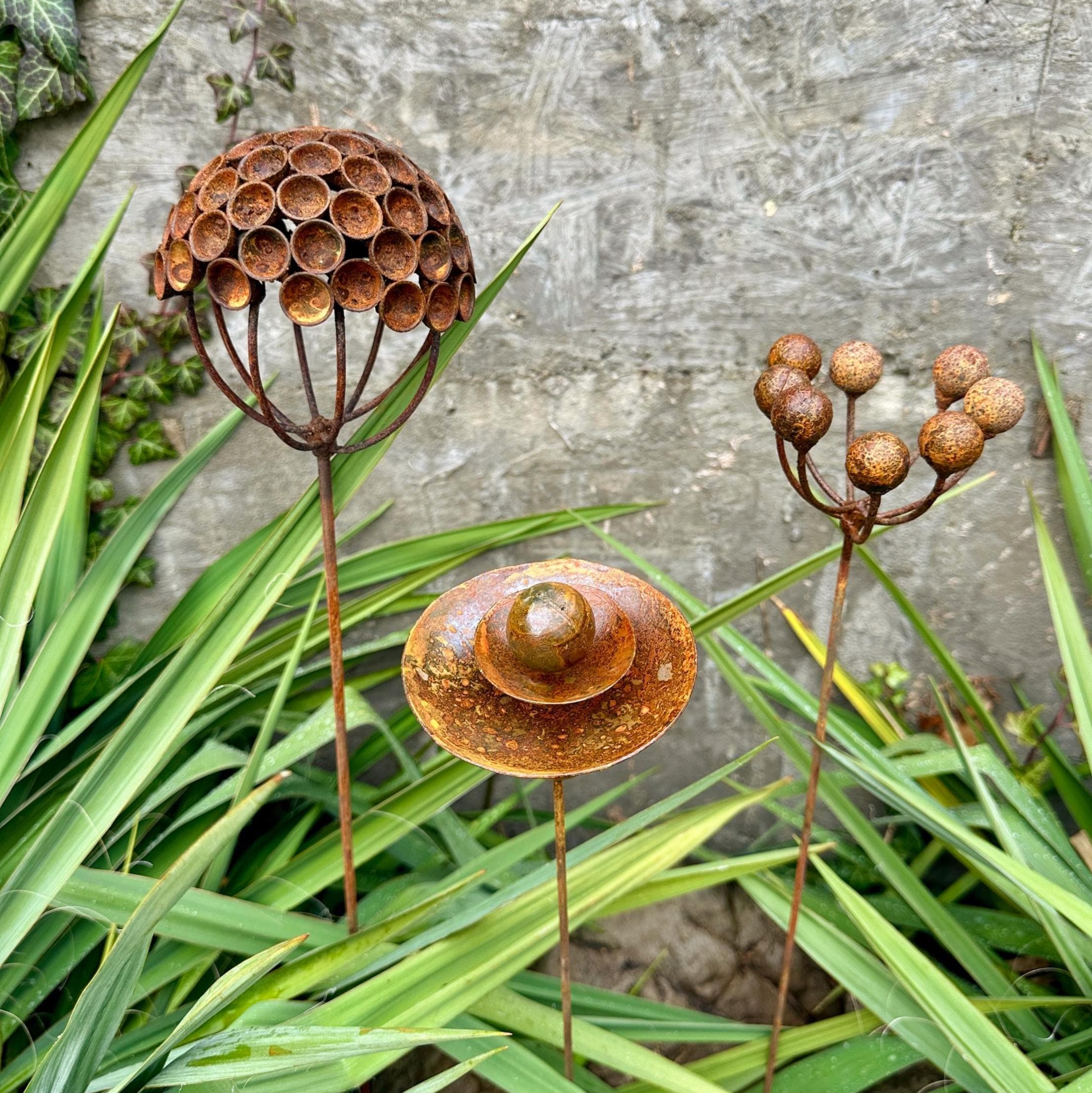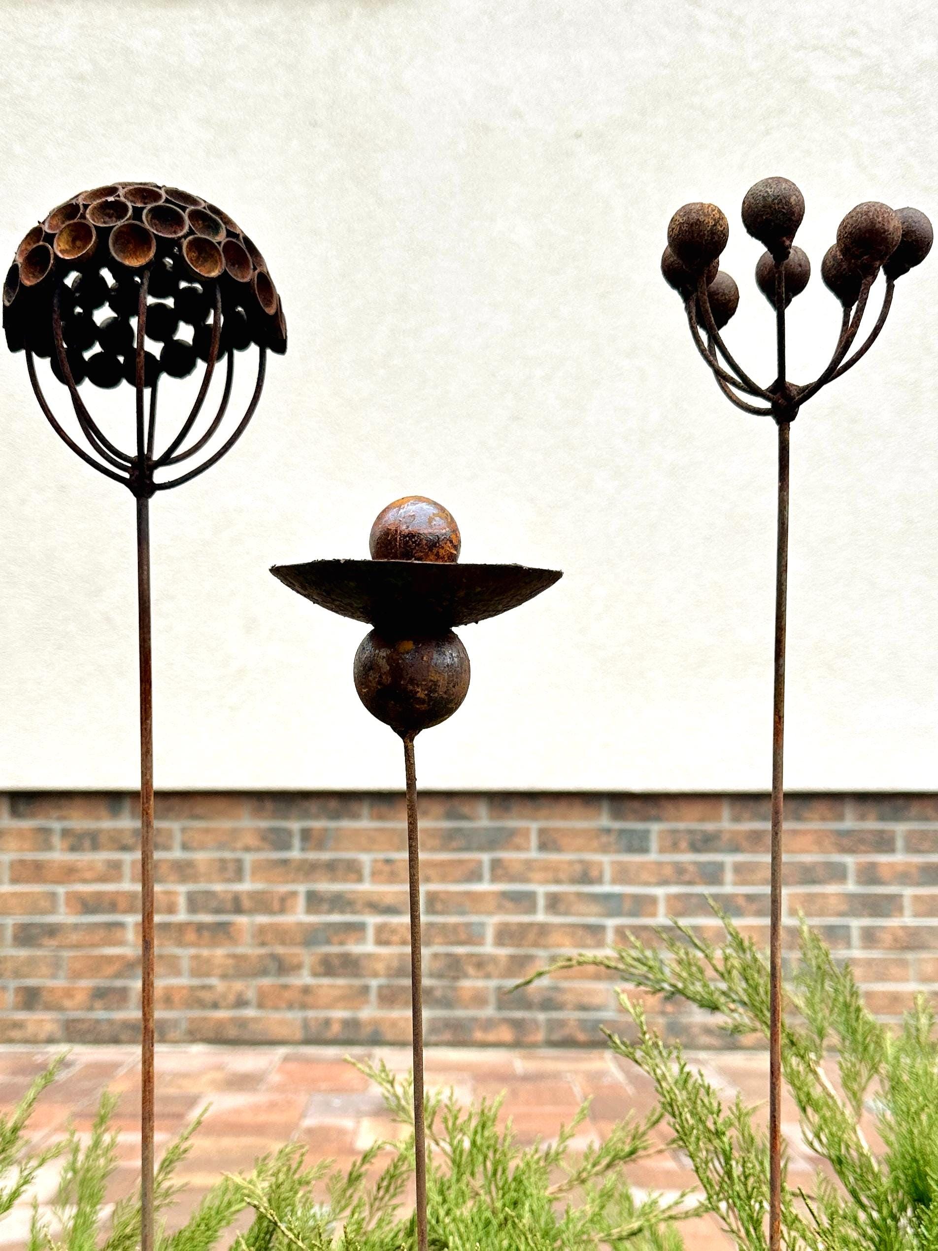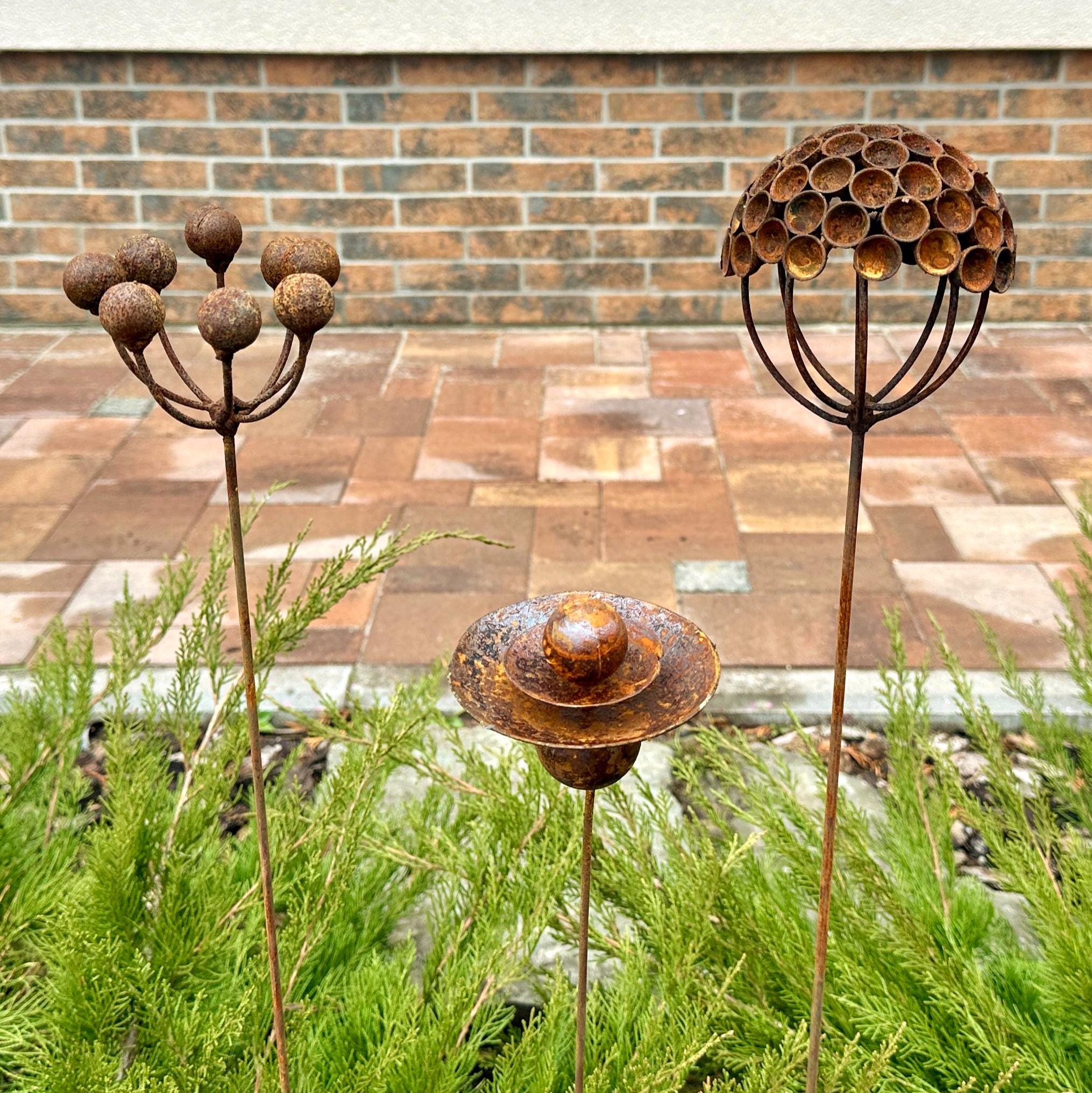 Bring a touch of the unexpected to your garden with this set of three handcrafted rustic metal exotic flowers. These unique sculptures add an artistic and eye-catching element to your landscaping, flower beds, or patio décor.
