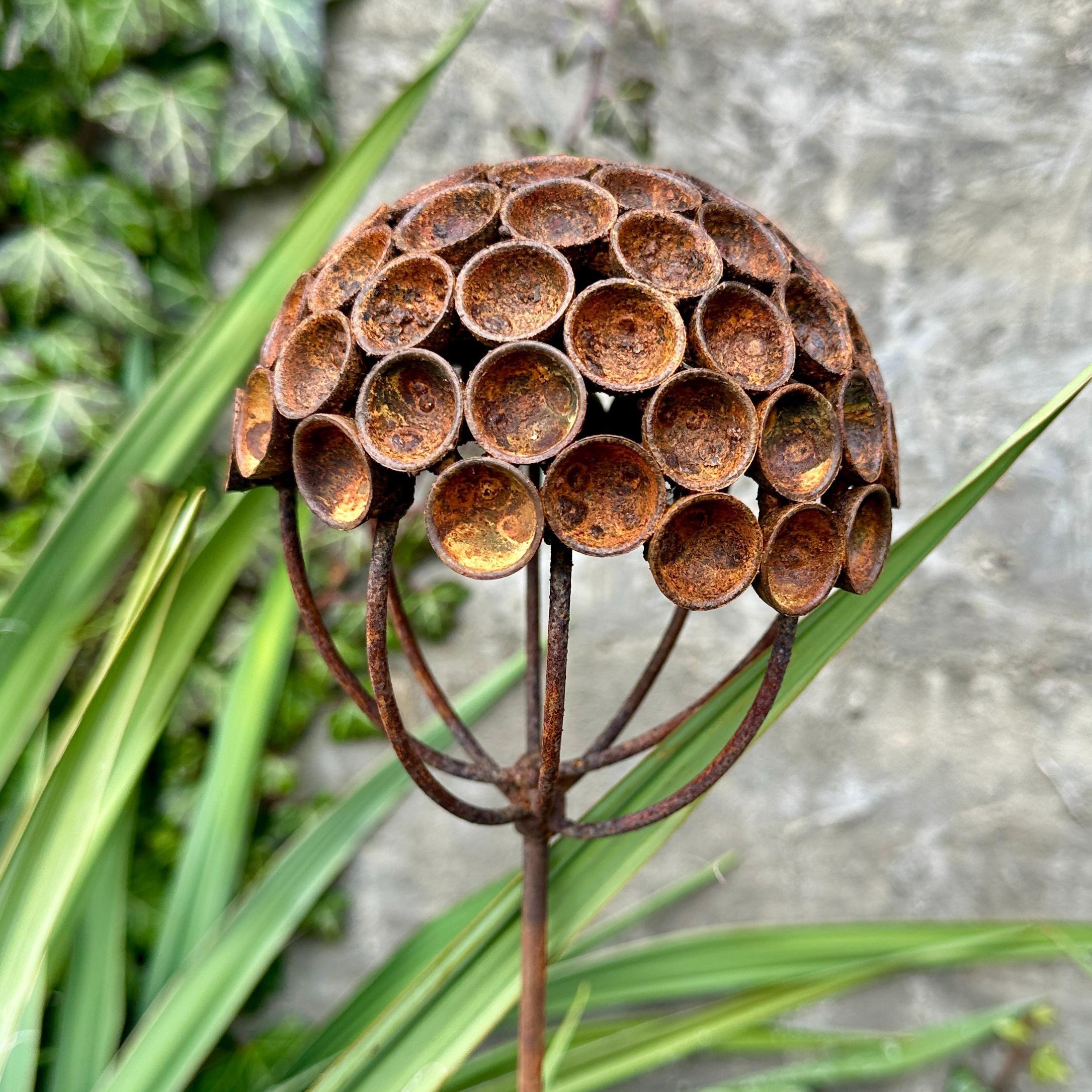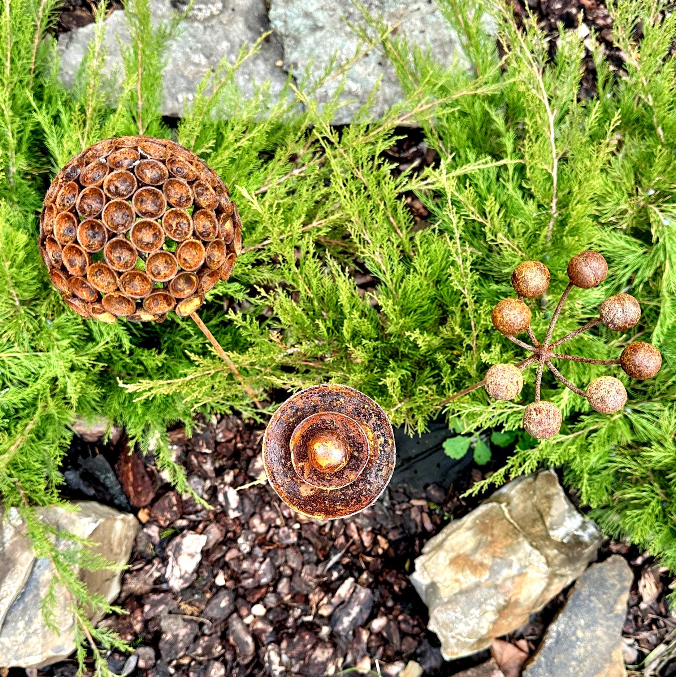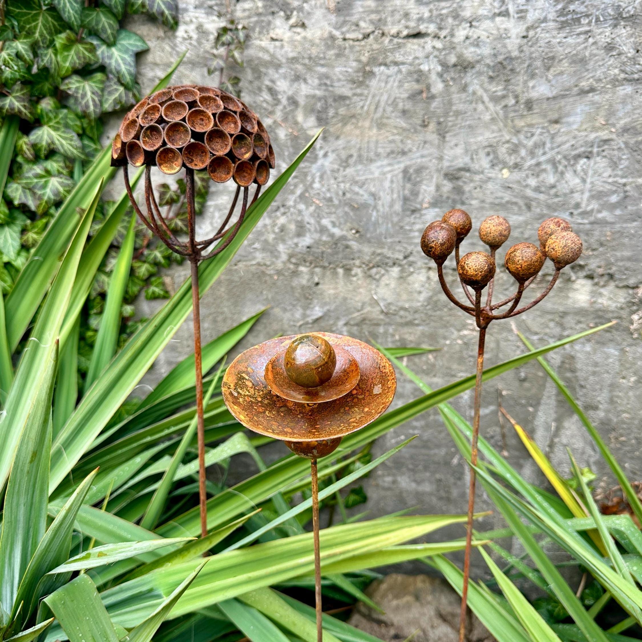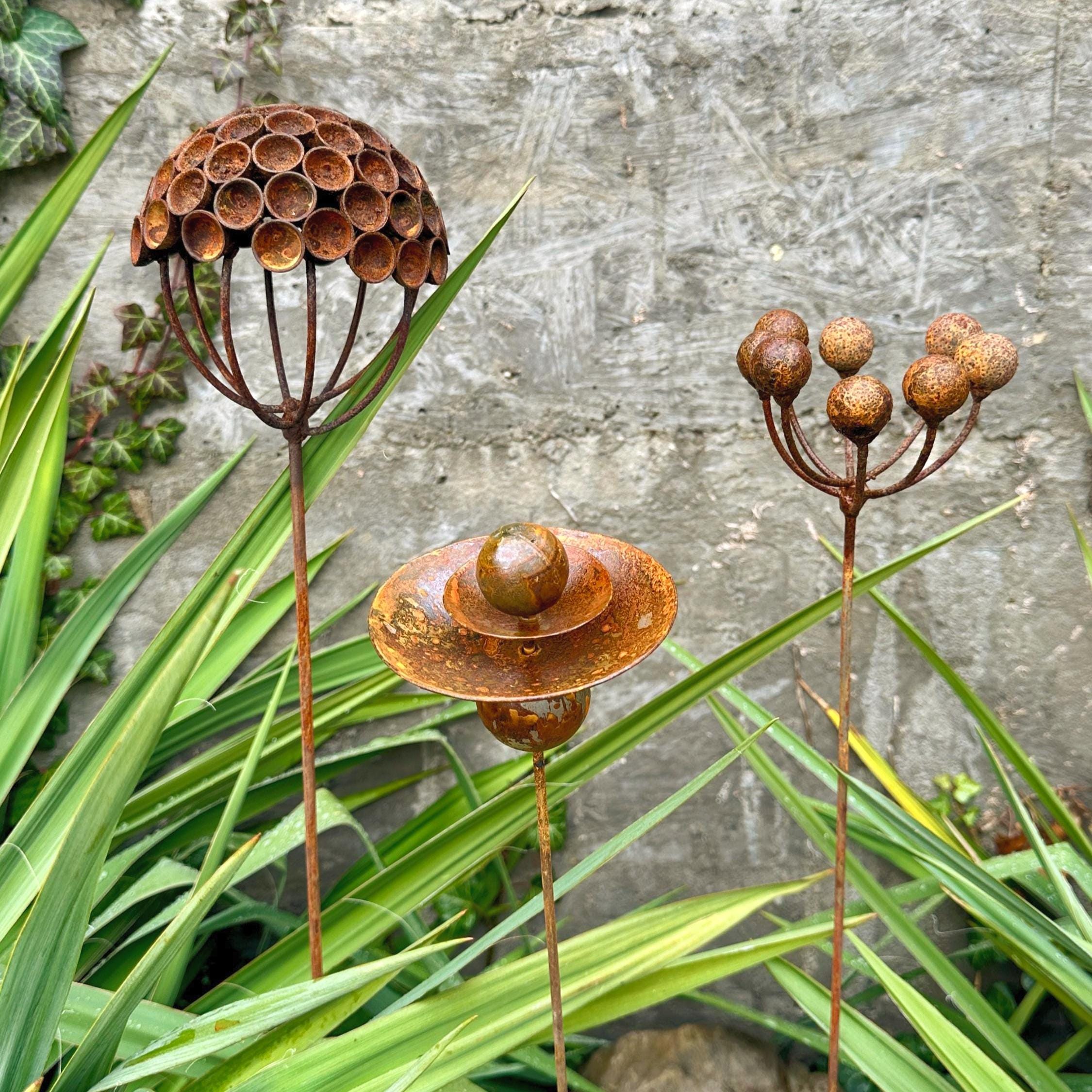 Bring a touch of the unexpected to your garden with this set of three handcrafted rustic metal exotic flowers. These unique sculptures add an artistic and eye-catching element to your landscaping, flower beds, or patio décor.