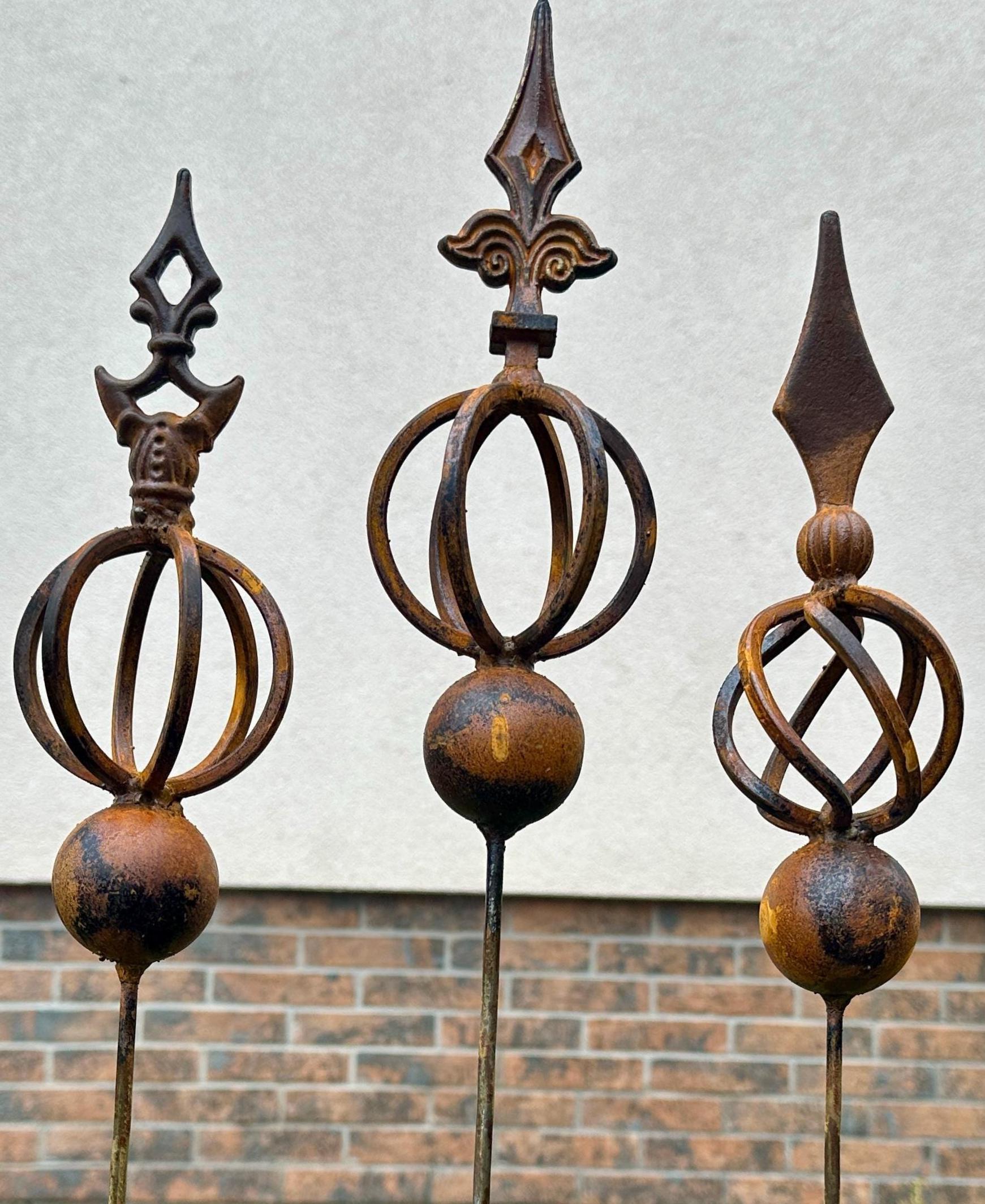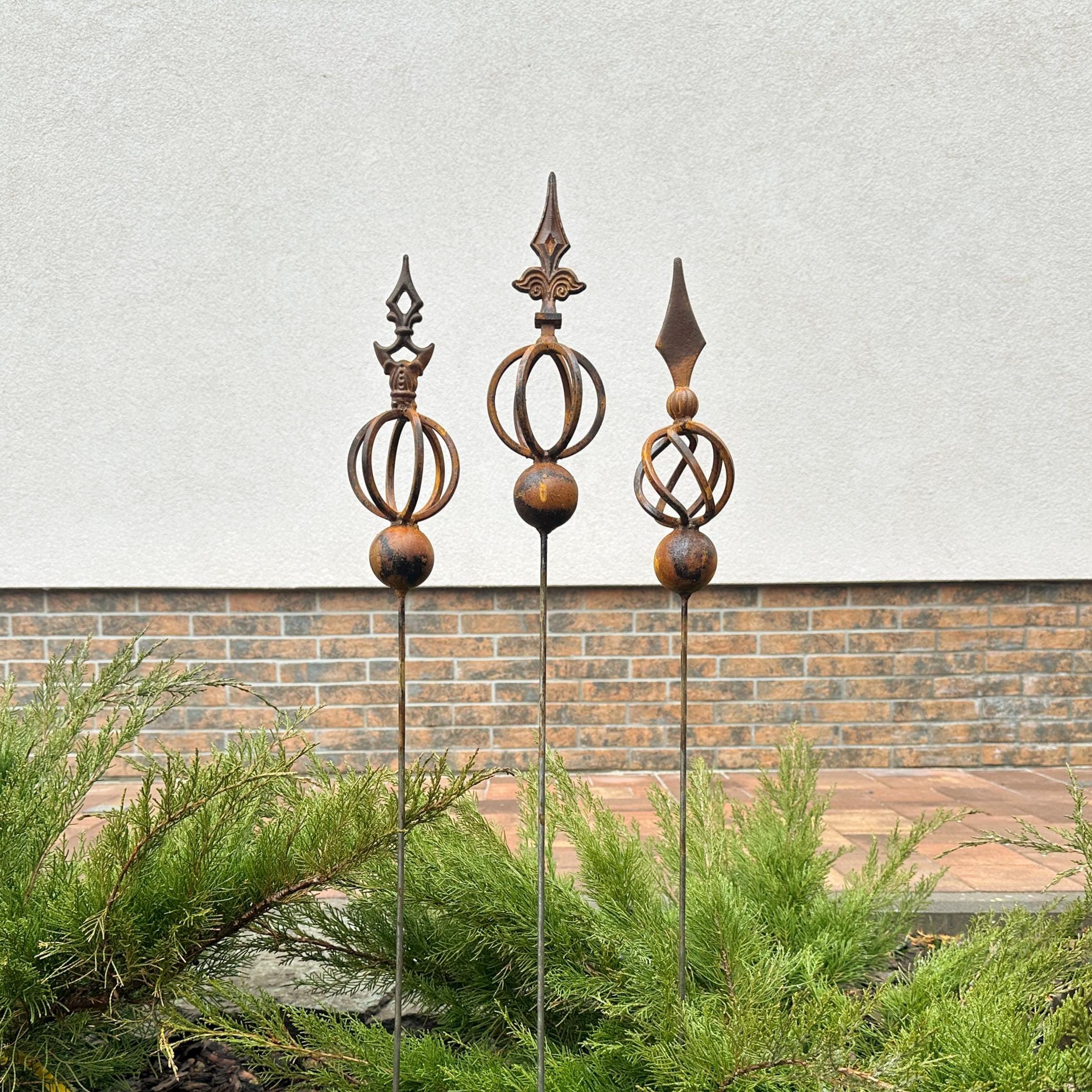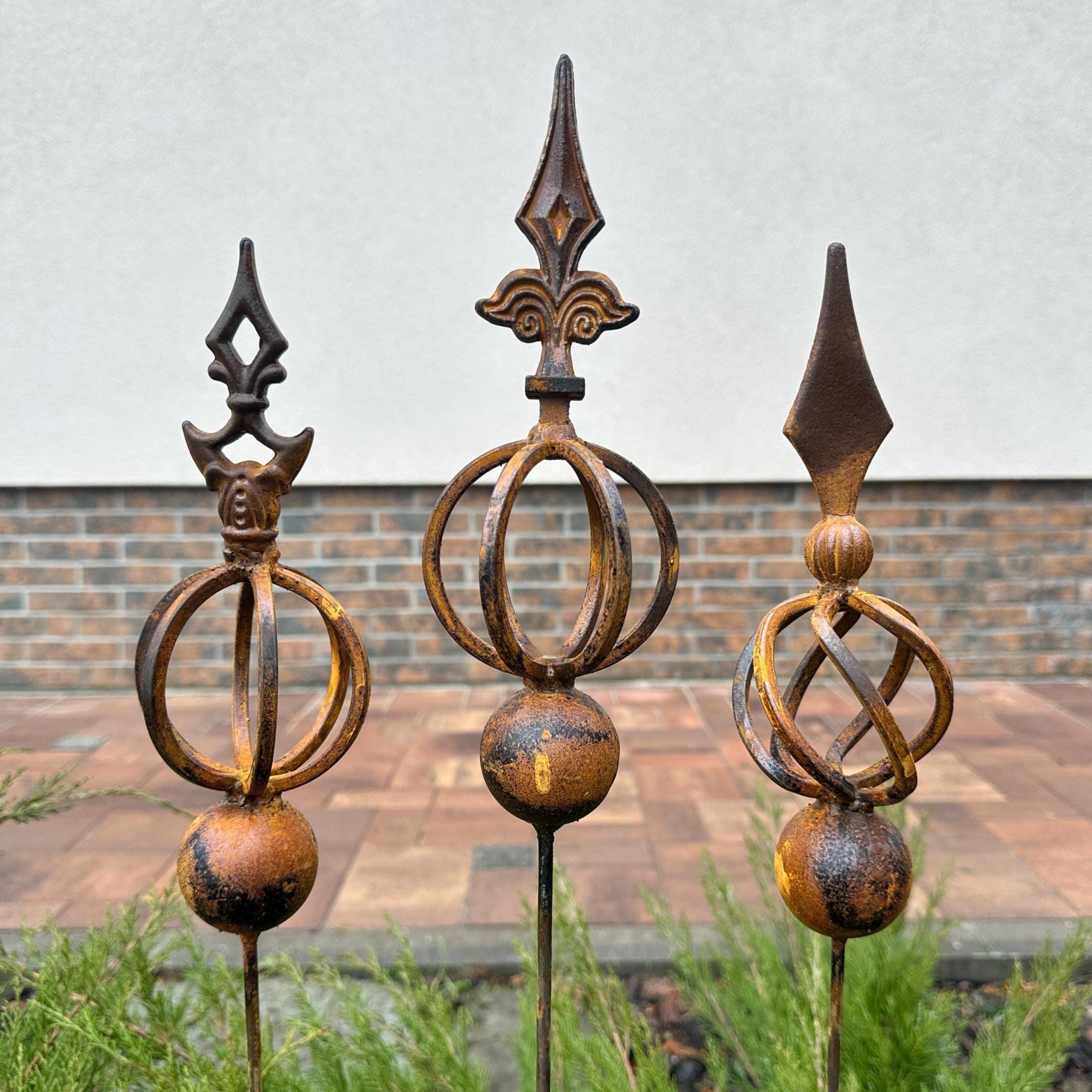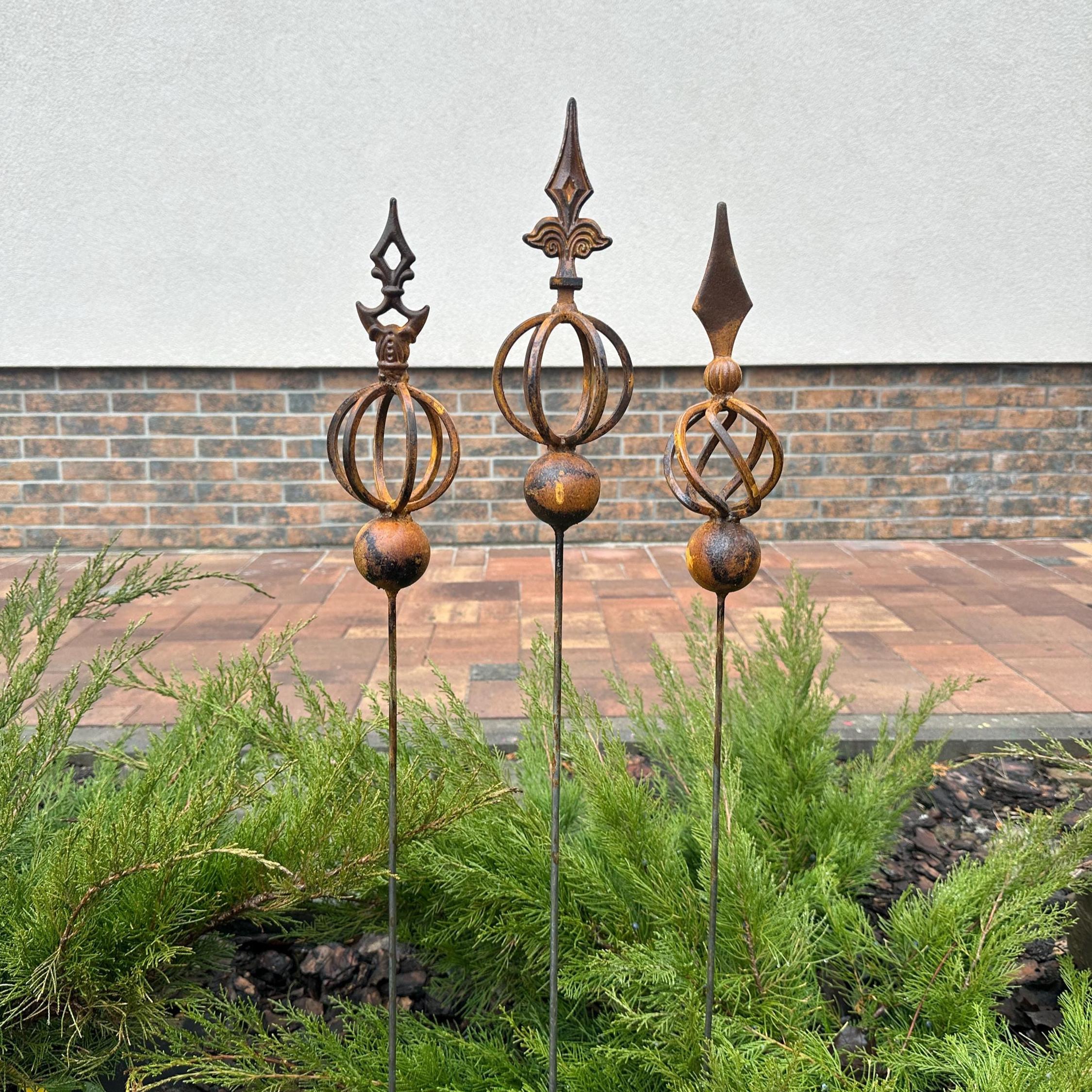 This Rustic metal garden finial set of 3 will place decorative accent in the garden compositions and landscape, create an atmosphere of romance and coziness in your home. This rusty metal art could be used as decoration at your home, in your garden, backyard, terrace or entrance to your home. This yard decor made from natural metal and it covered with a natural rust. This rusty garden decor can be used all year round, it is not afraid of precipitation, direct sunlight, etc.