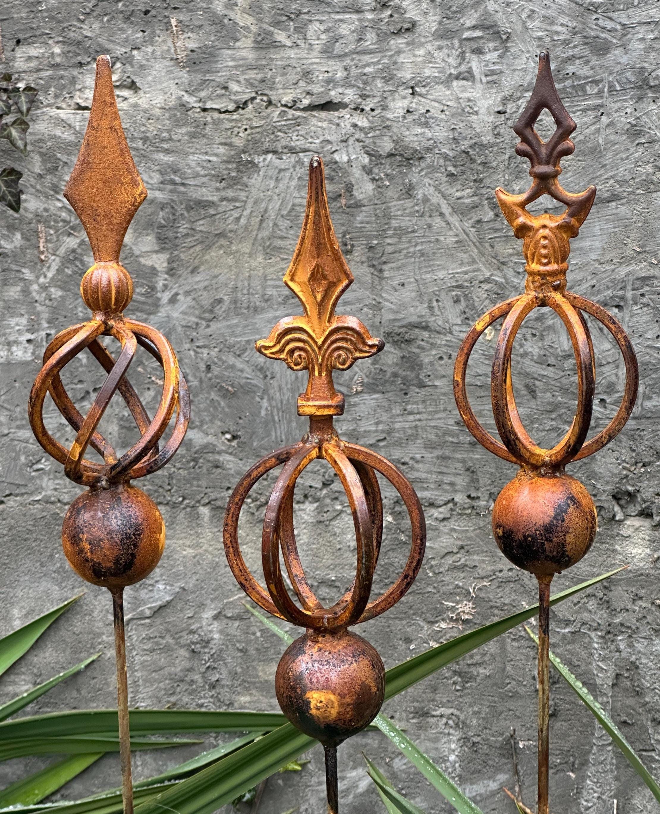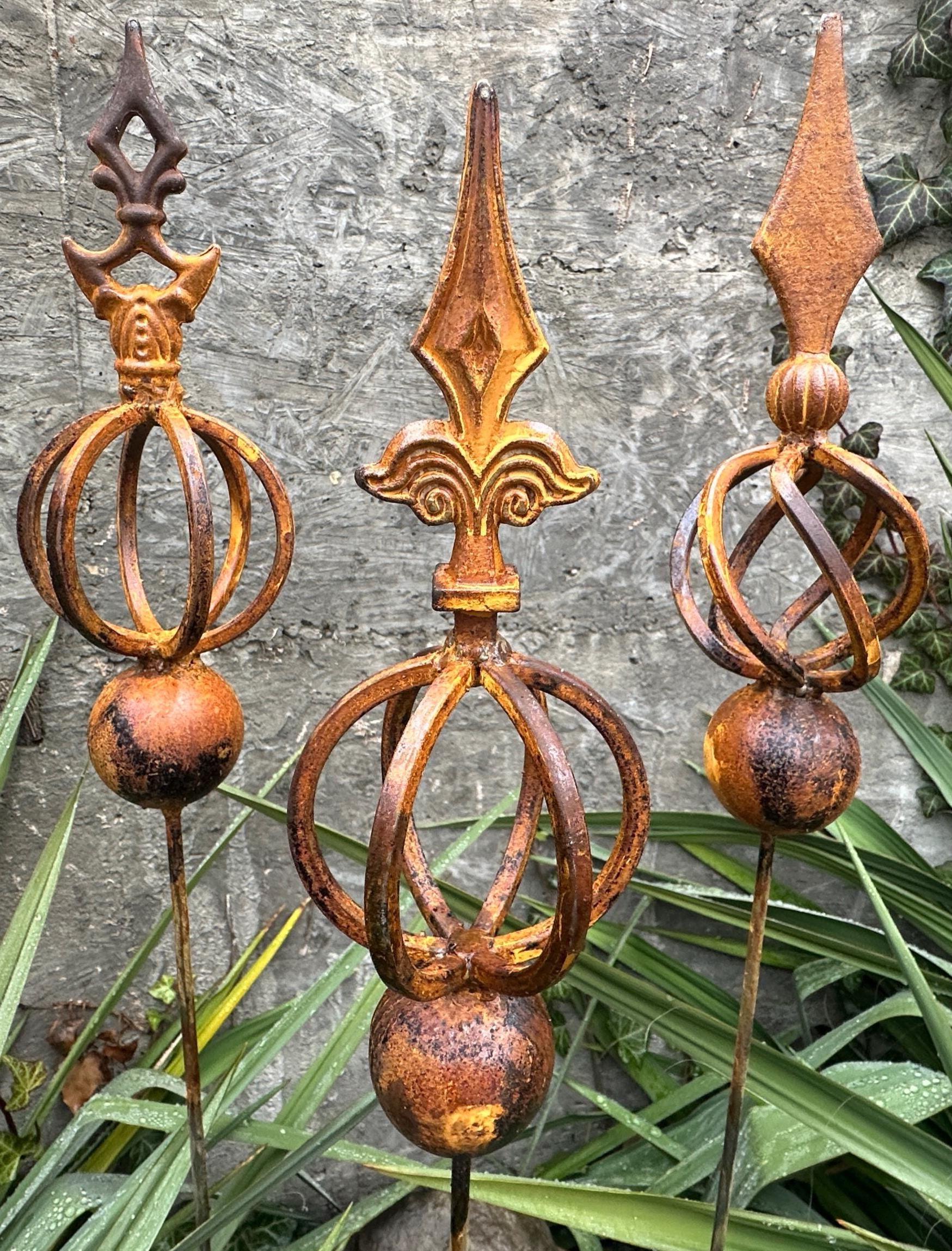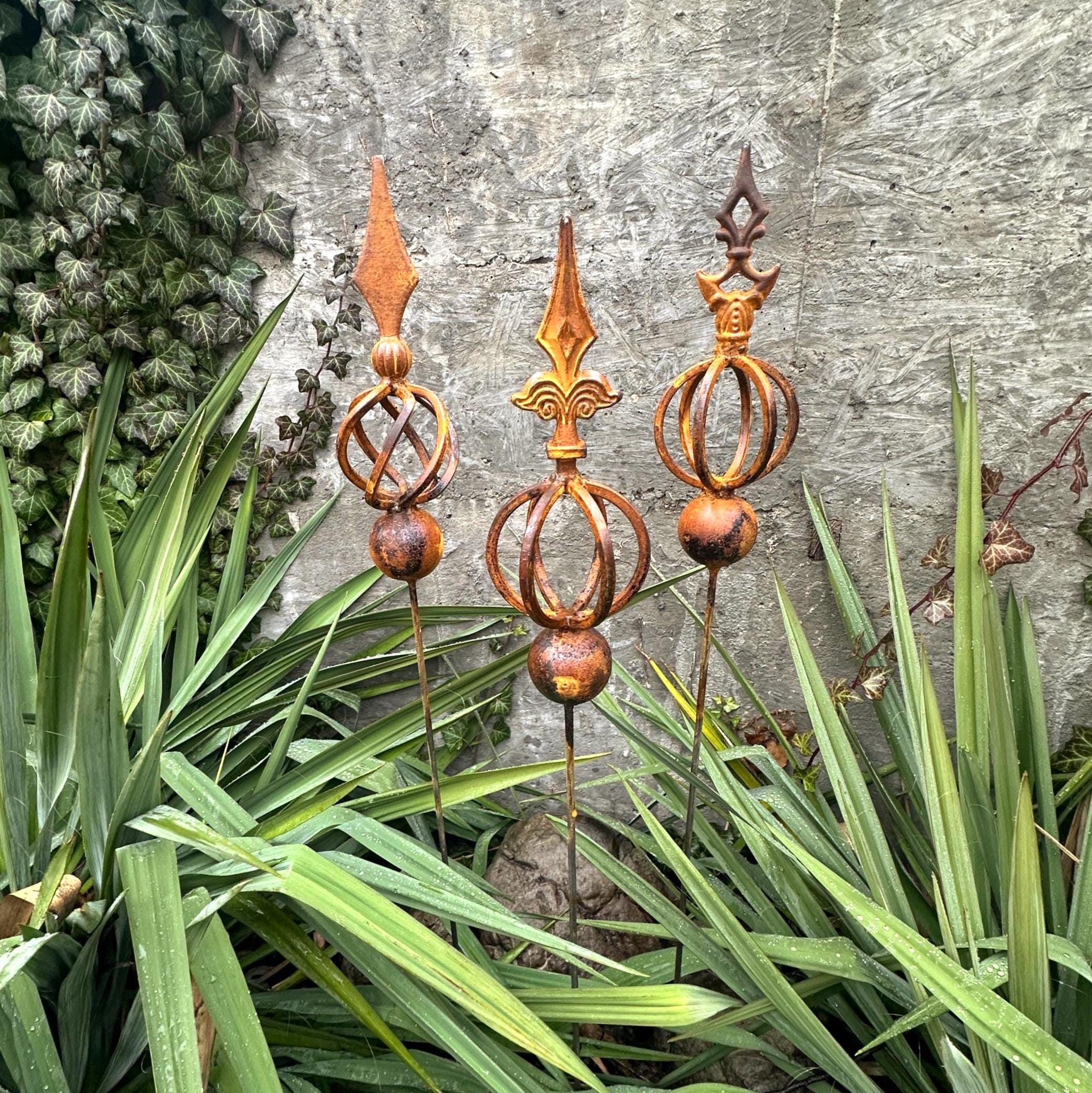 This garden stakes set consists of 3 rusty metal finials each is about 34” (85 cm) high.