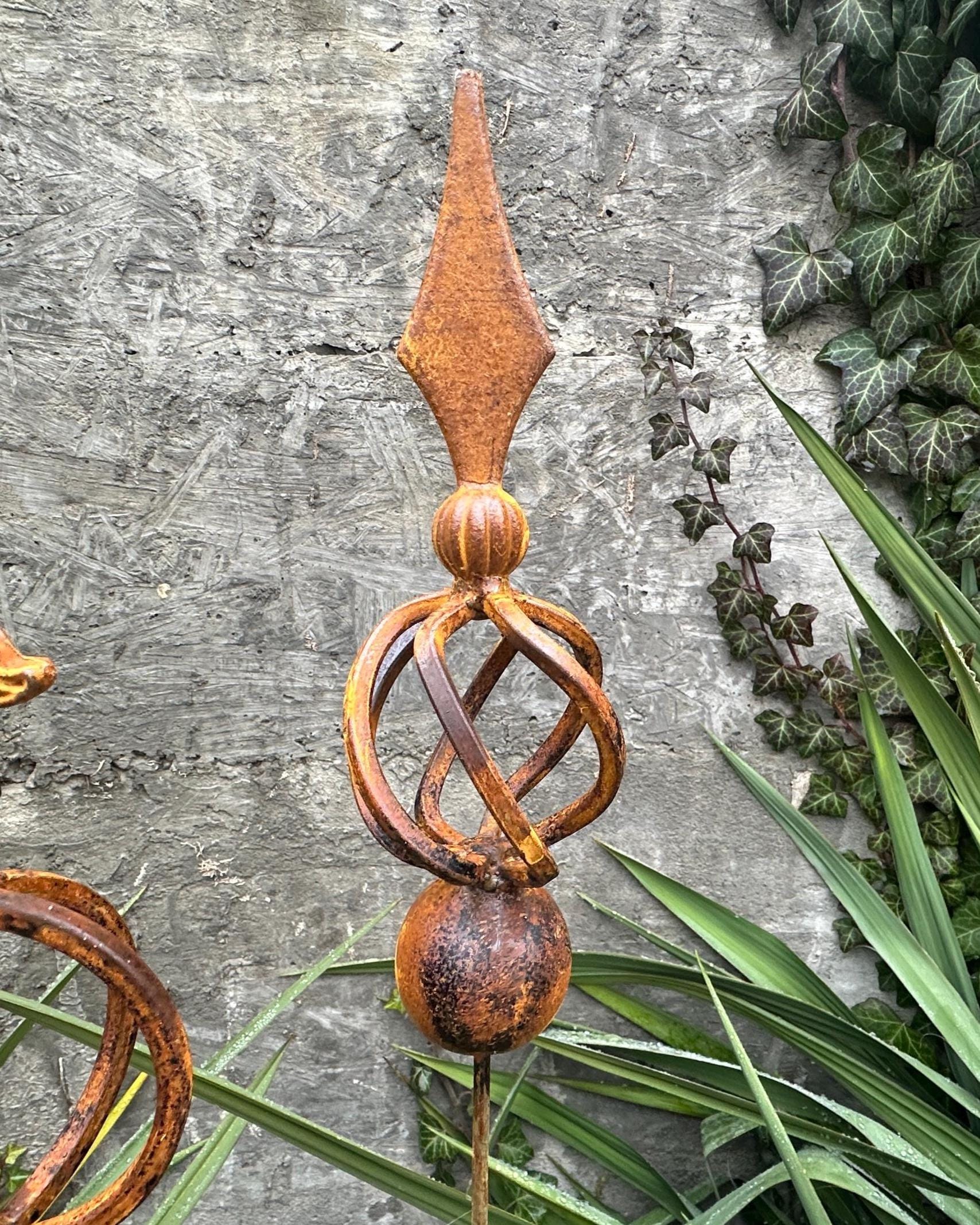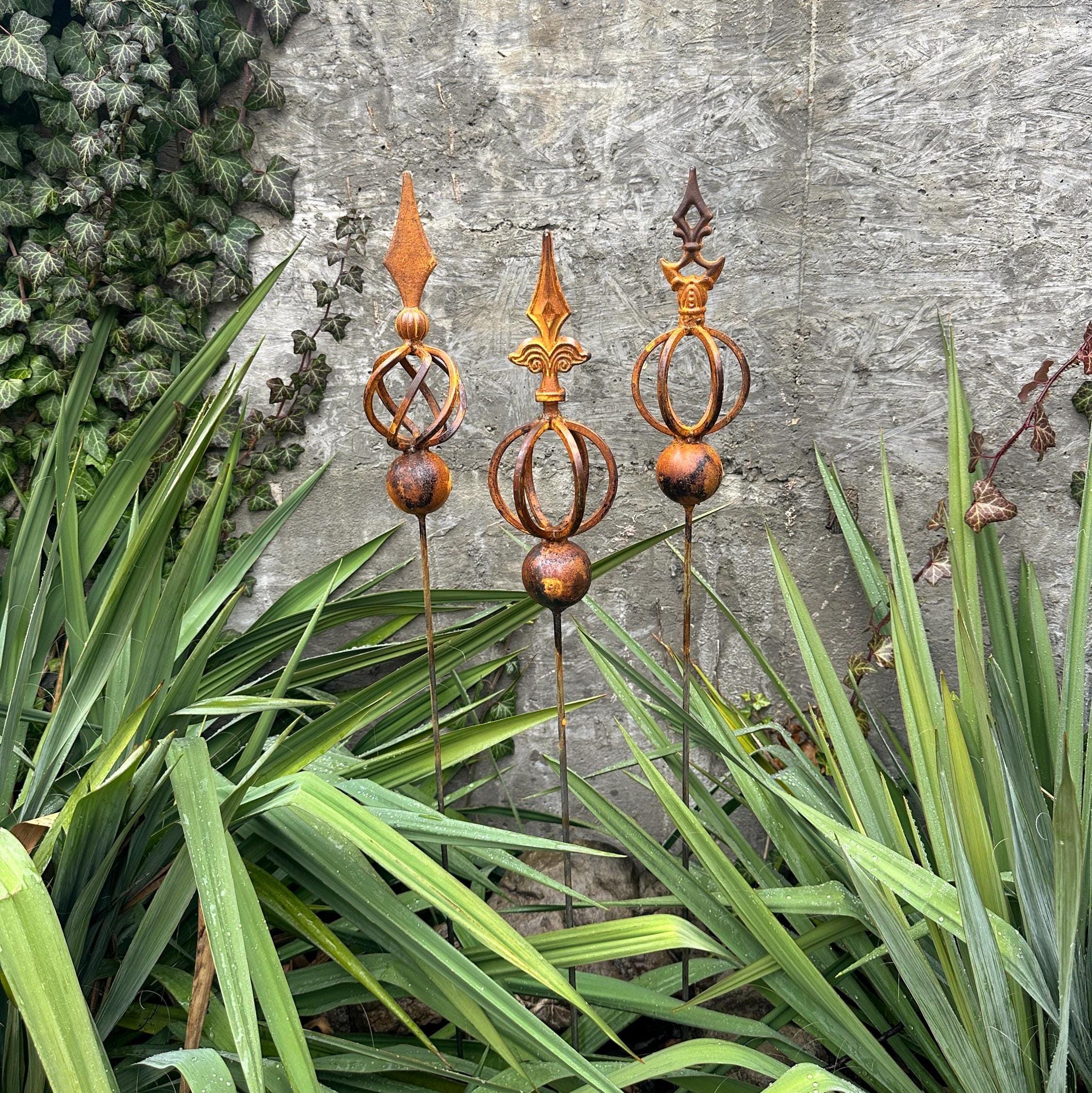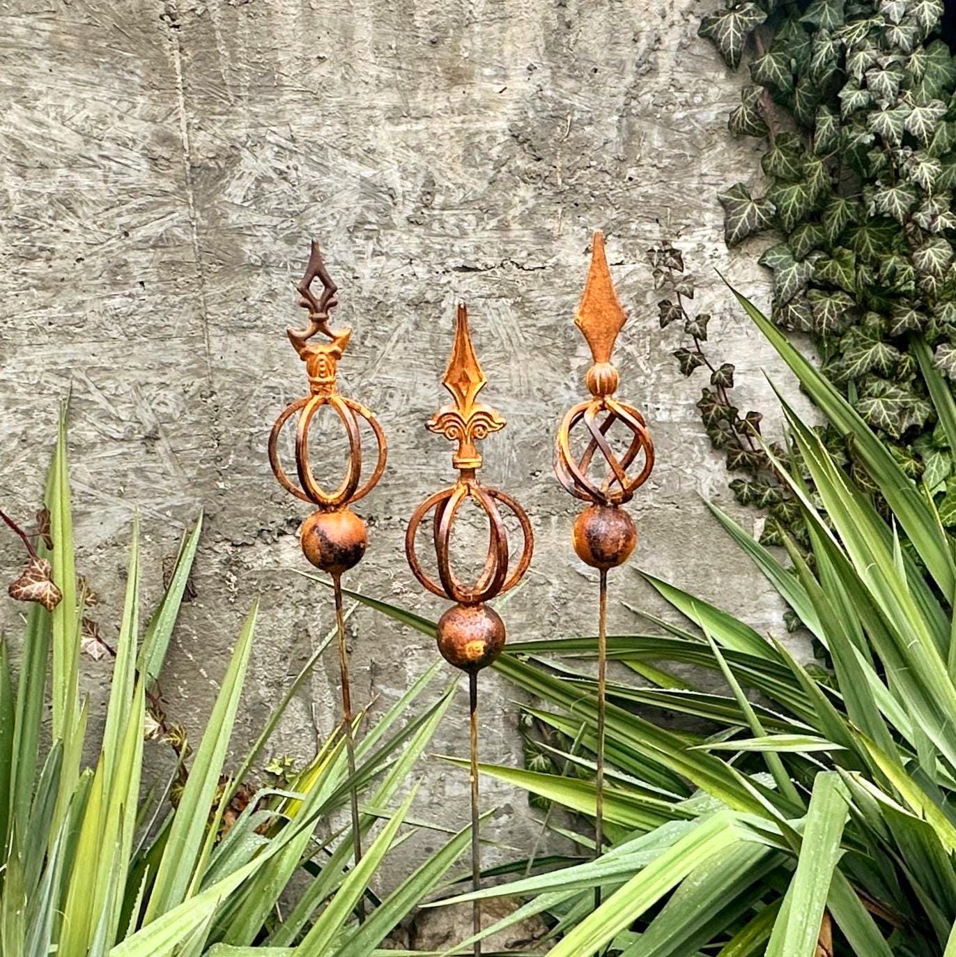 This garden stakes set consists of 3 rusty metal finials each is about 34” (85 cm) high.