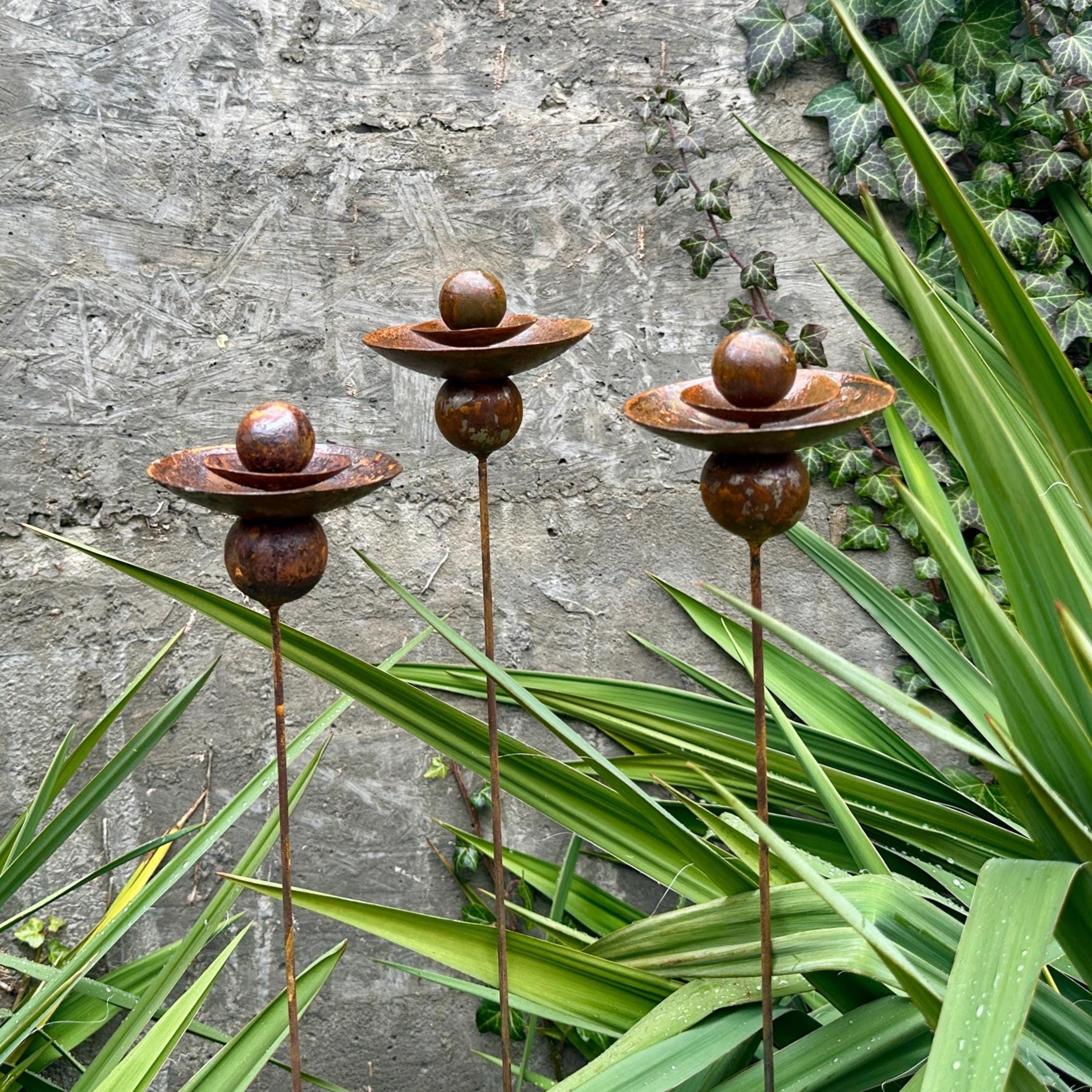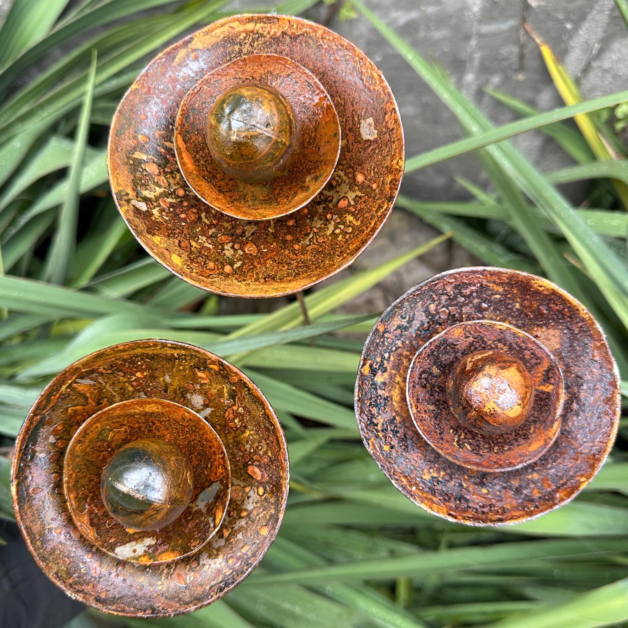 Three (3) handcrafted metal flowers with a natural rust finish.