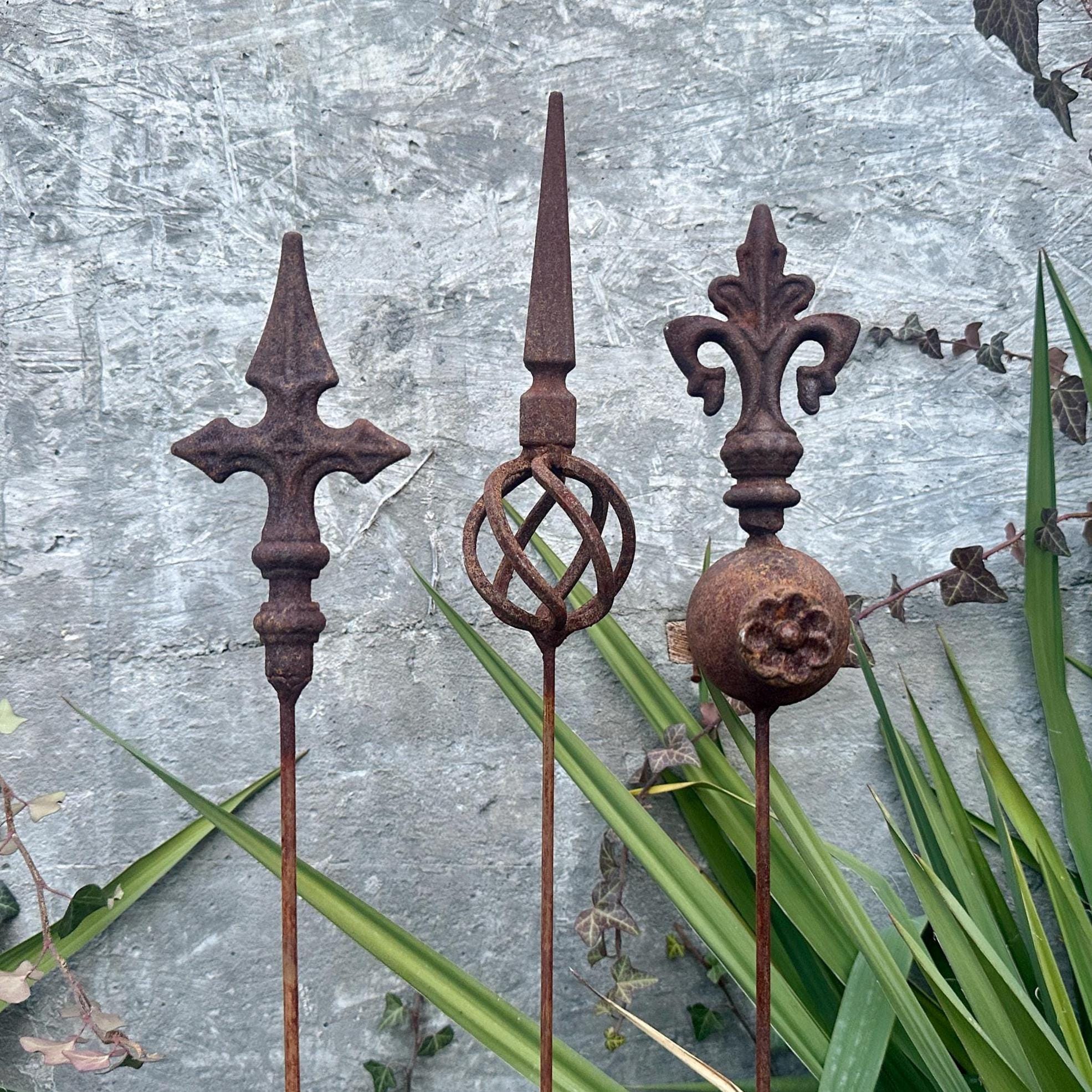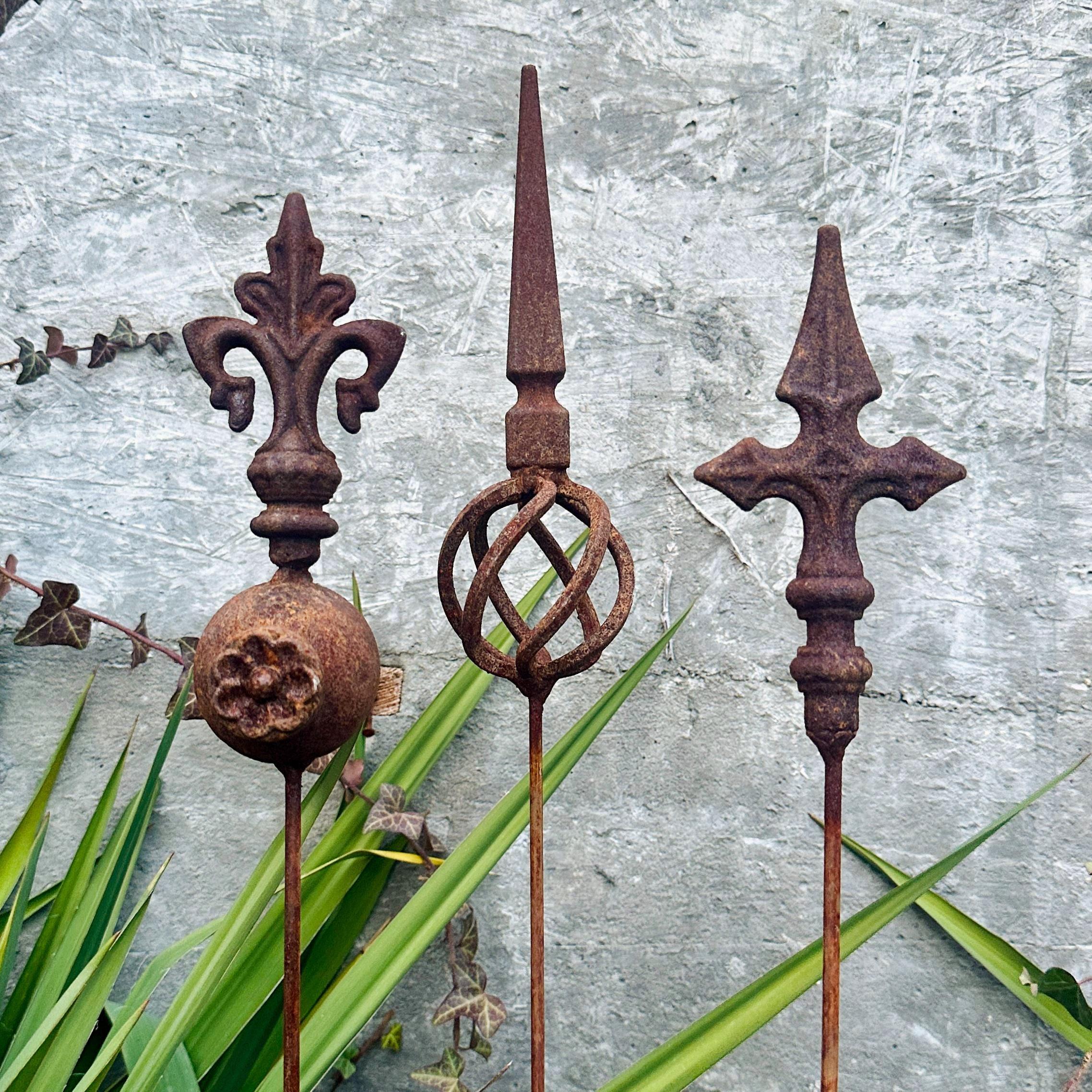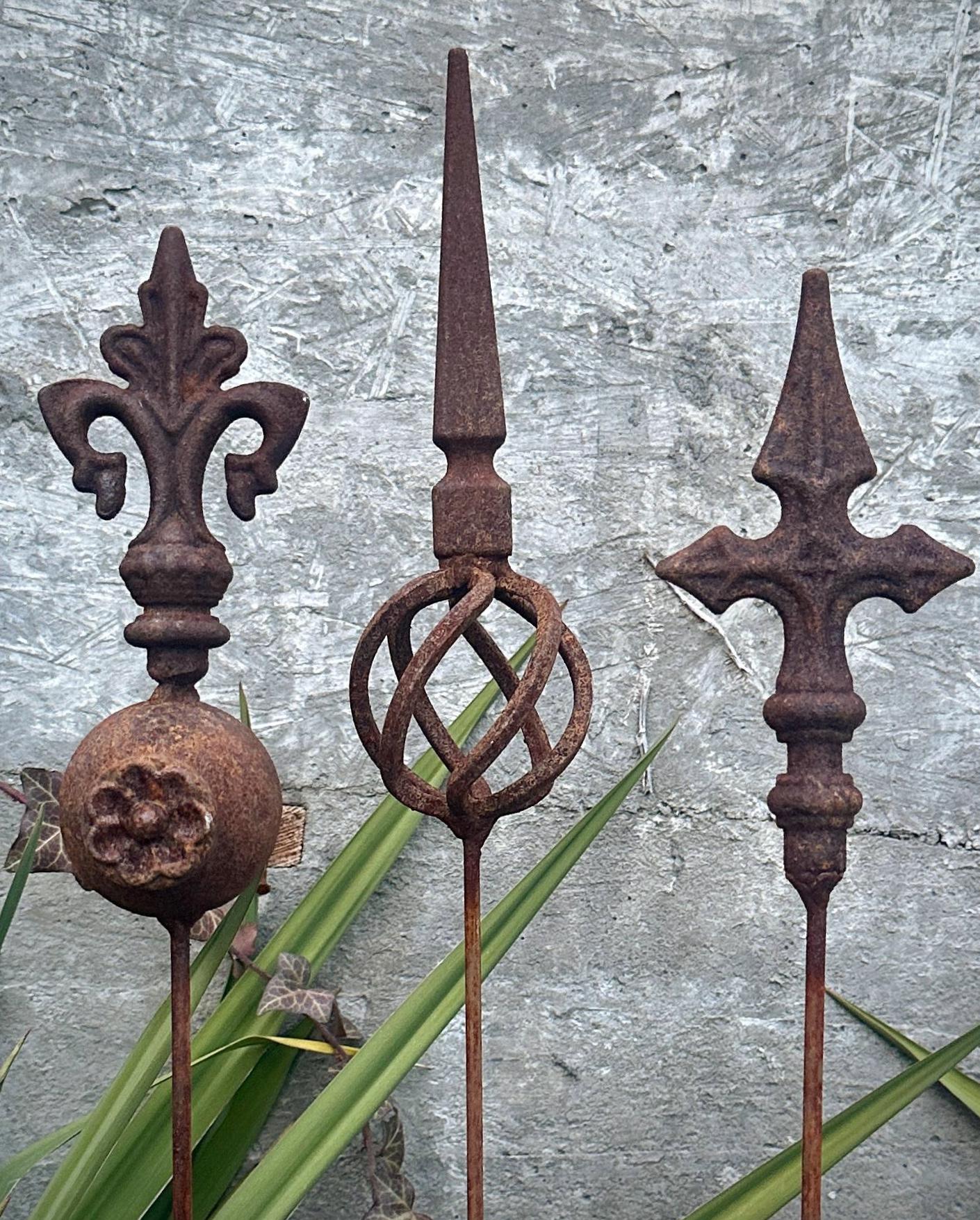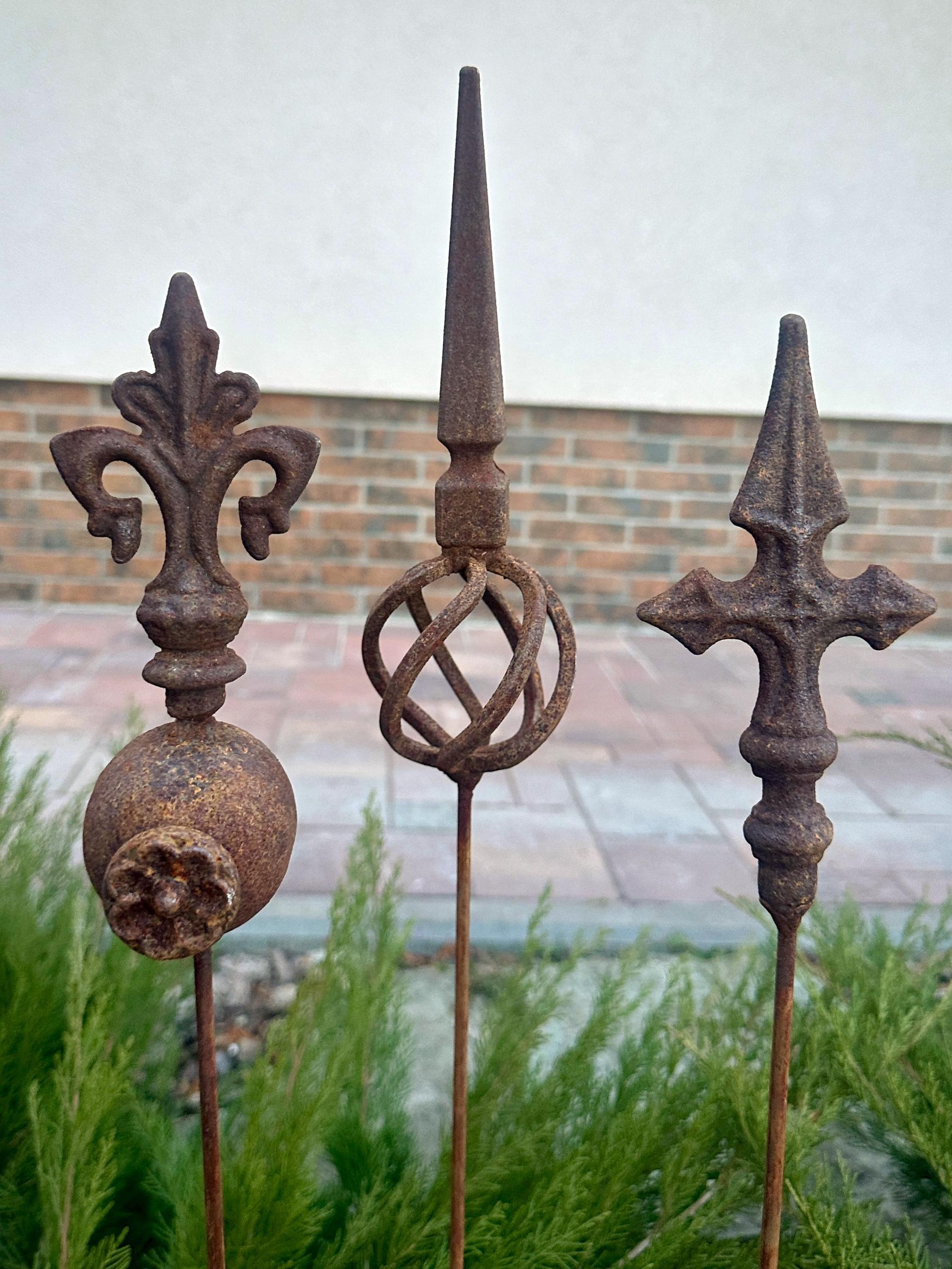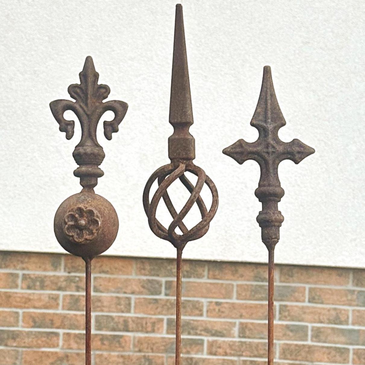 Transform your outdoor space with this set of 3 antique-inspired garden stakes, designed to add a touch of timeless elegance to your garden. Each piece features intricate detailing and a unique natural rusty patina, giving it an authentic aged look.