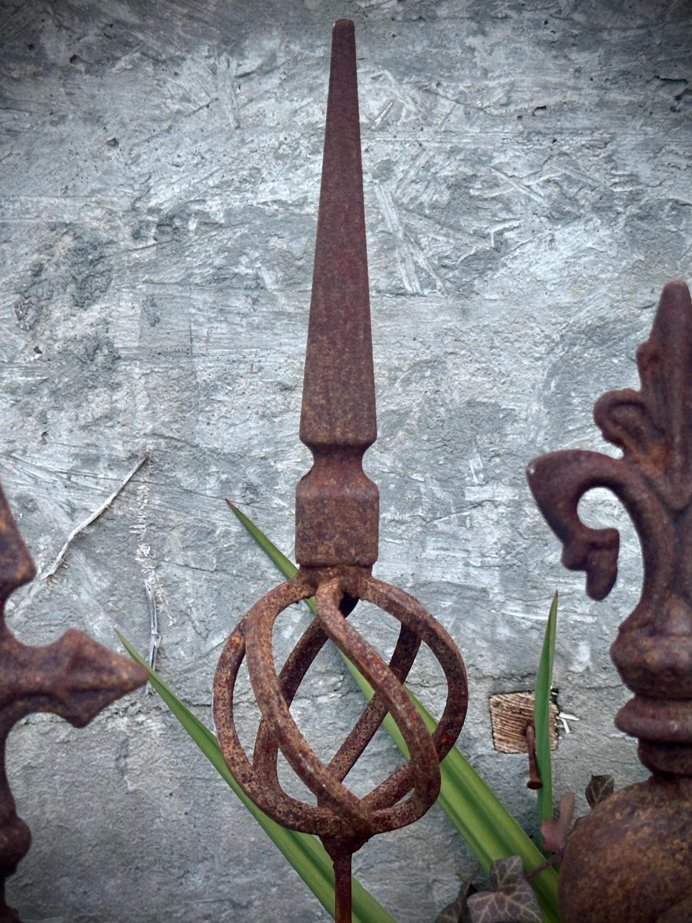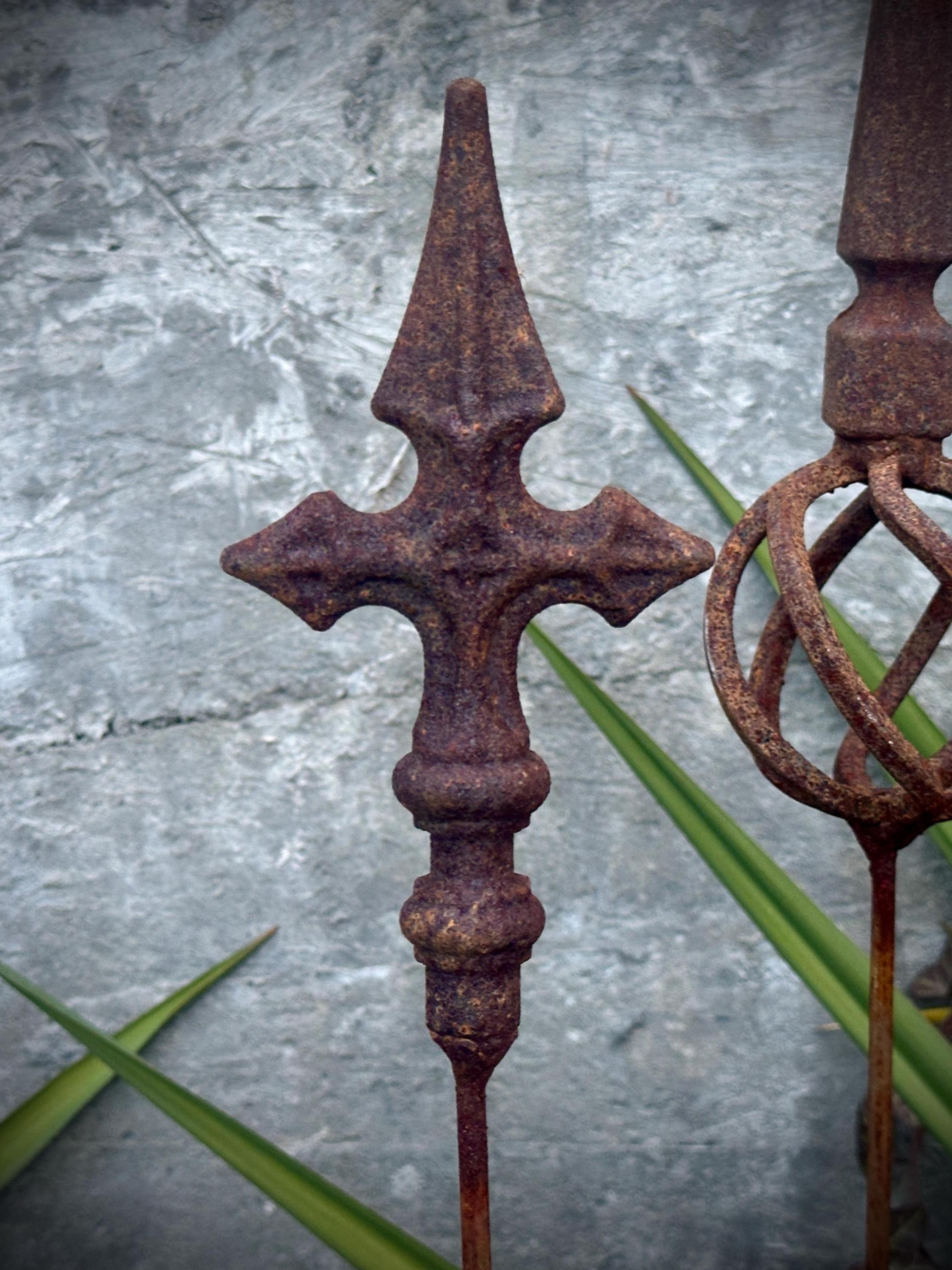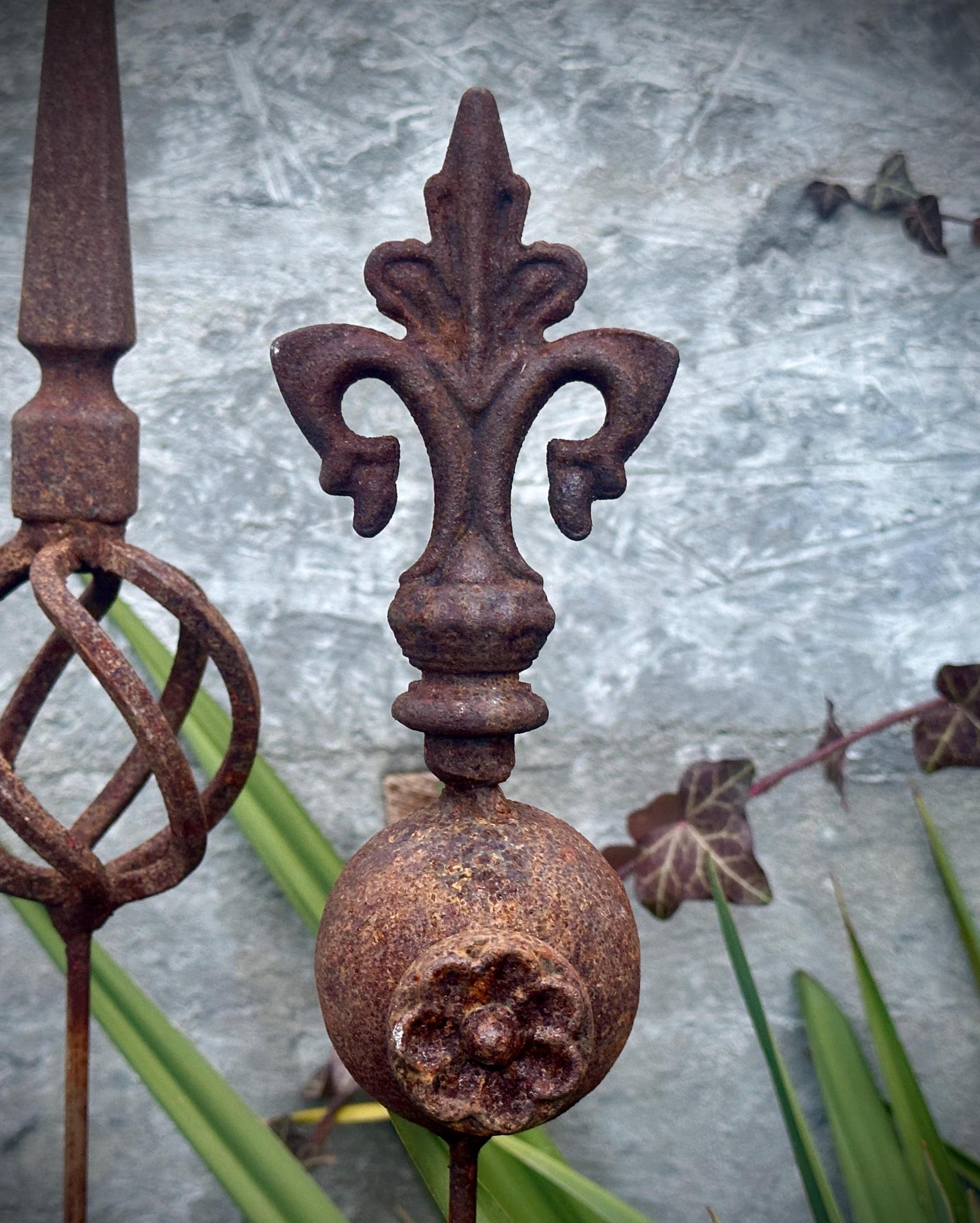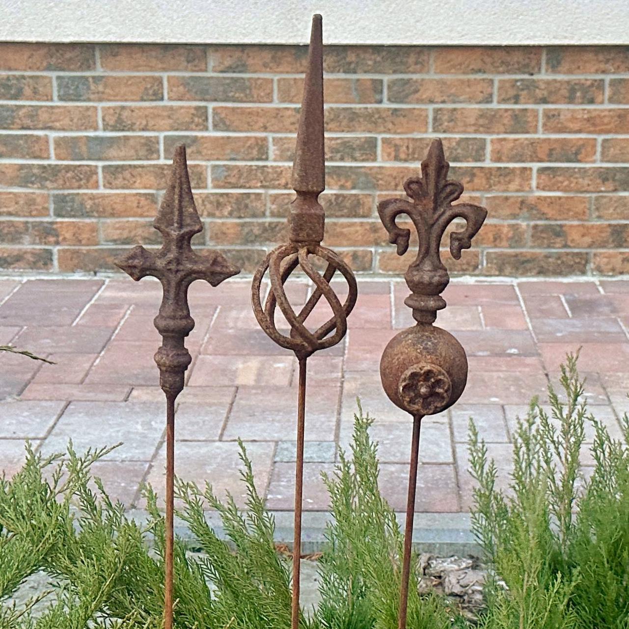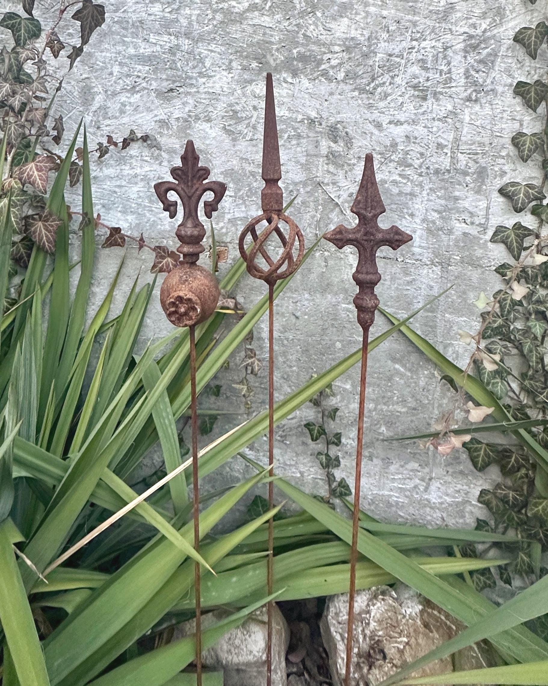 Transform your outdoor space with this set of 3 antique-inspired garden stakes, designed to add a touch of timeless elegance to your garden. Each piece features intricate detailing and a unique natural rusty patina, giving it an authentic aged look.