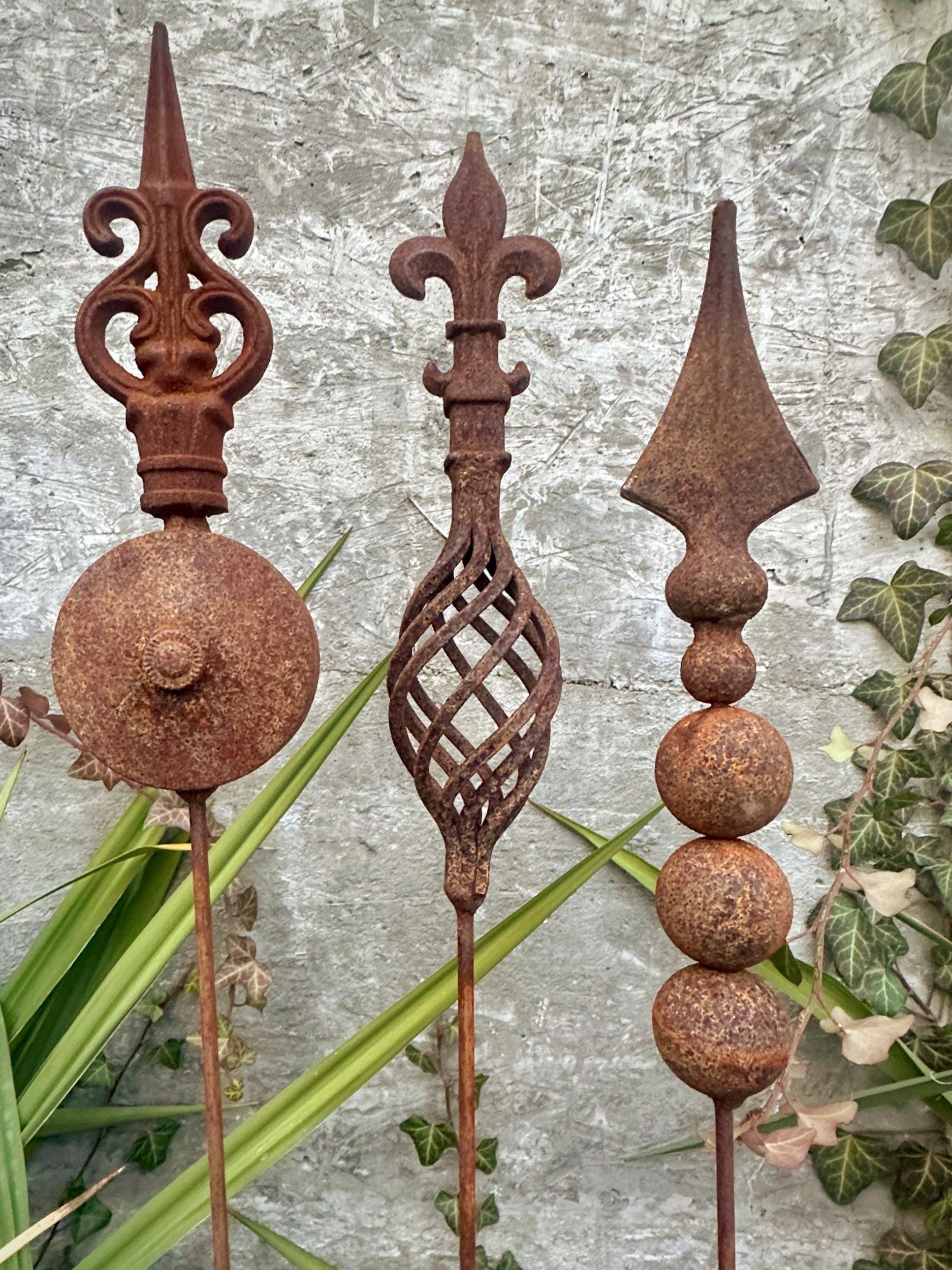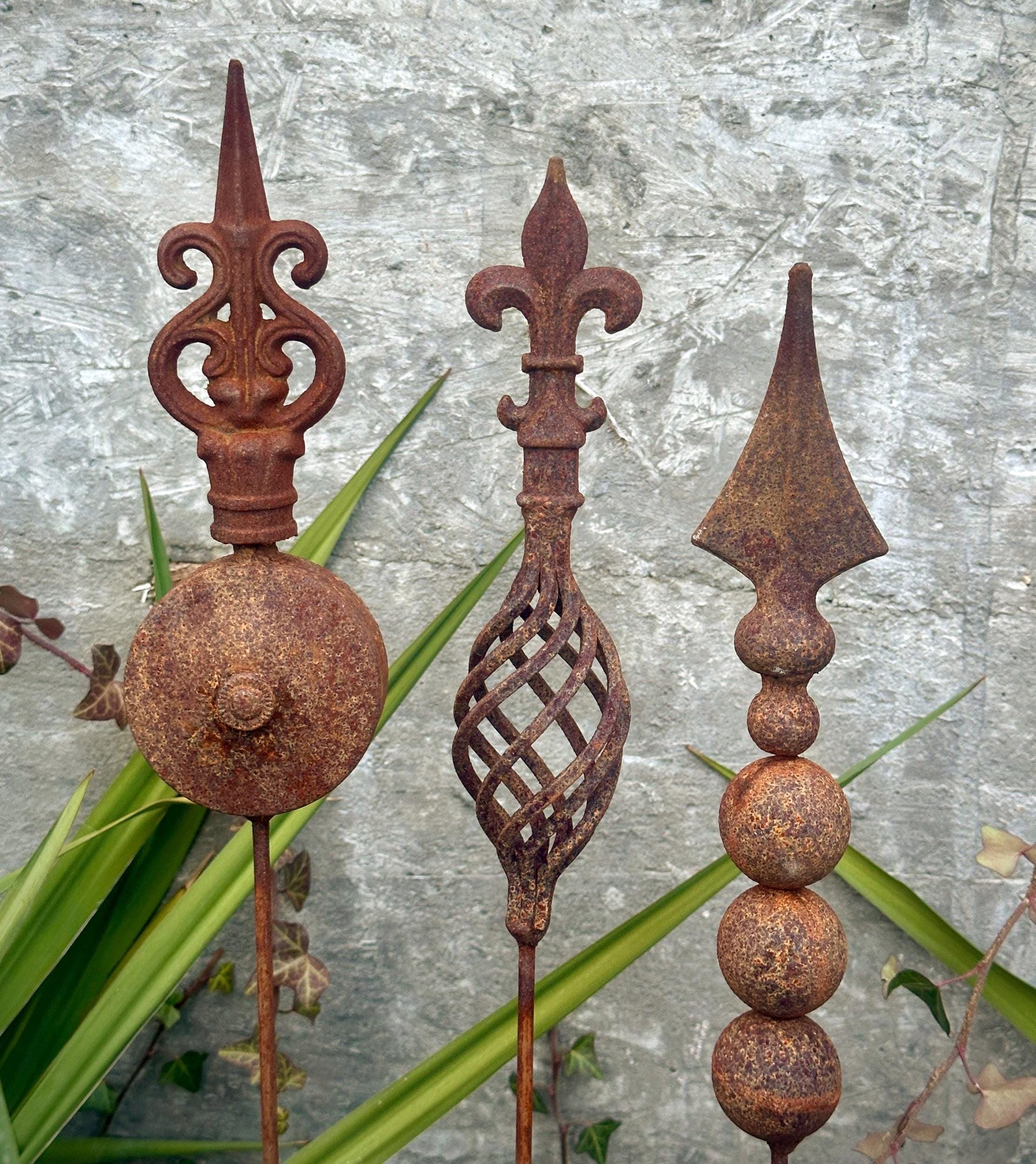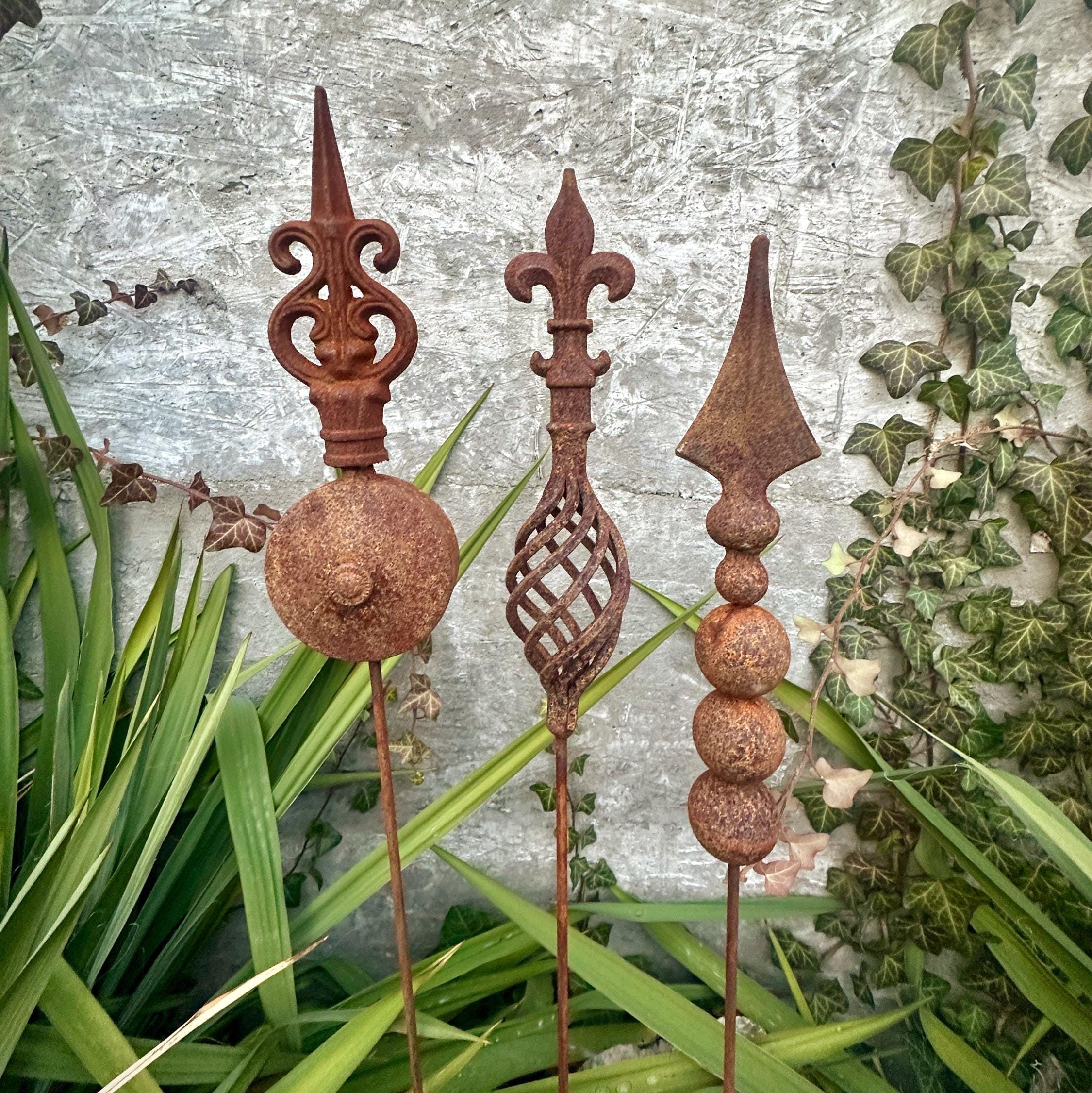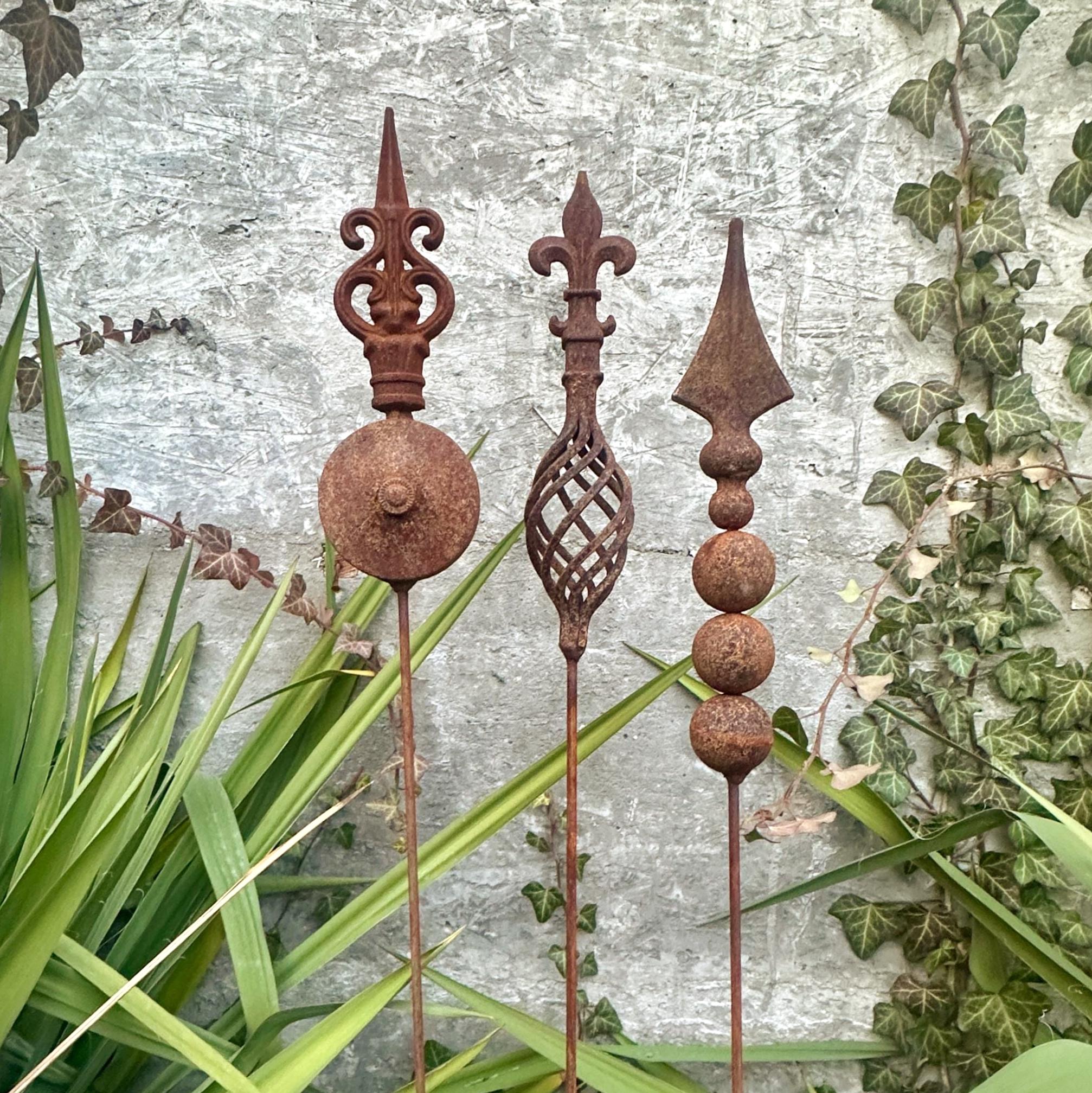 Transform your outdoor space with this set of 3 antique-inspired garden stakes, designed to add a touch of timeless elegance to your garden. Each piece features intricate detailing and a unique natural rusty patina, giving it an authentic aged look.