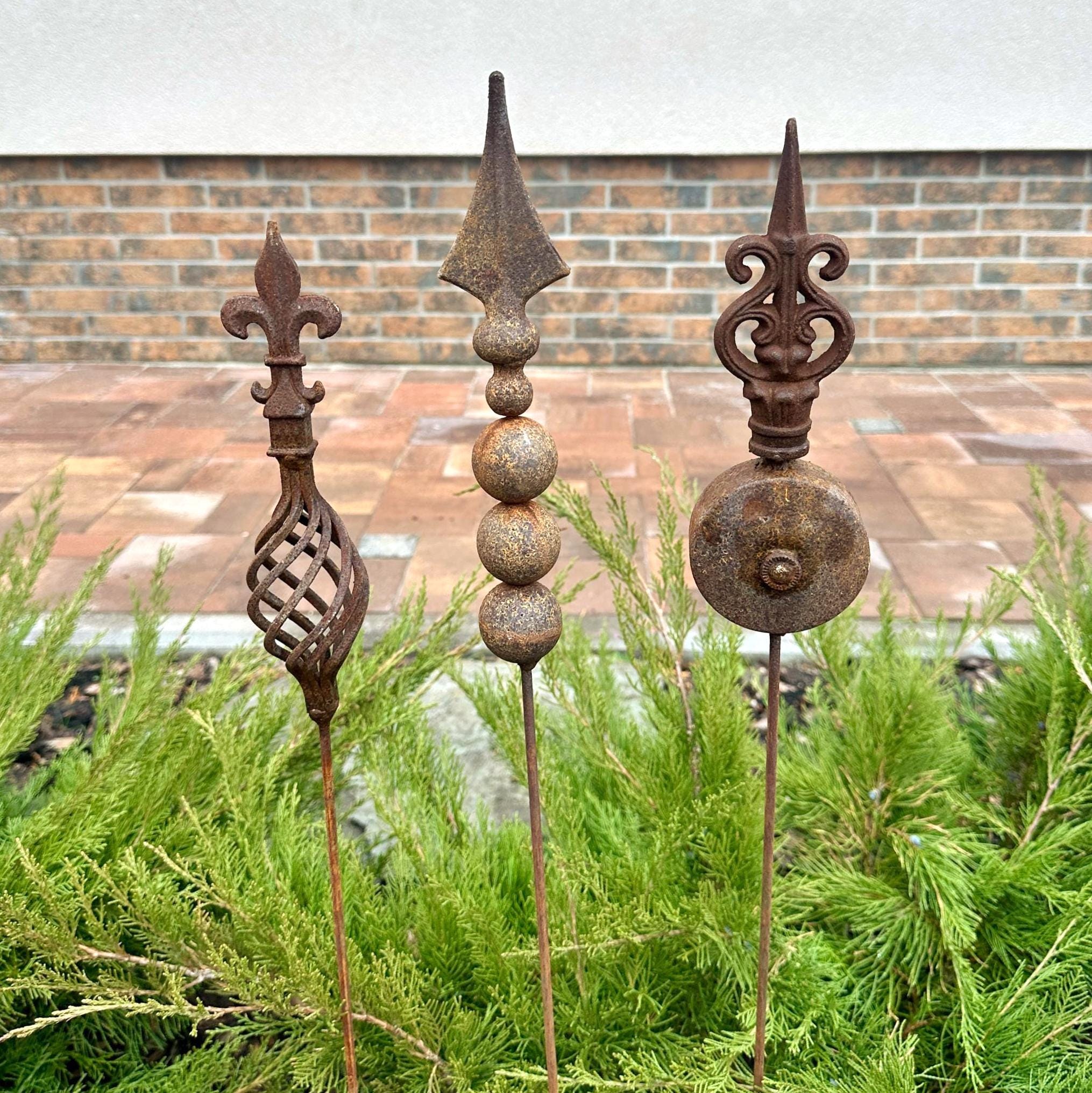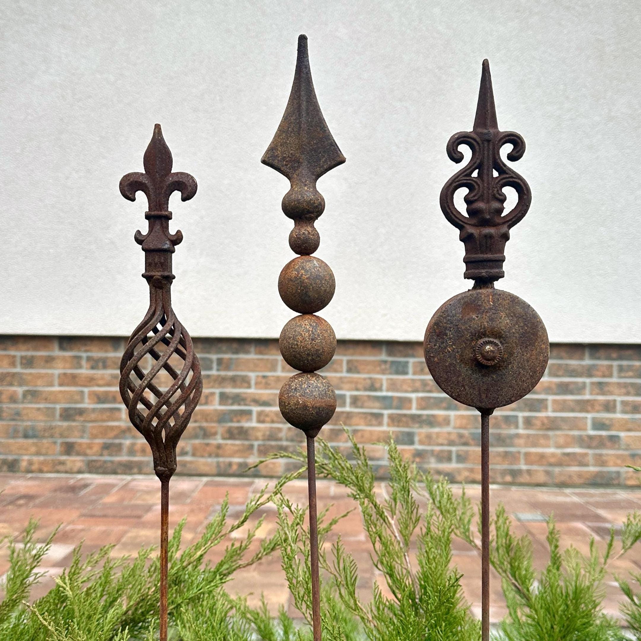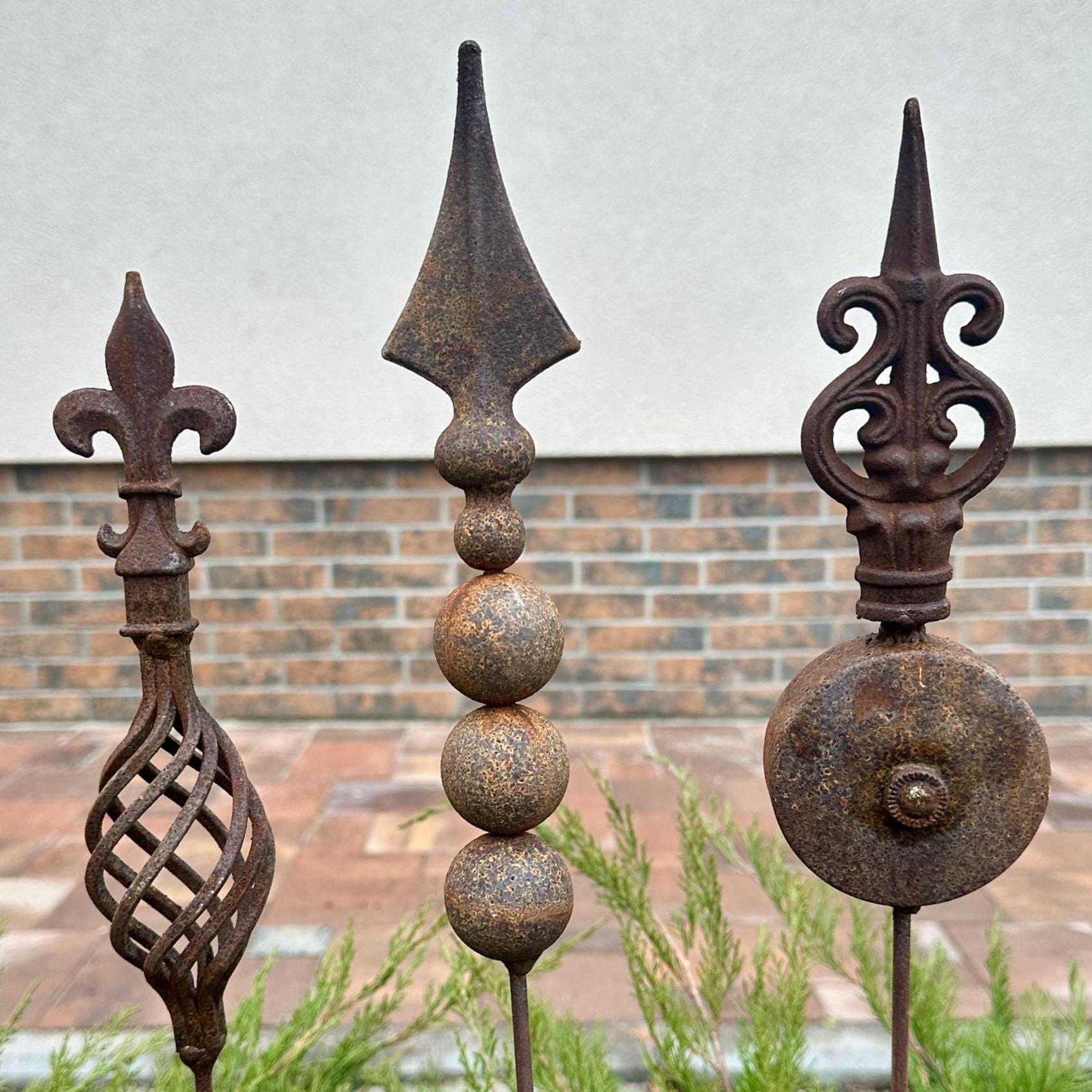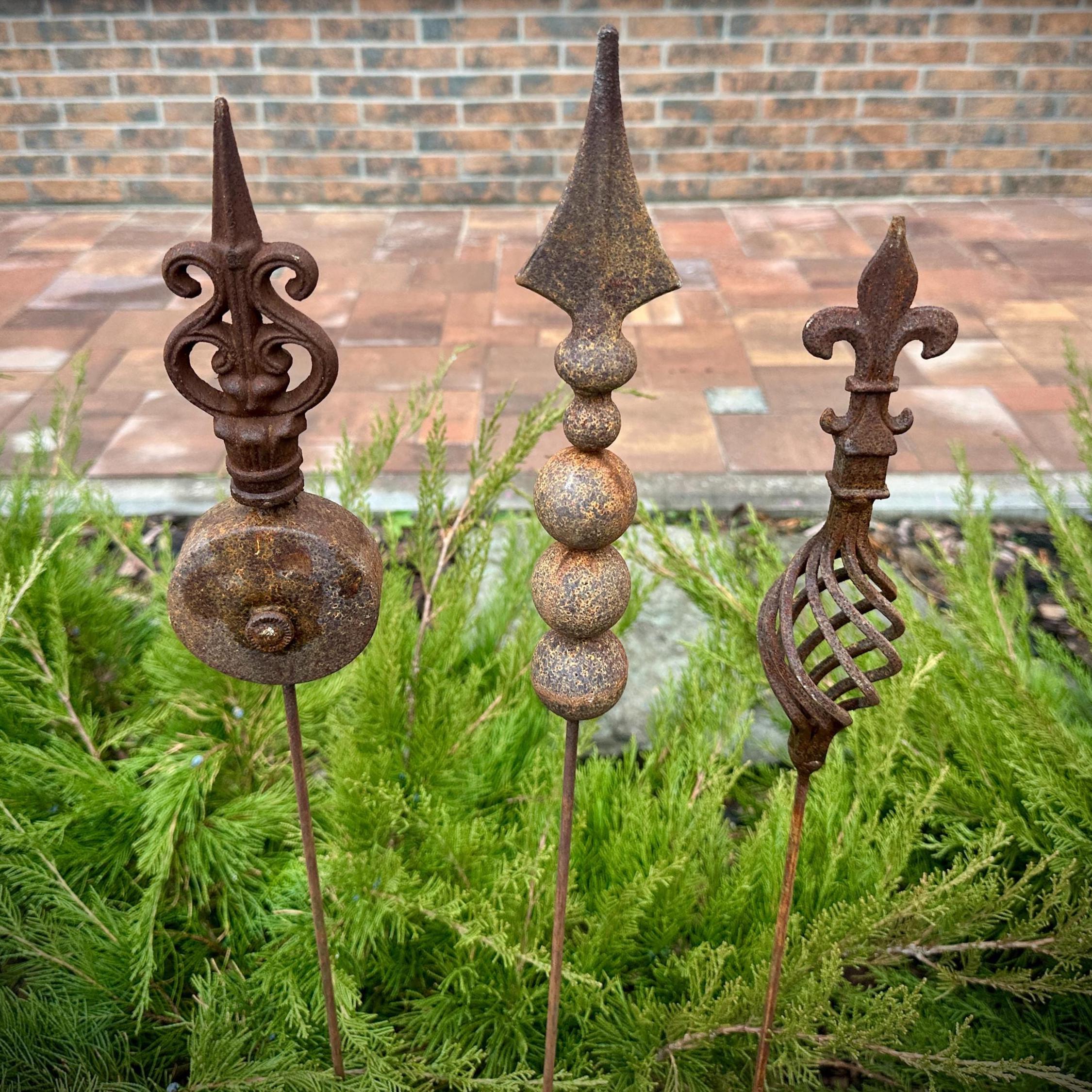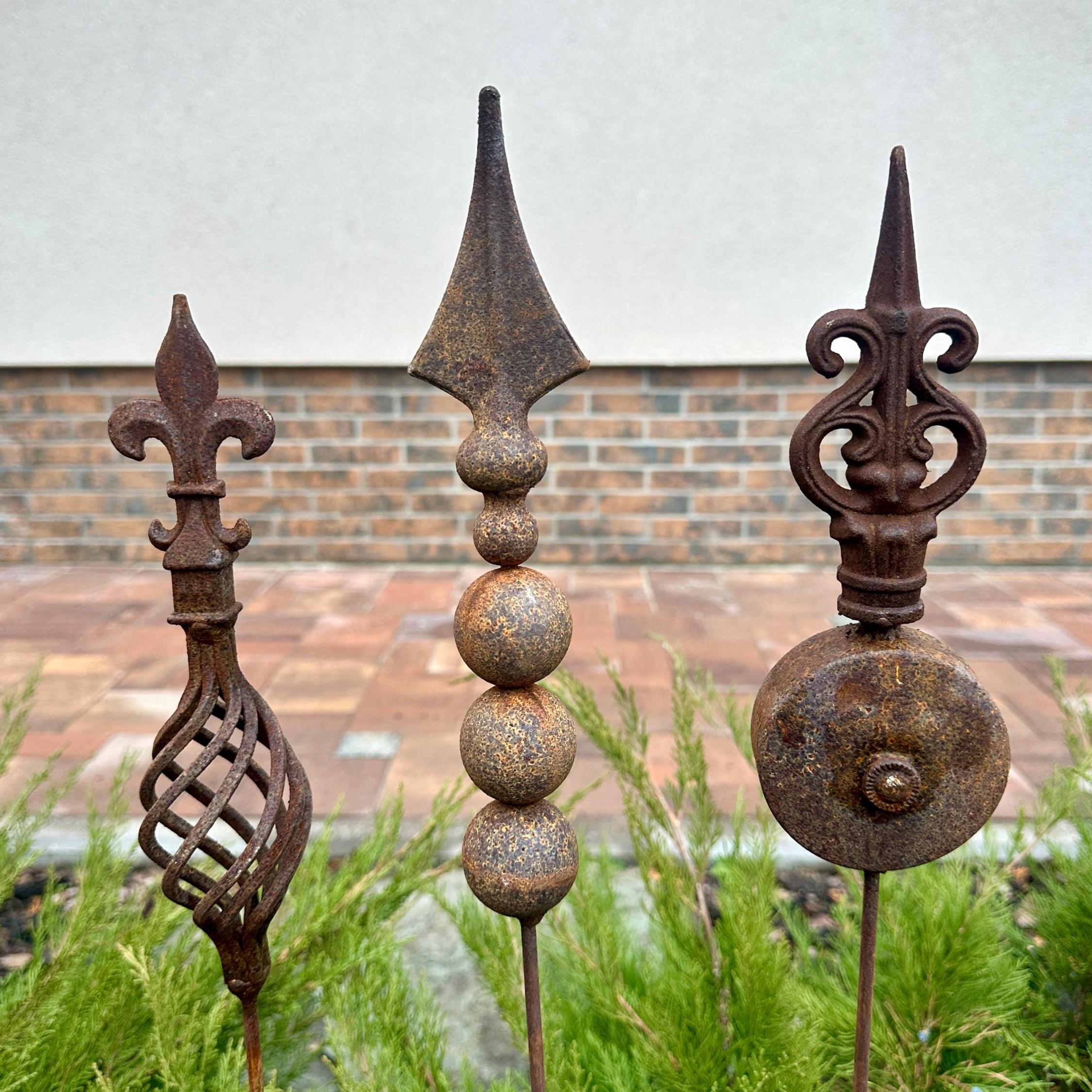 Transform your outdoor space with this set of 3 antique-inspired garden stakes, designed to add a touch of timeless elegance to your garden. Each piece features intricate detailing and a unique natural rusty patina, giving it an authentic aged look.