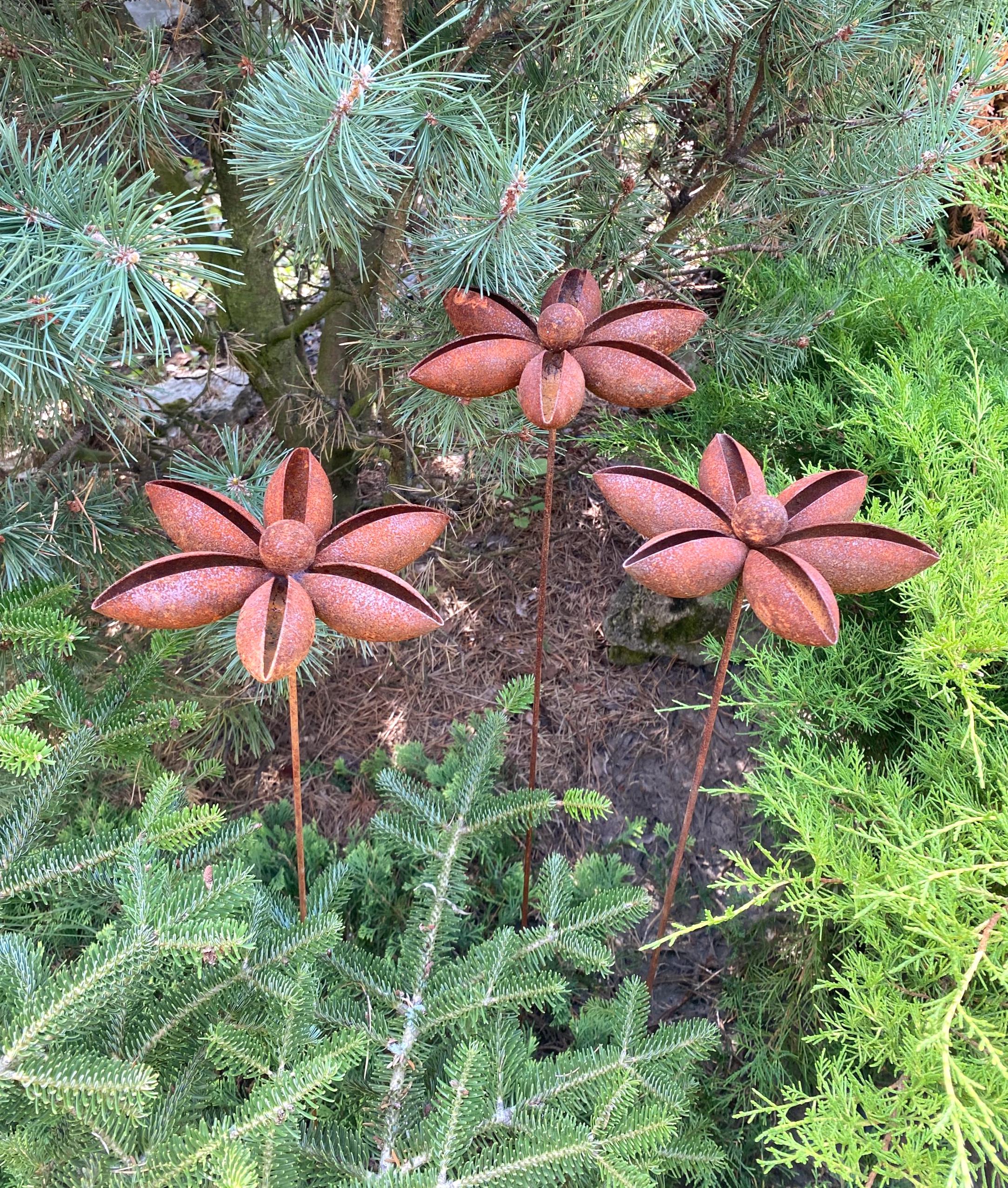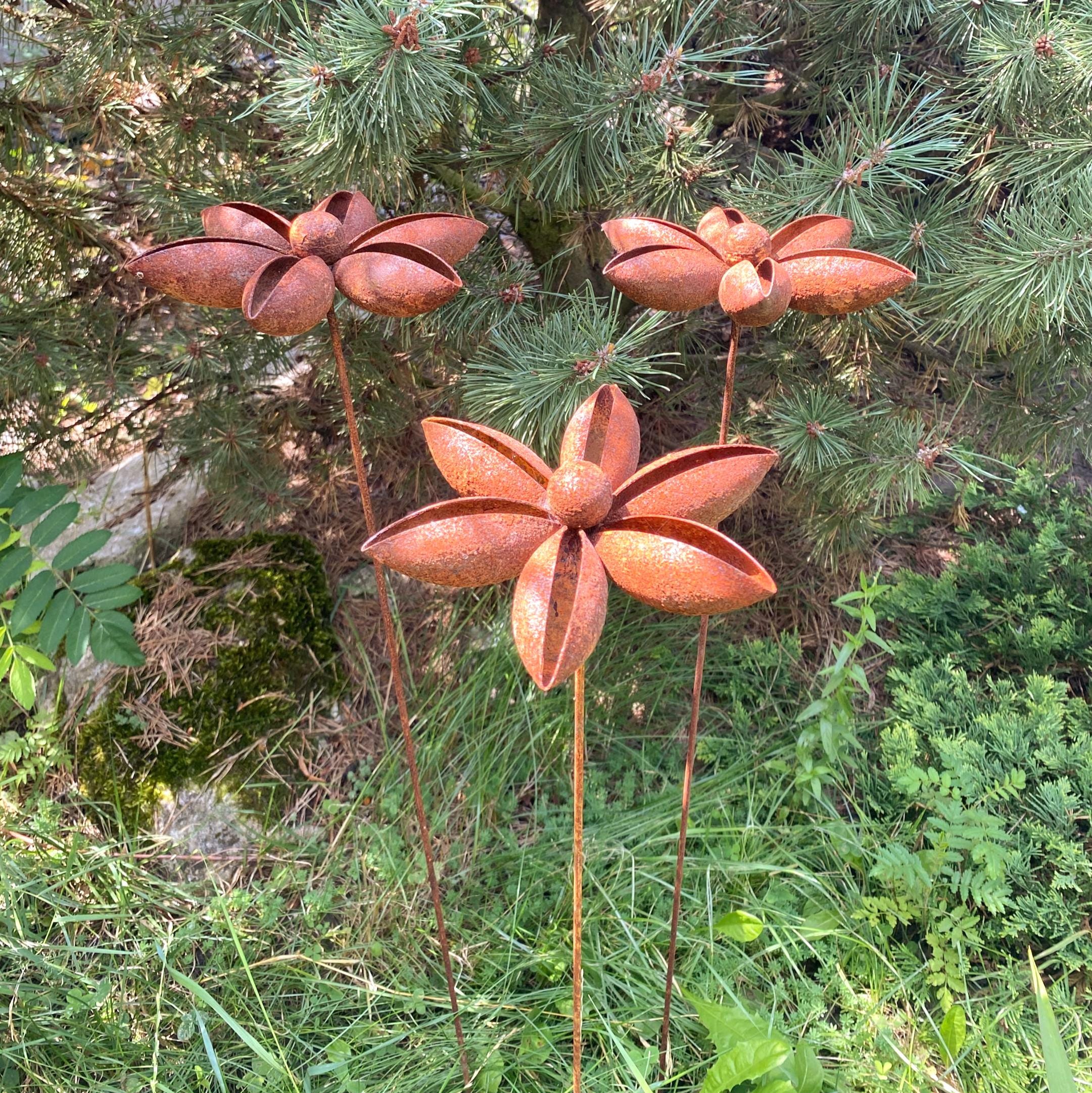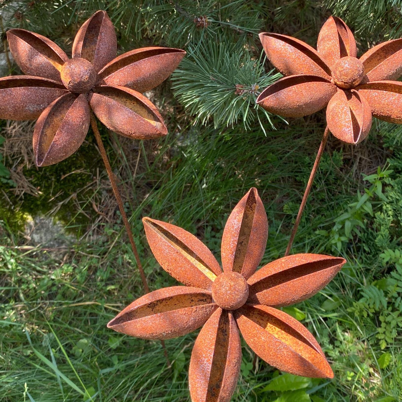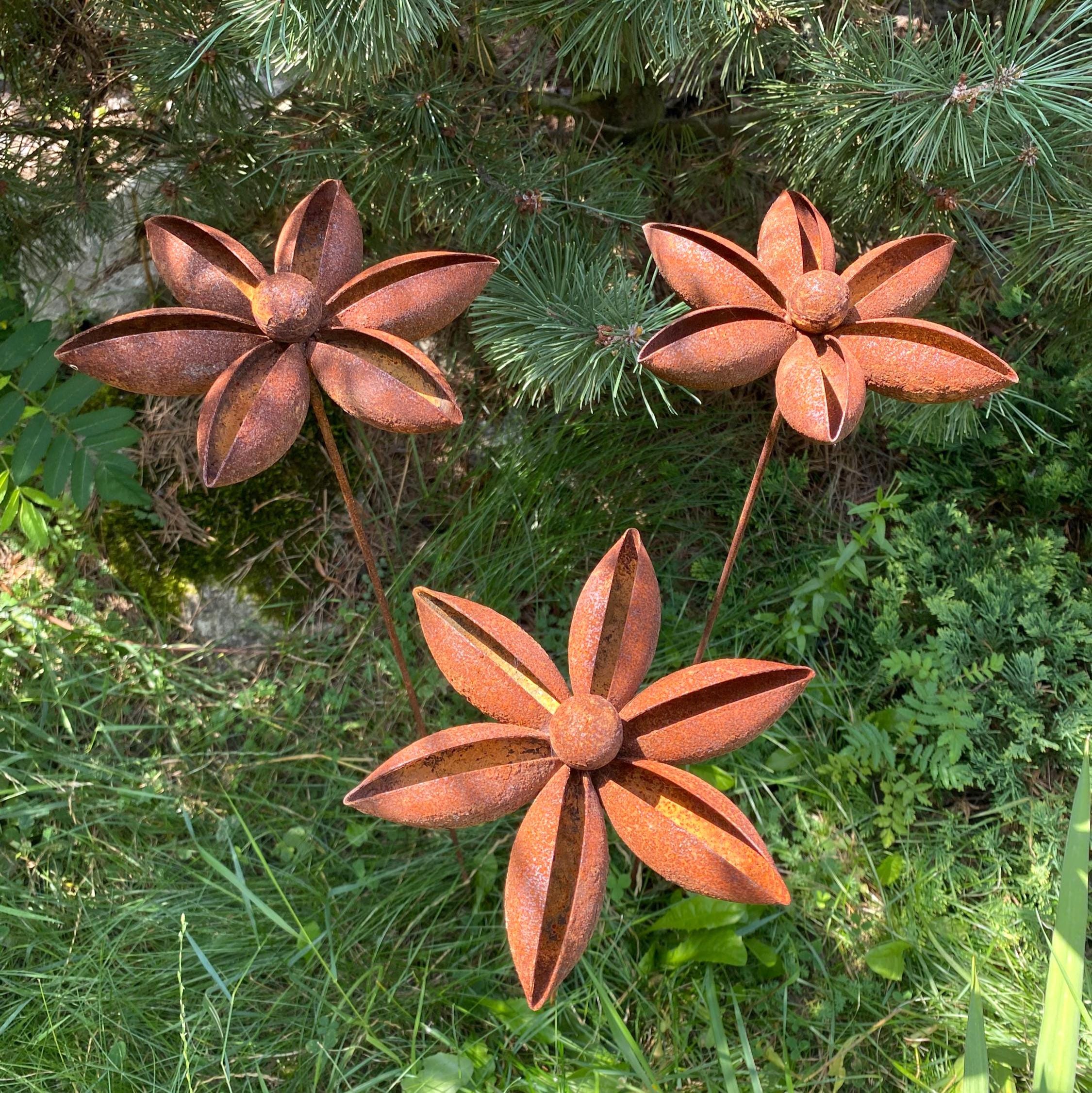 This rustic set of three handmade metal flowers is perfect for adding a touch of nature to your garden and landscapes. They're perfect for creating a romantic and welcoming ambience in your home. This rustic metal art is perfect for any home, garden, backyard, terrace or entrance. It's made from natural metal and has a natural rust finish. This rusty garden decoration is suitable for use throughout the year and can withstand precipitation and direct sunlight.