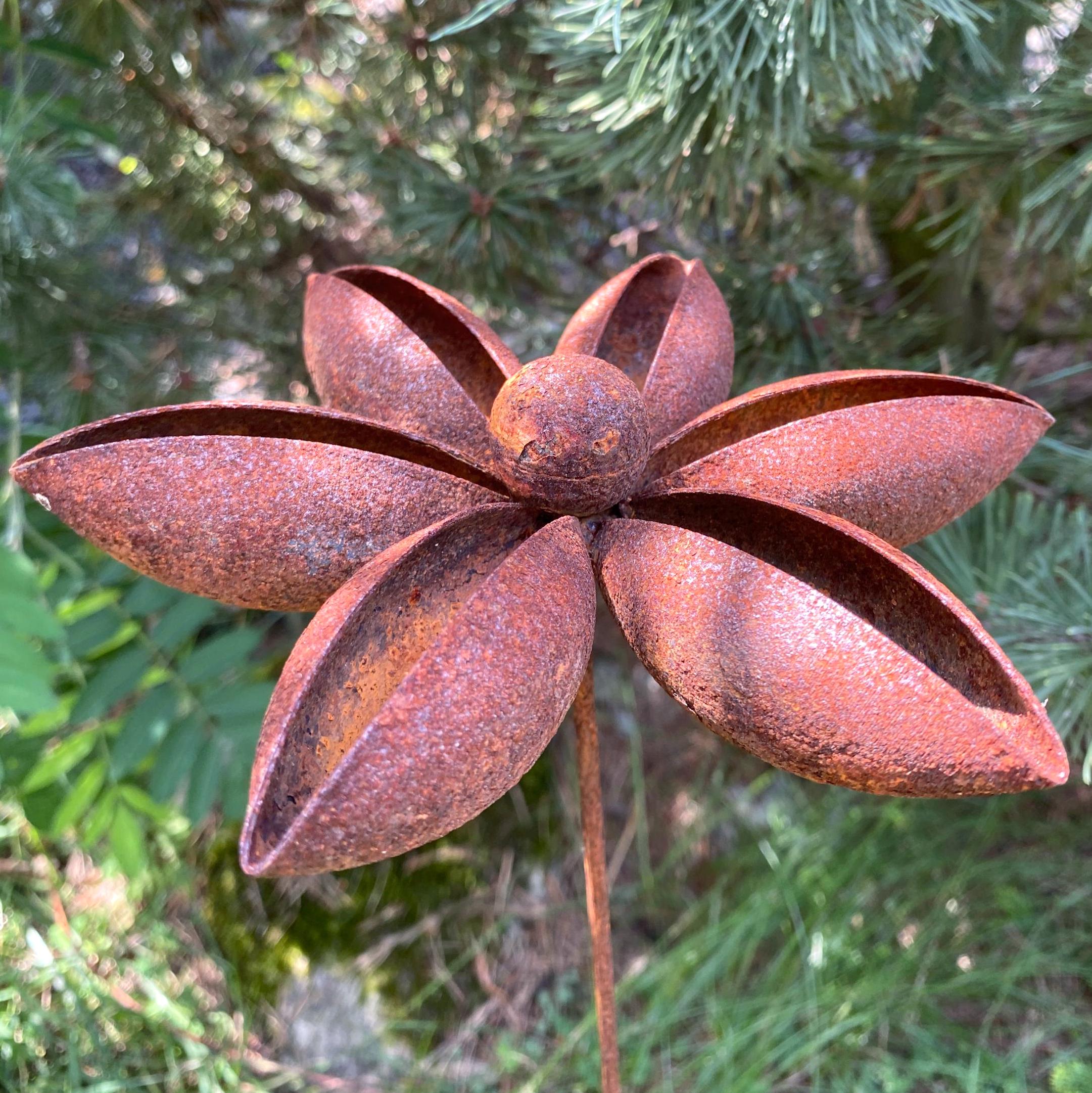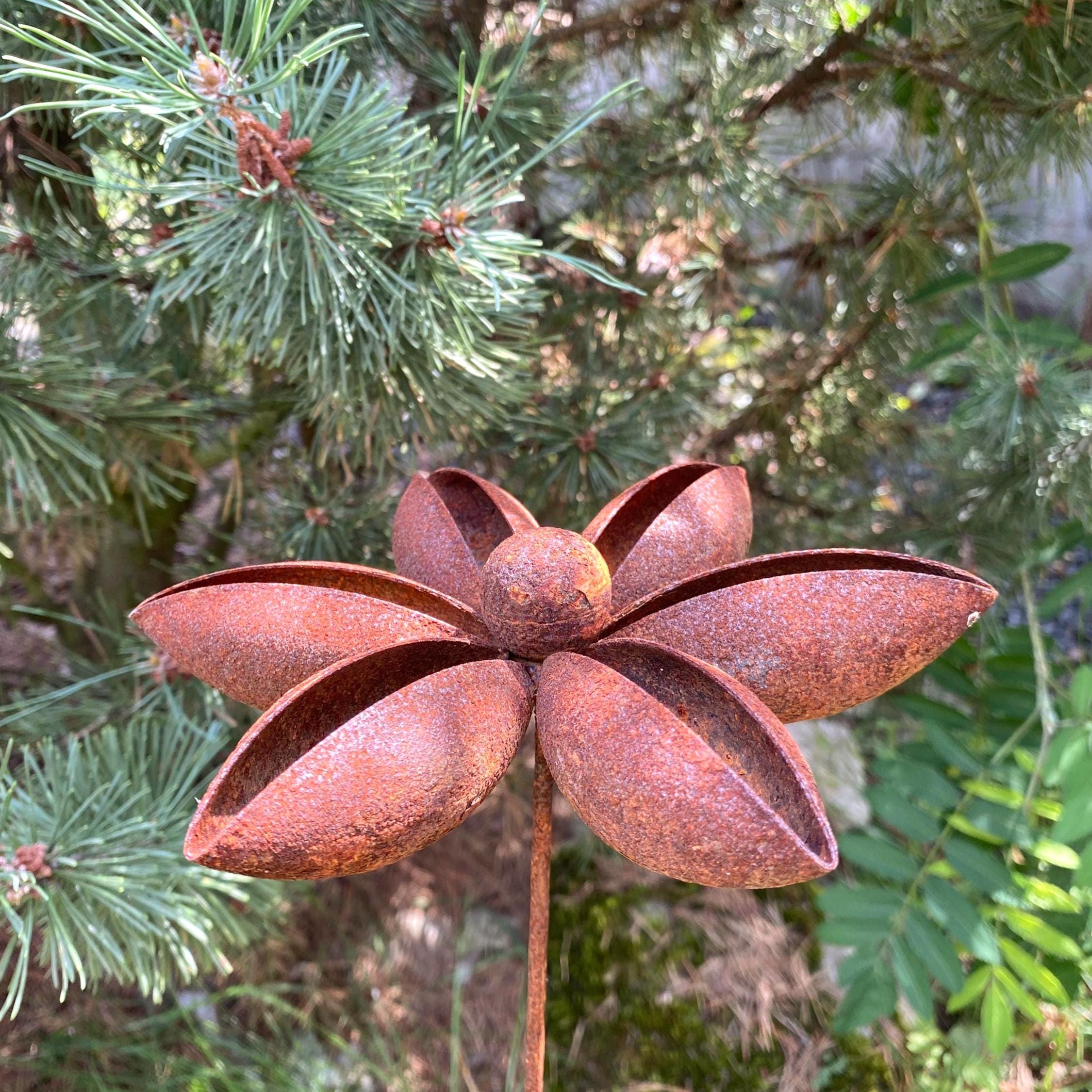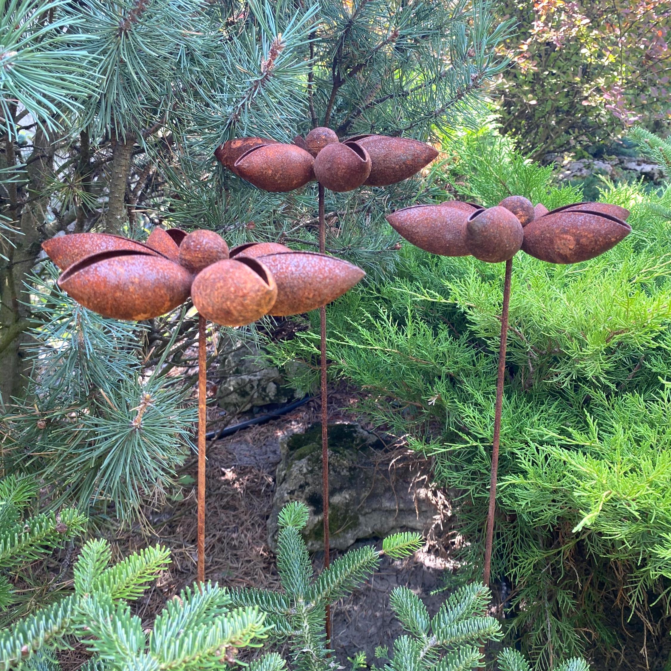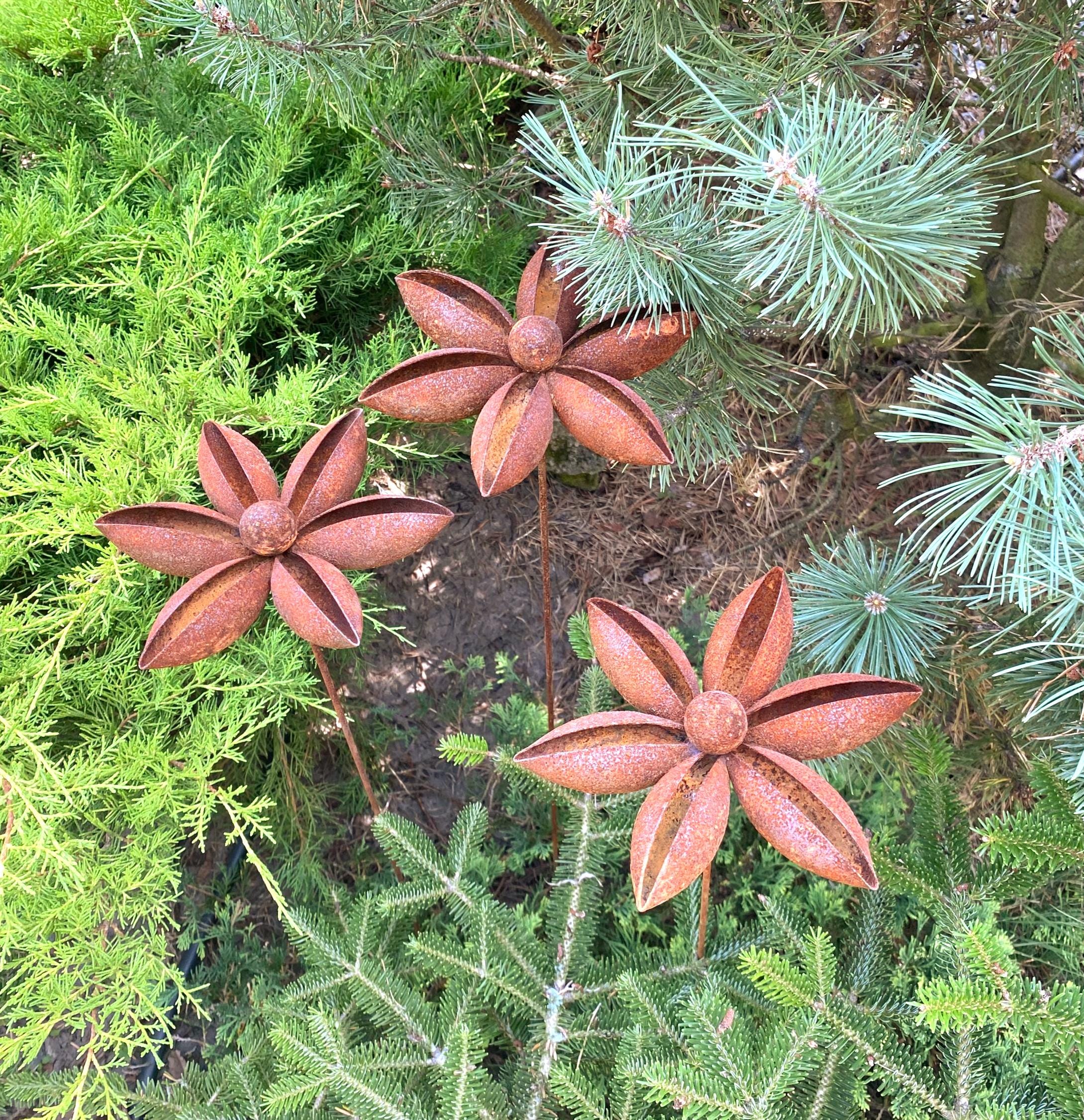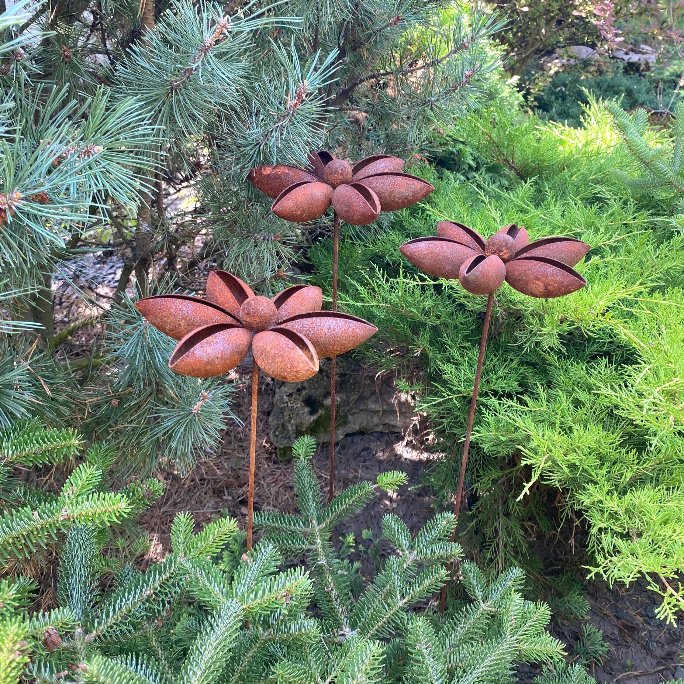 This rustic set of three handmade metal flowers is perfect for adding a touch of nature to your garden and landscapes. They're perfect for creating a romantic and welcoming ambience in your home. This rustic metal art is perfect for any home, garden, backyard, terrace or entrance. It's made from natural metal and has a natural rust finish. This rusty garden decoration is suitable for use throughout the year and can withstand precipitation and direct sunlight.