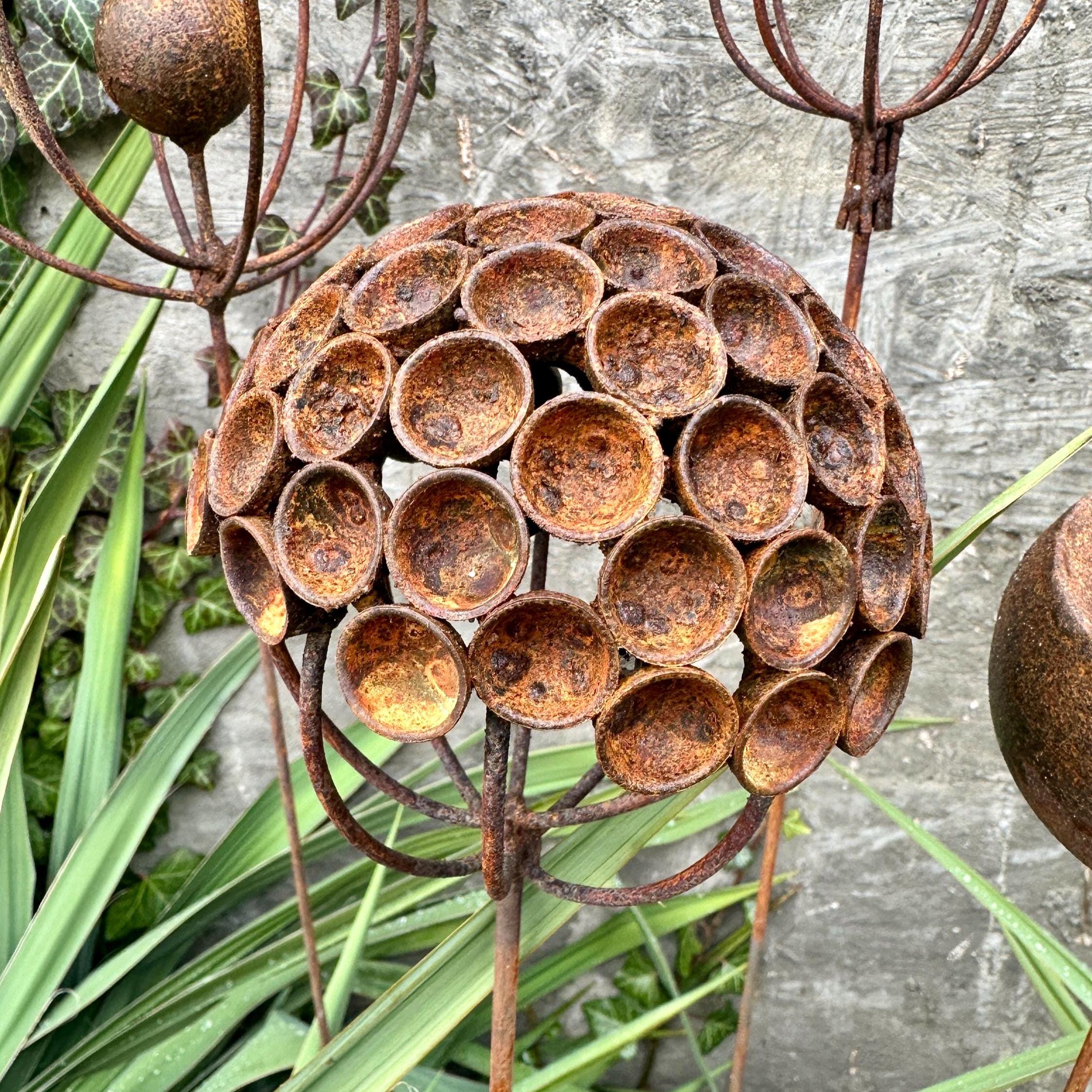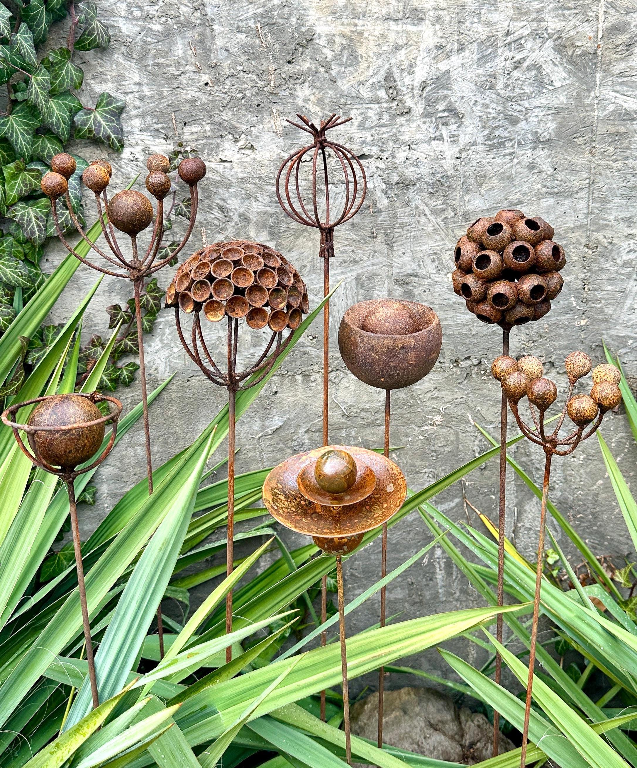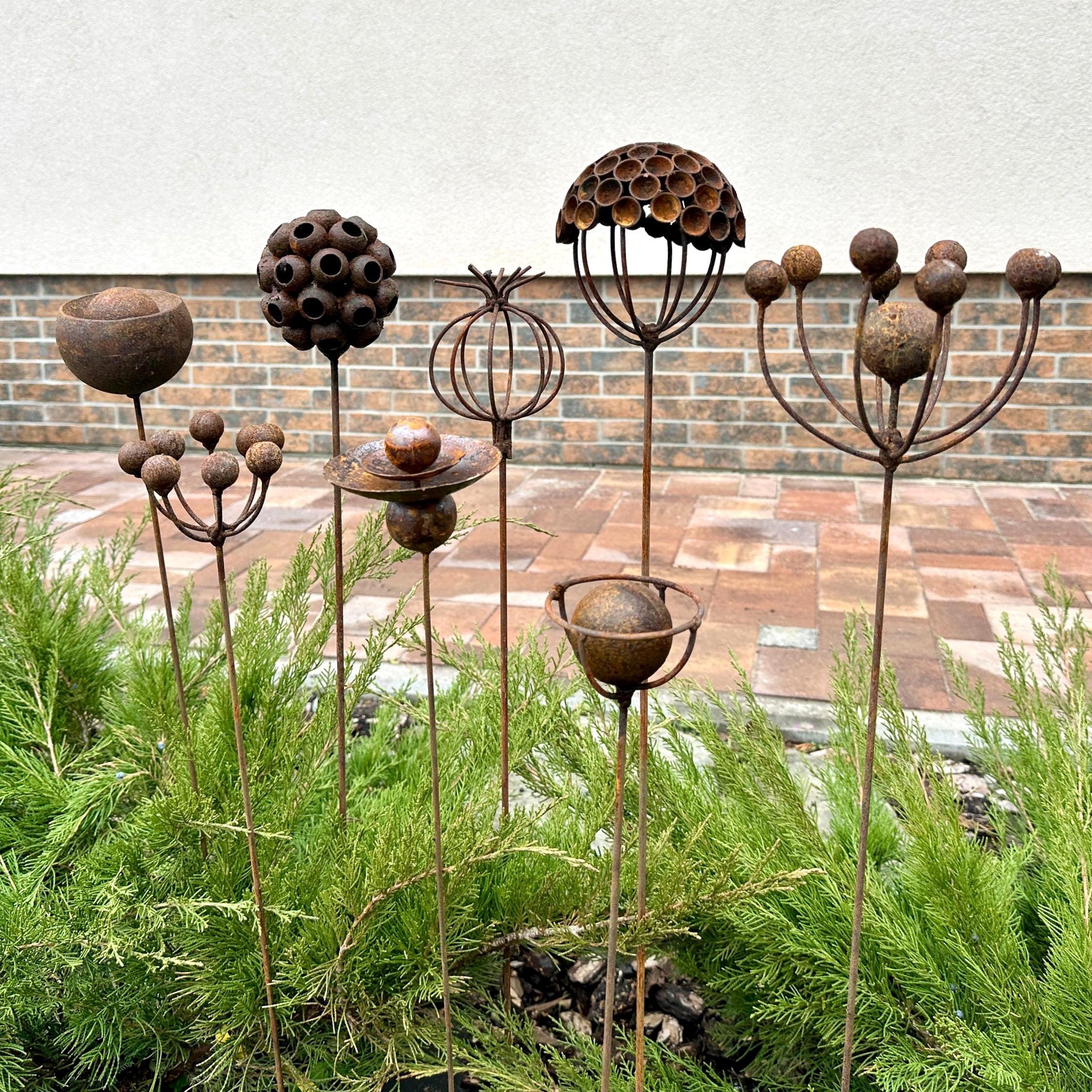 Enhance your outdoor space with this set of 8 handcrafted metal flower sculptures, designed to complement both modern and rustic landscapes. These durable garden stakes feature an elegant weathered patina, adding character to flower beds, pathways, and planters.