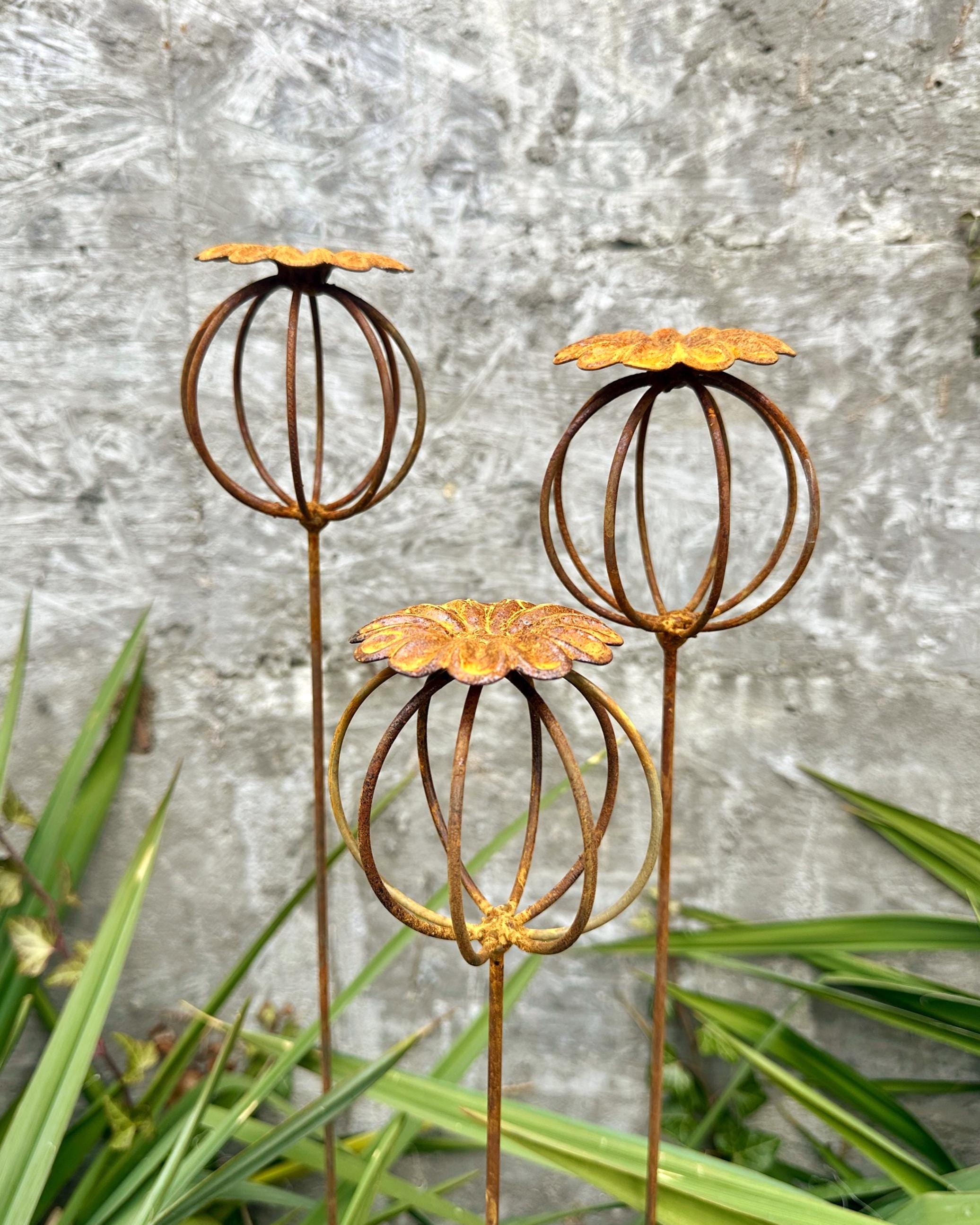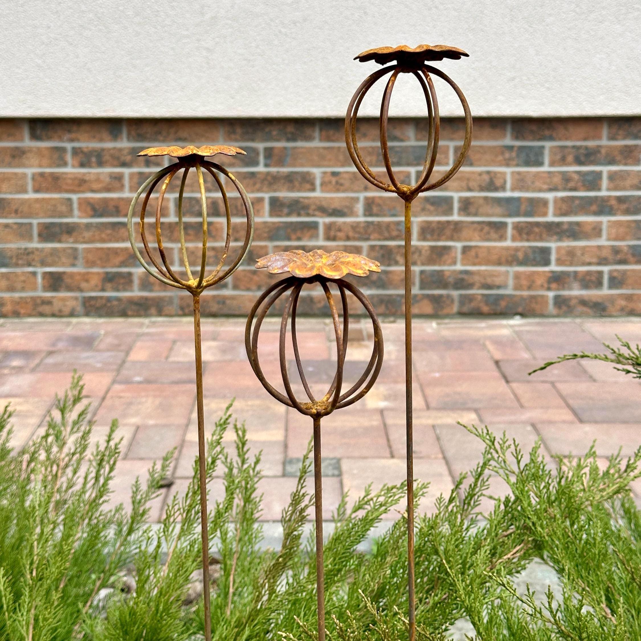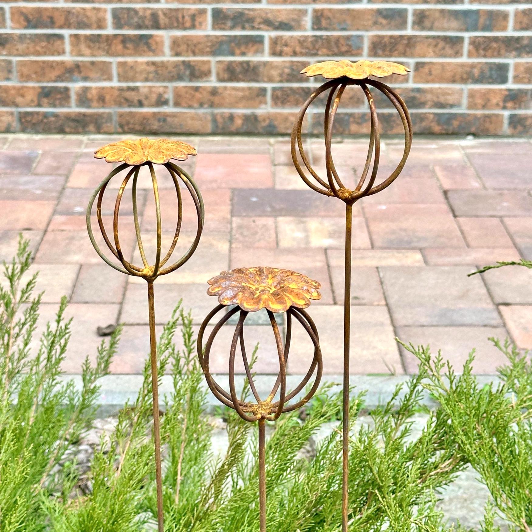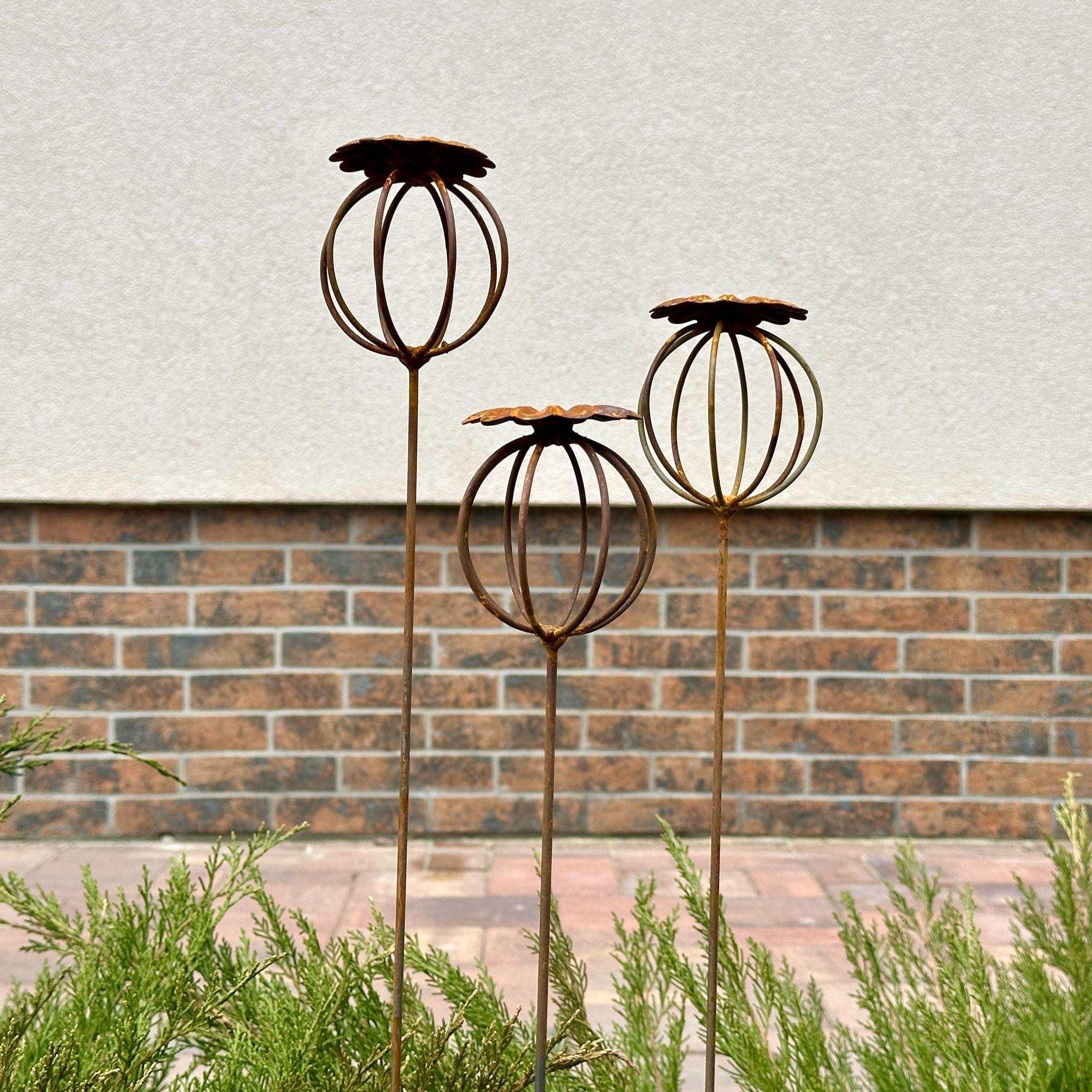 Enhance your garden with this set of 3 rustic metal poppy seed heads, adding a decorative accent to your outdoor space. These elegant rusty metal flowers create an atmosphere of romance and coziness, blending beautifully into any garden, backyard, terrace, or entryway.