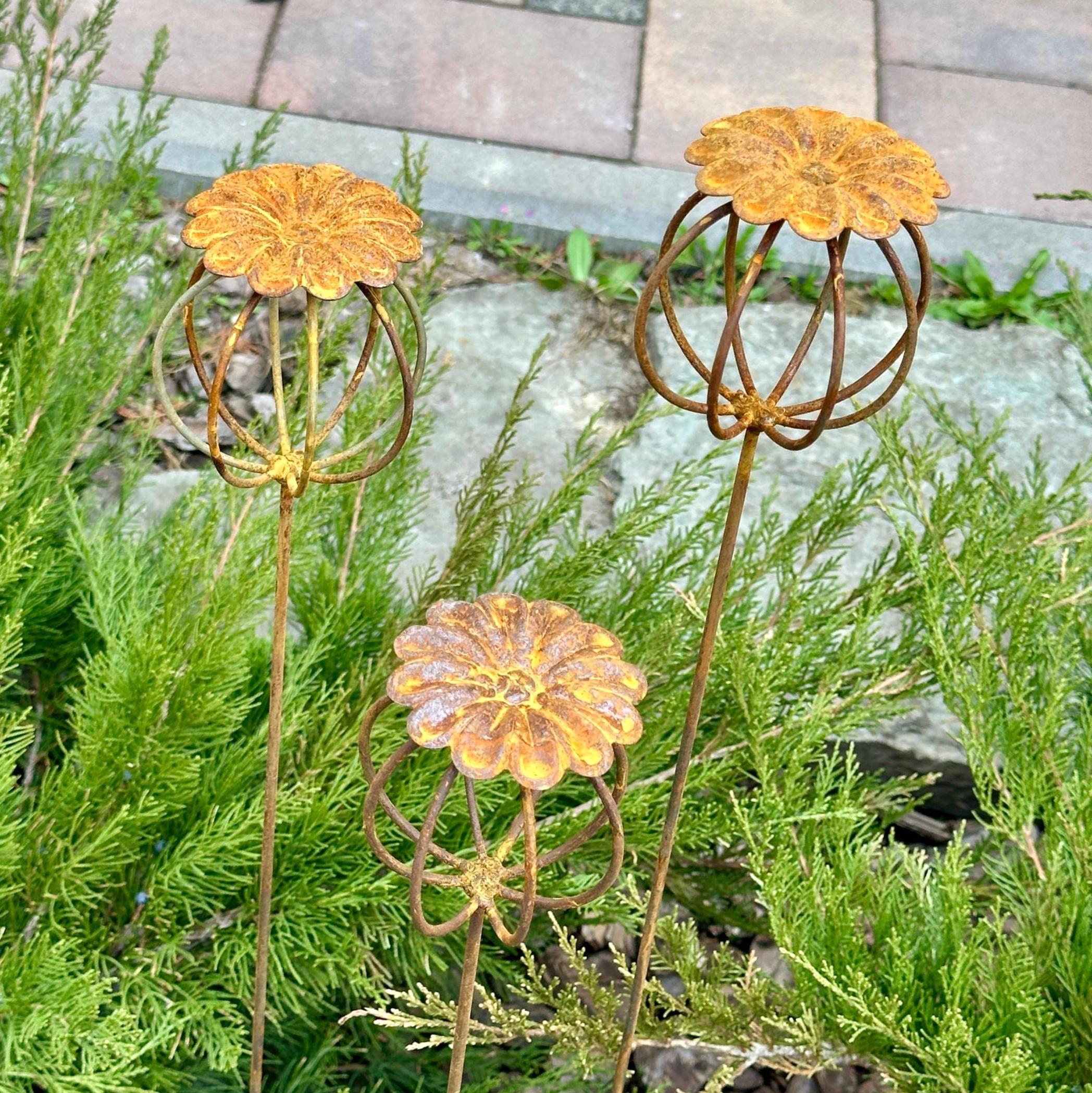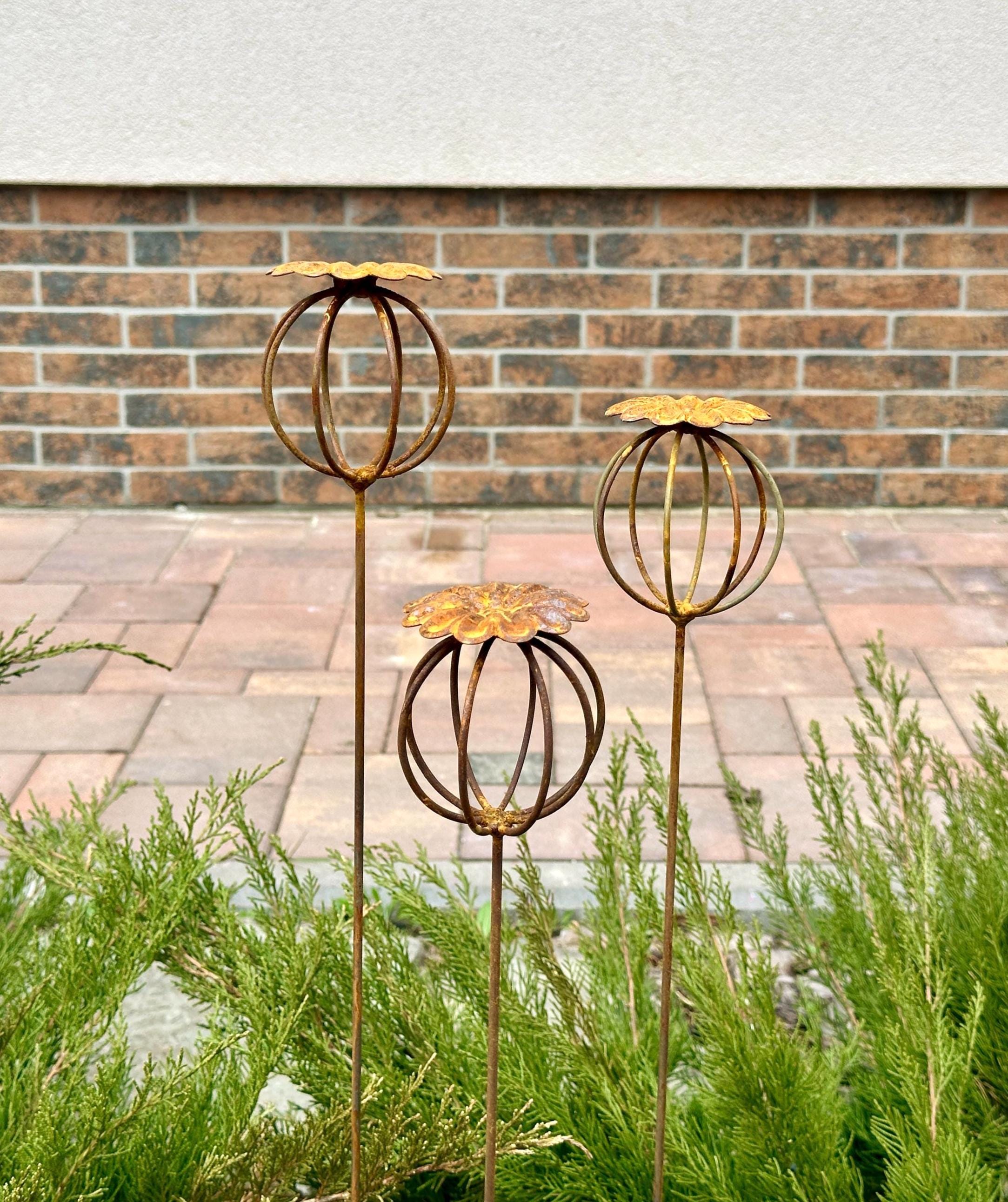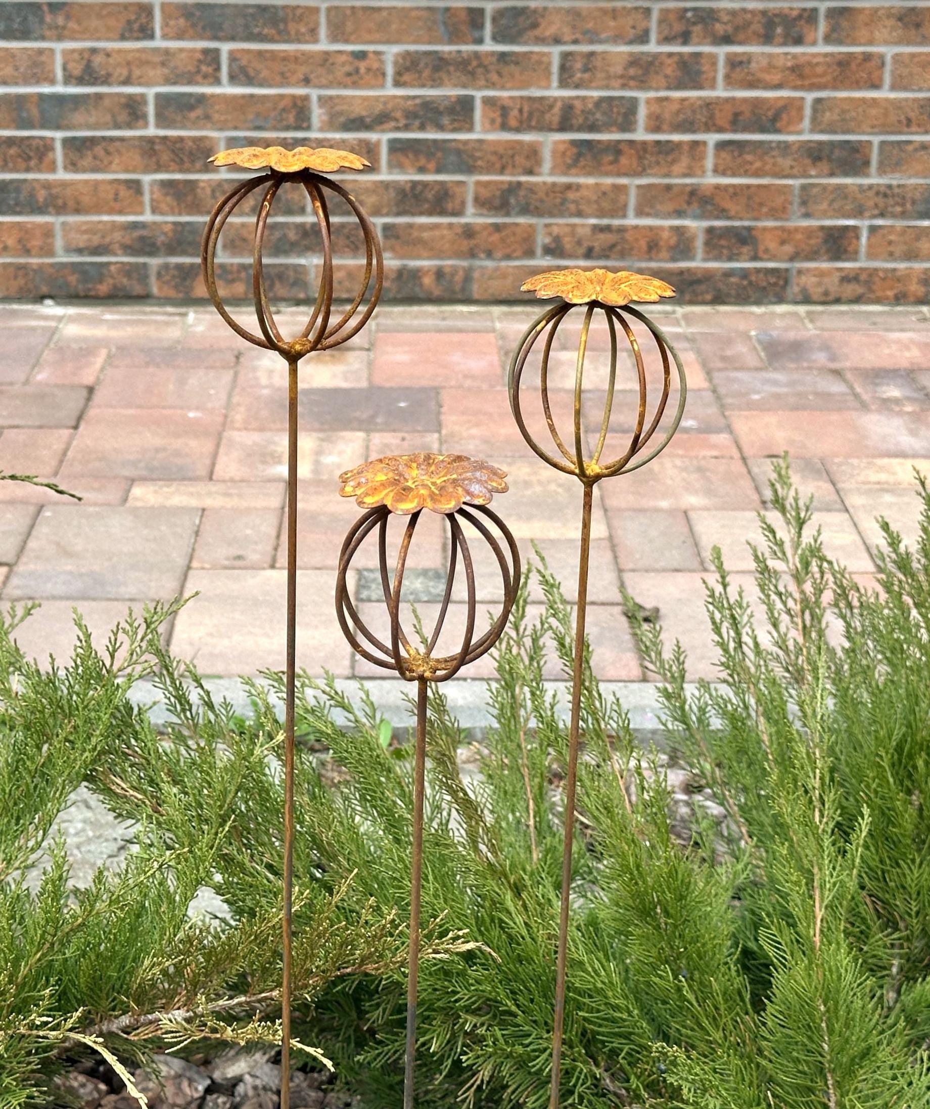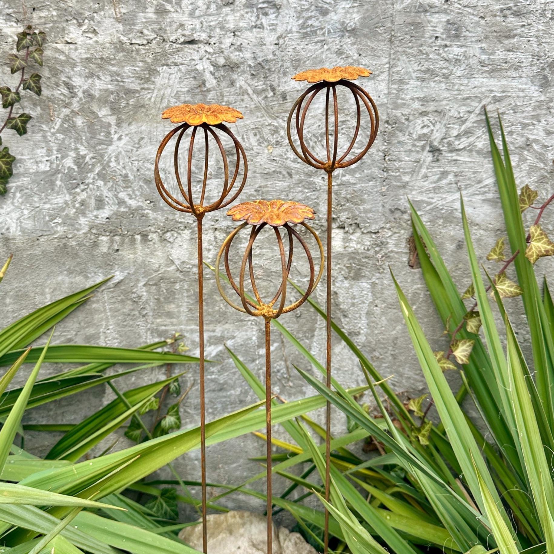 Enhance your garden with this set of 3 rustic metal poppy seed heads, adding a decorative accent to your outdoor space. These elegant rusty metal flowers create an atmosphere of romance and coziness, blending beautifully into any garden, backyard, terrace, or entryway.
