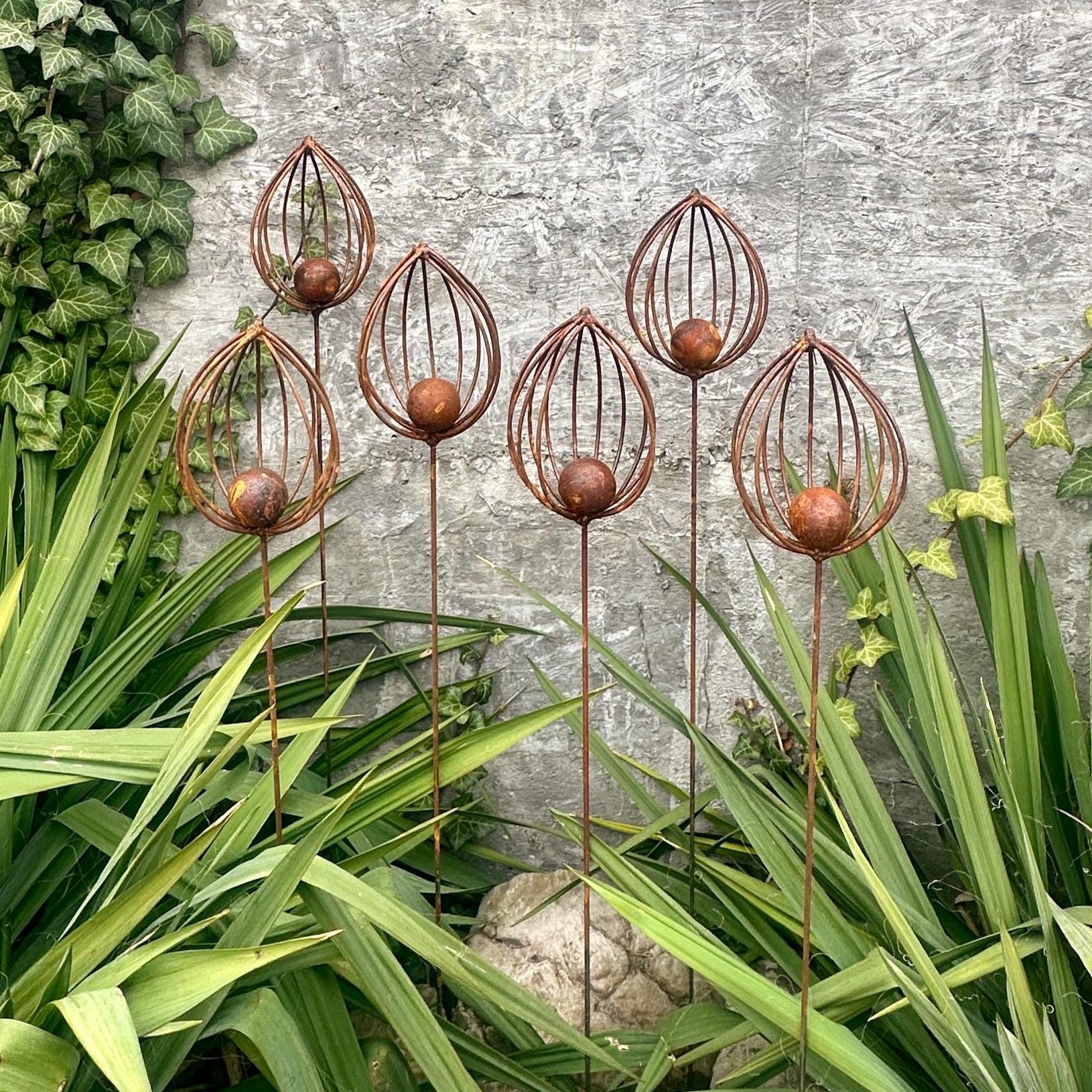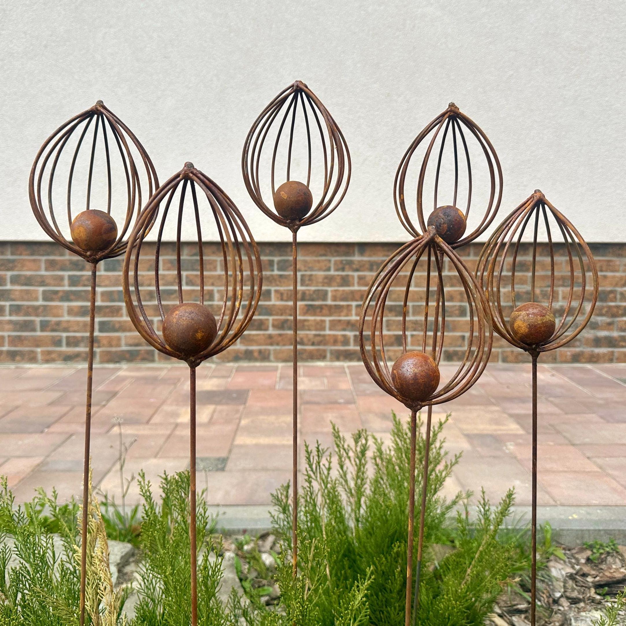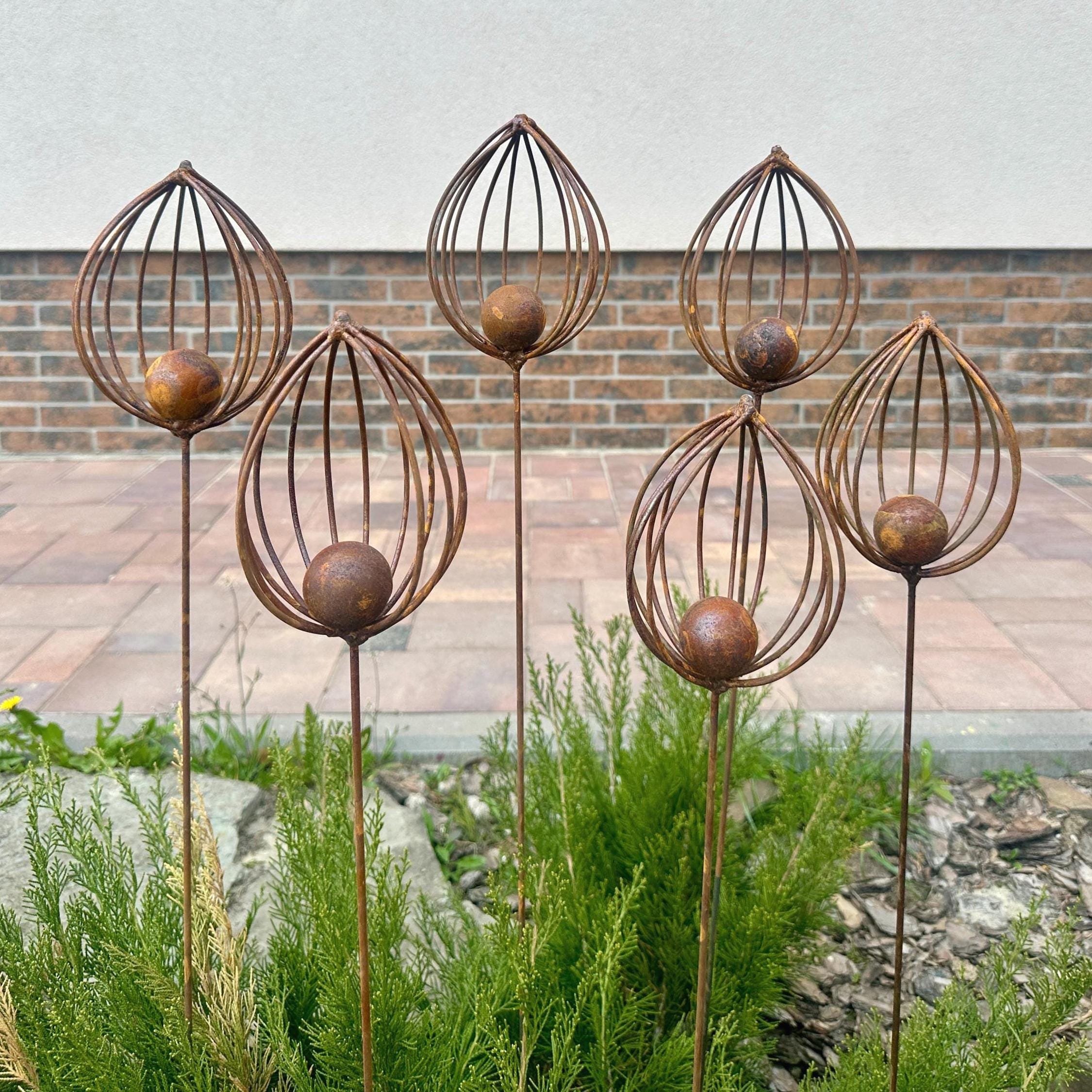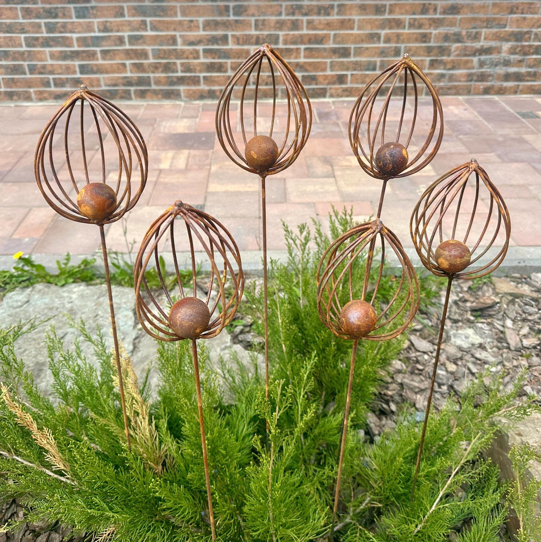 Elevate your garden with the timeless charm of this handcrafted set of six rustic metal finials. Each piece brings a warm, artistic accent to outdoor landscapes—perfect for flower beds, garden paths, planters, or even your front entrance. Their sculptural presence adds a romantic touch and natural elegance to any setting.