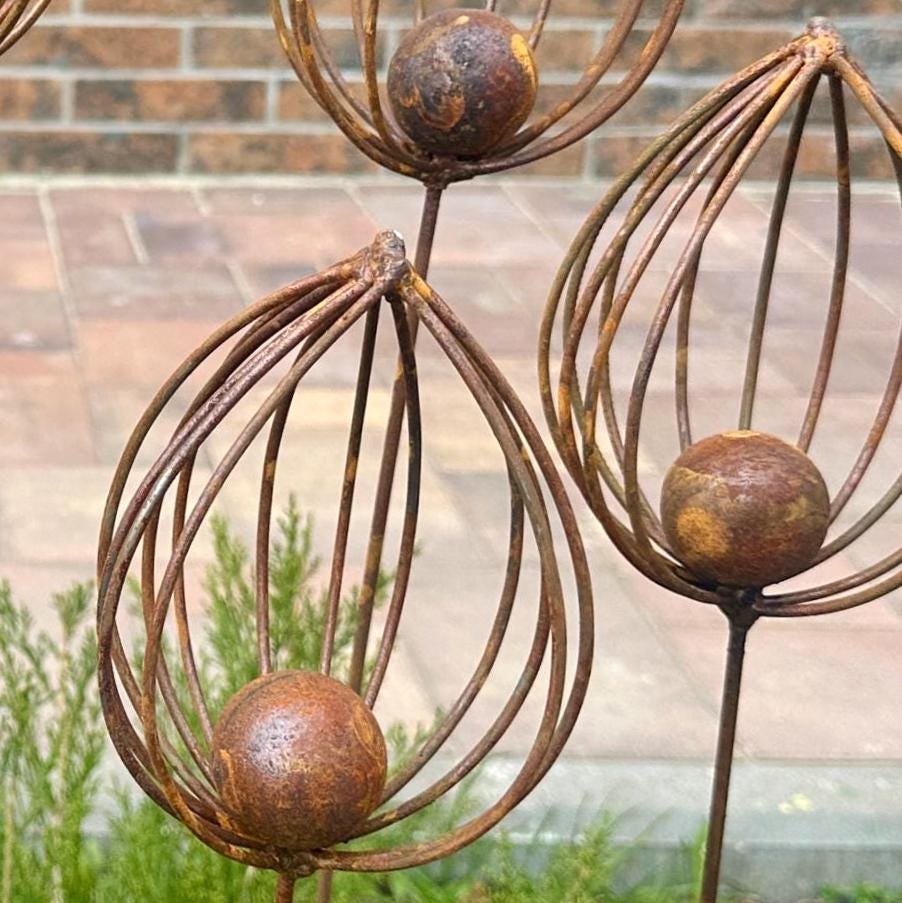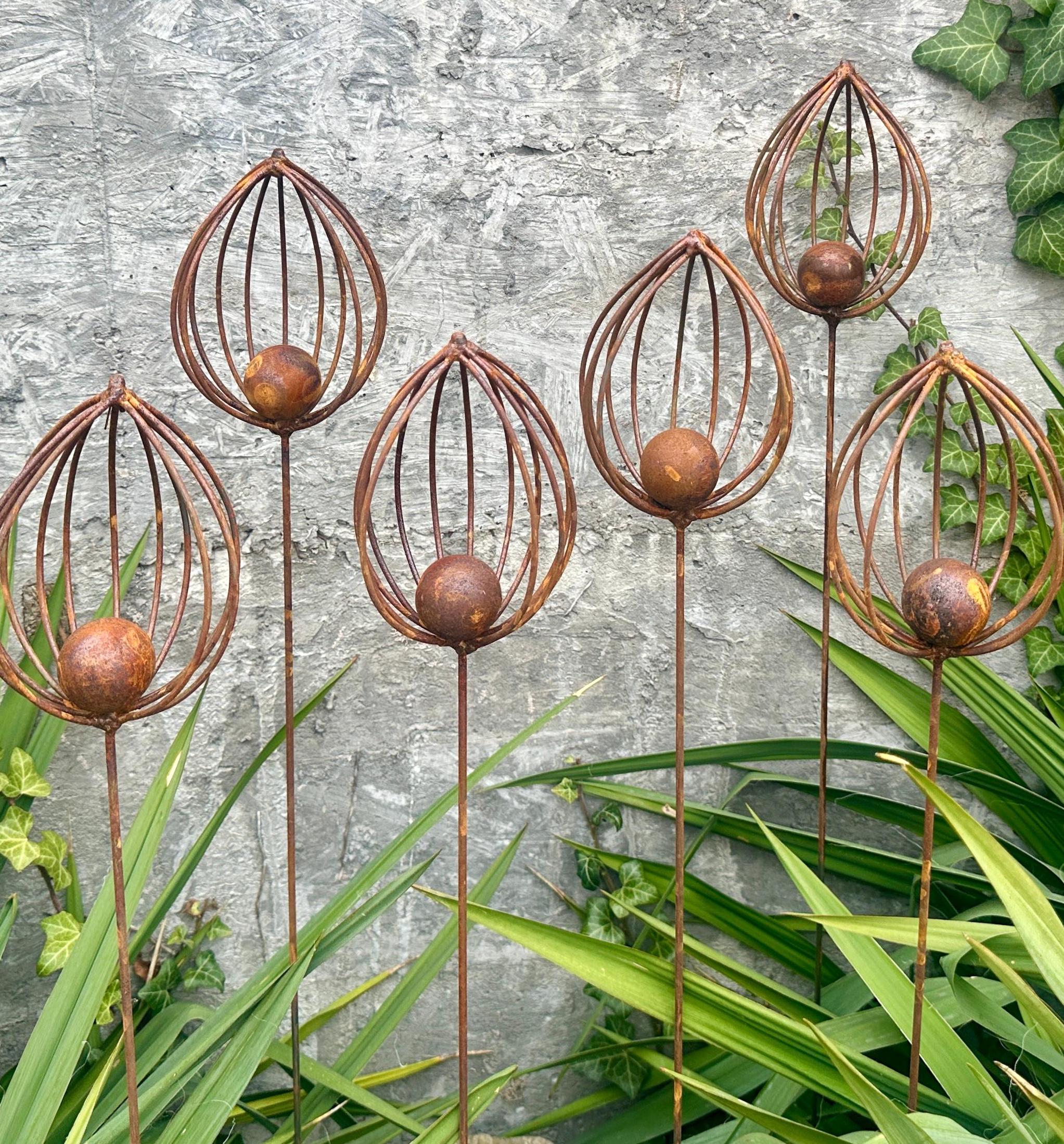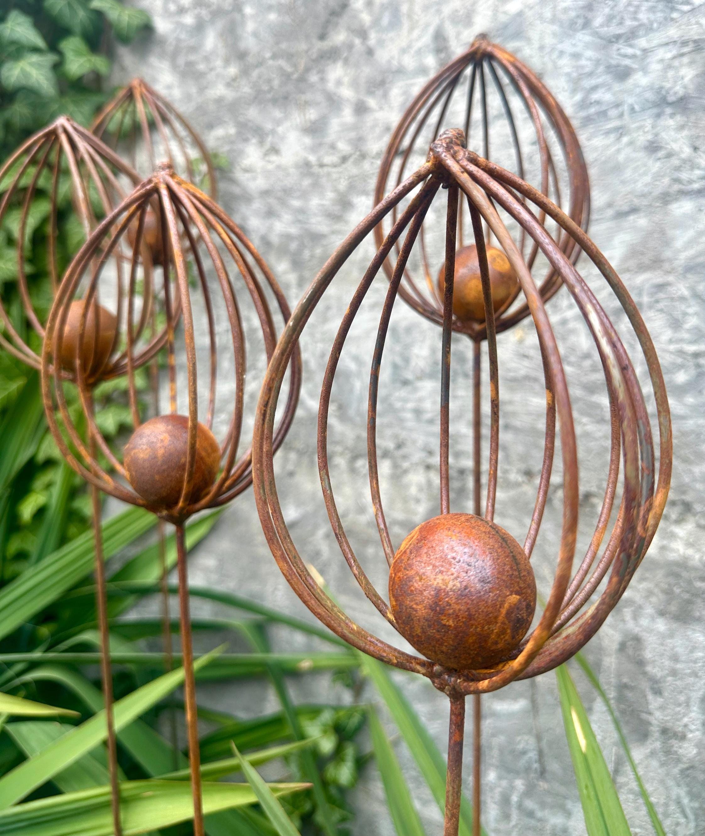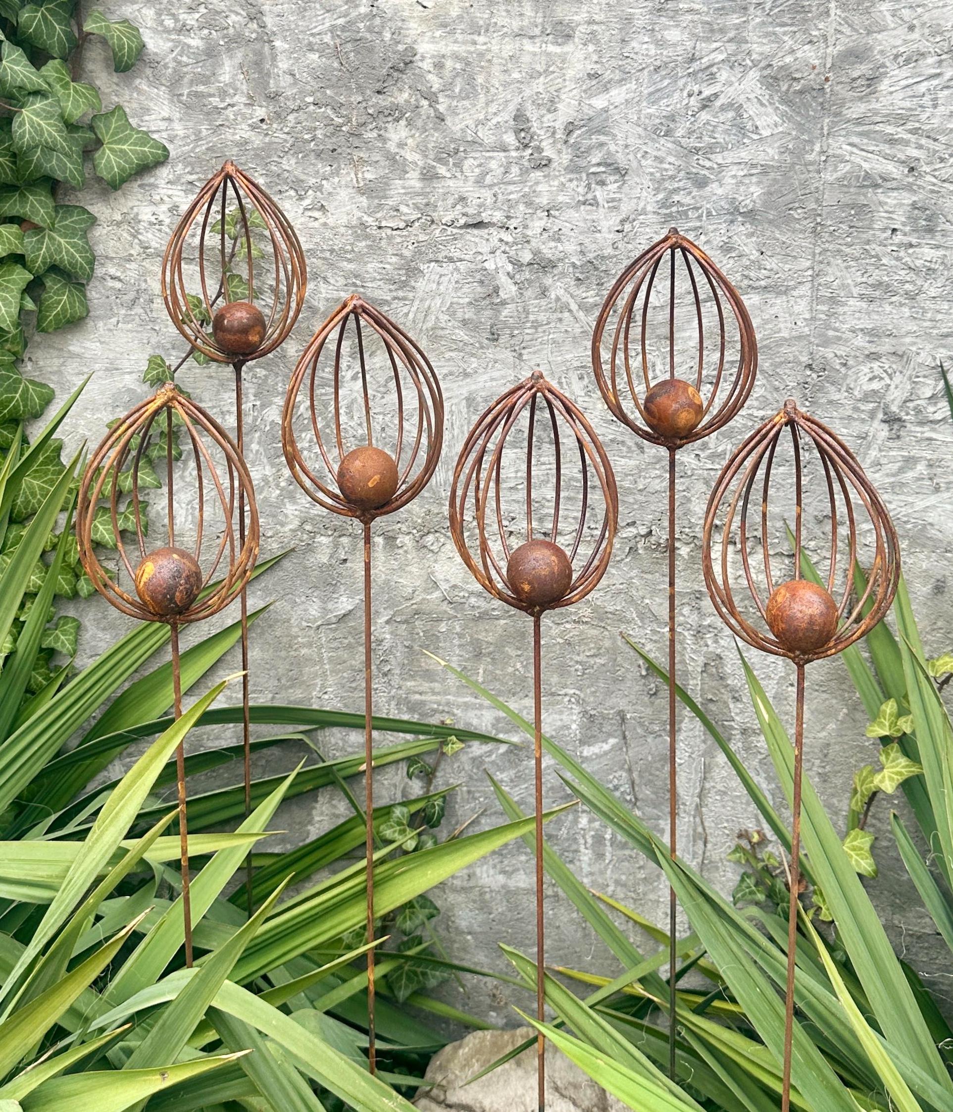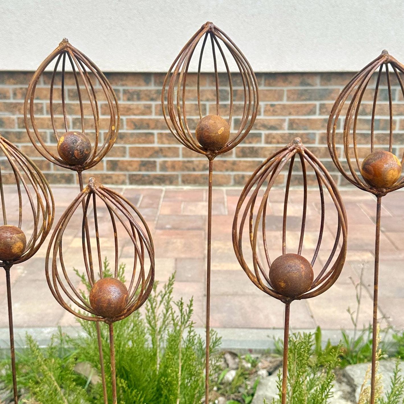 Elevate your garden with the timeless charm of this handcrafted set of six rustic metal finials. Each piece brings a warm, artistic accent to outdoor landscapes—perfect for flower beds, garden paths, planters, or even your front entrance. Their sculptural presence adds a romantic touch and natural elegance to any setting.
