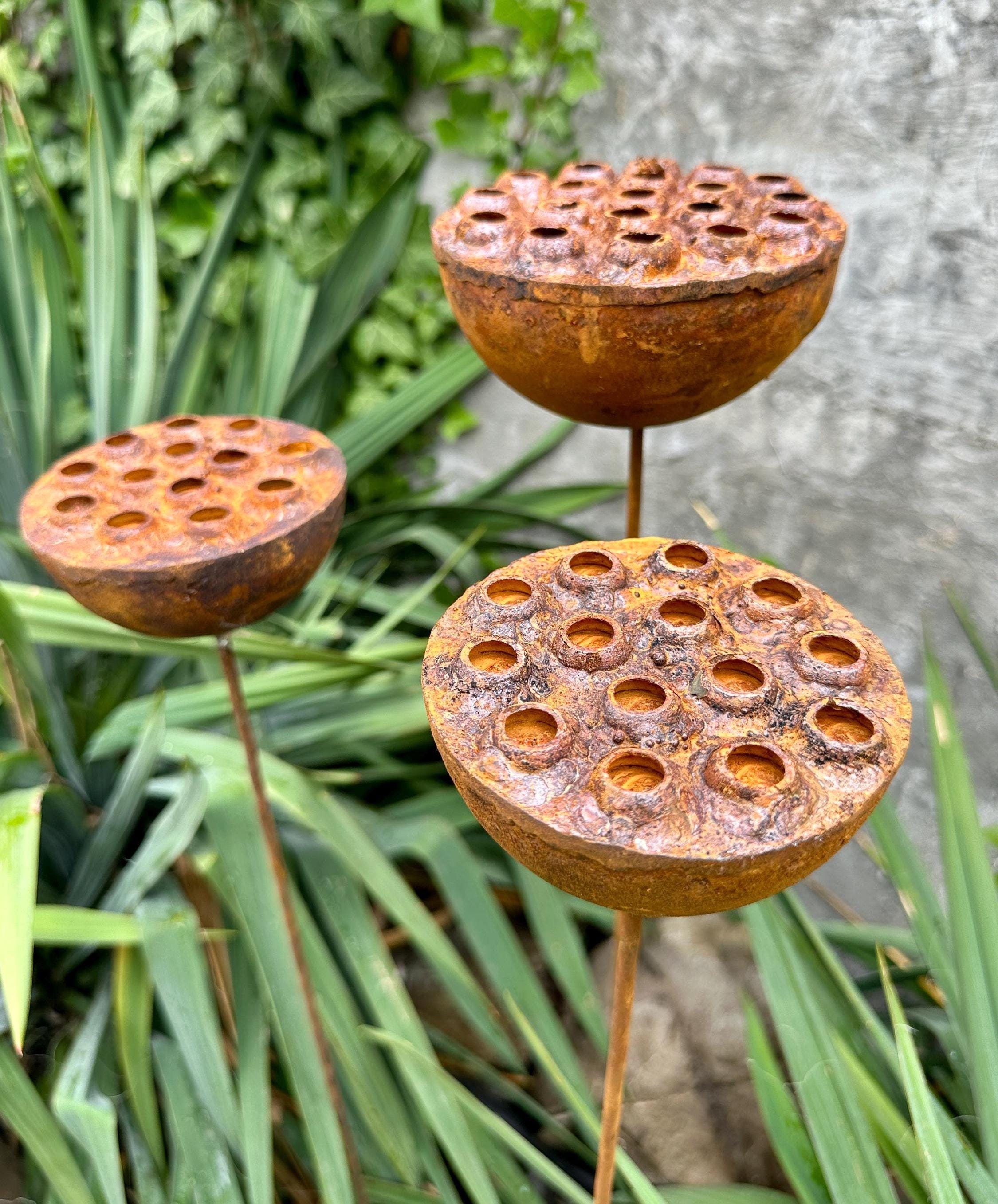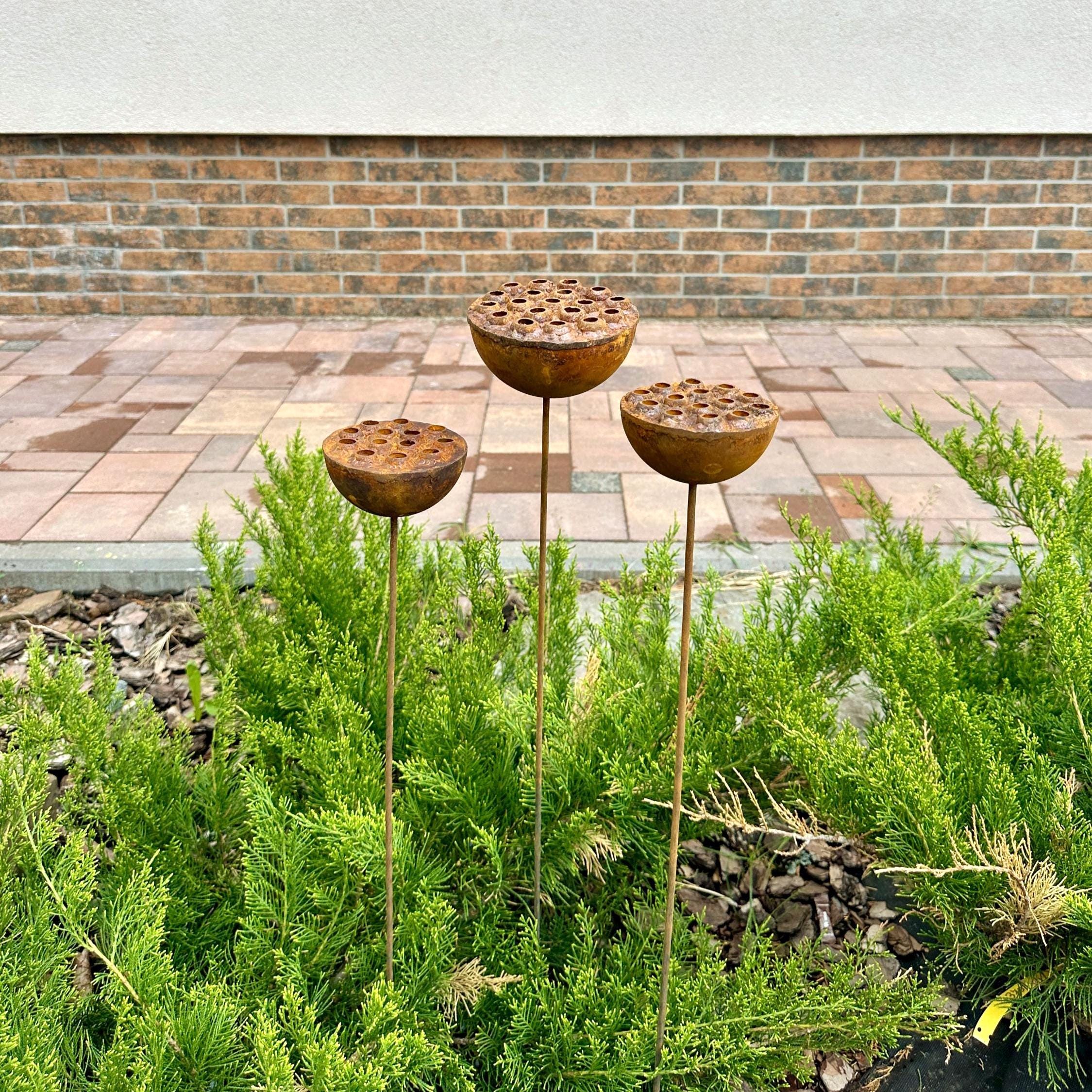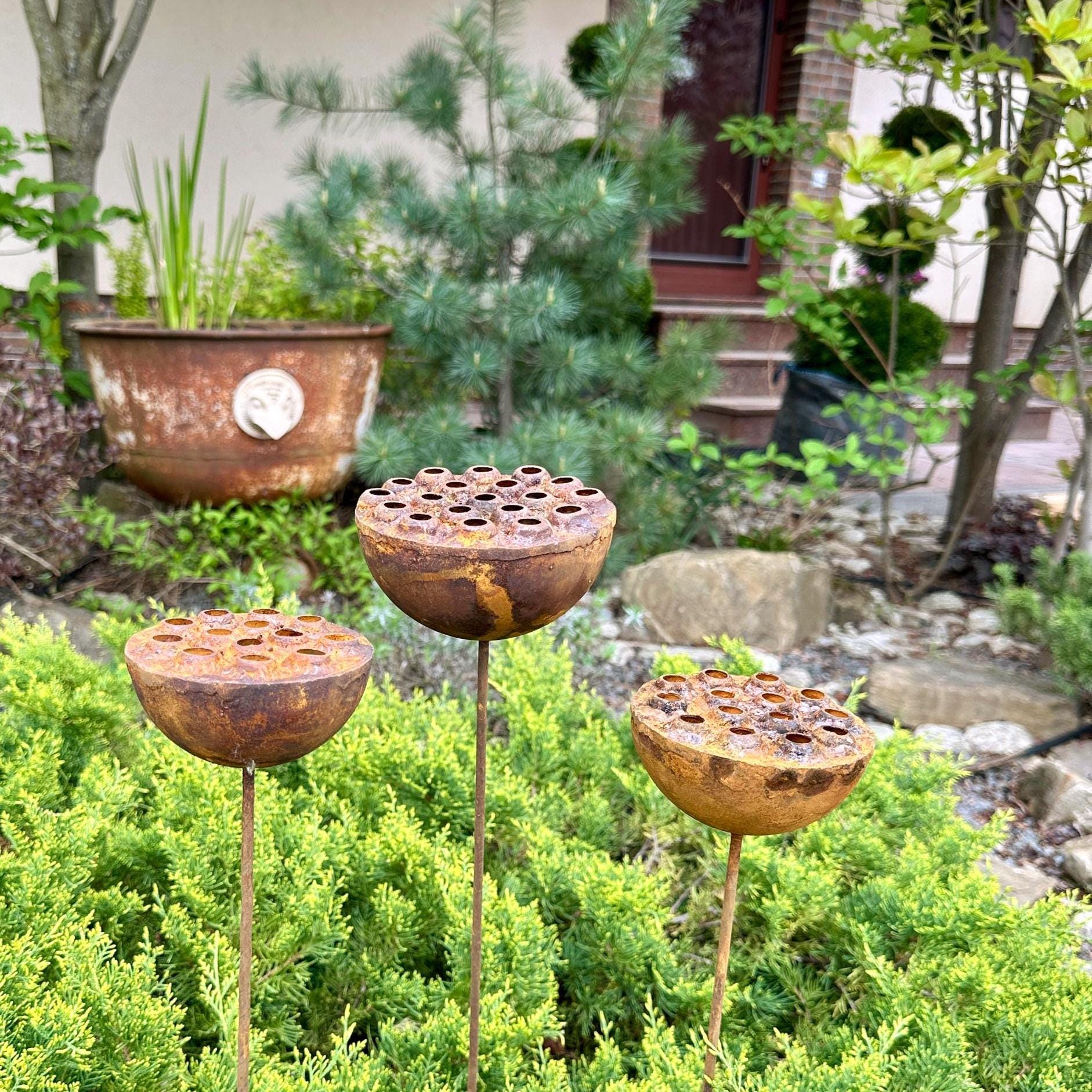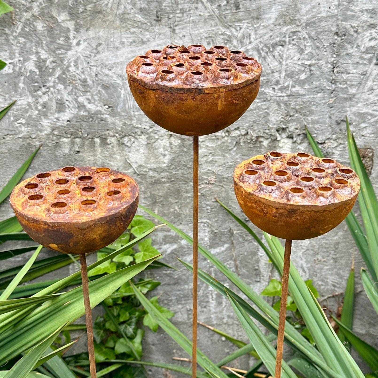 Bring a touch of the unexpected to your garden with this set of three handcrafted rustic metal exotic flowers. These unique sculptures add an artistic and eye-catching element to your landscaping, flower beds, or patio décor.