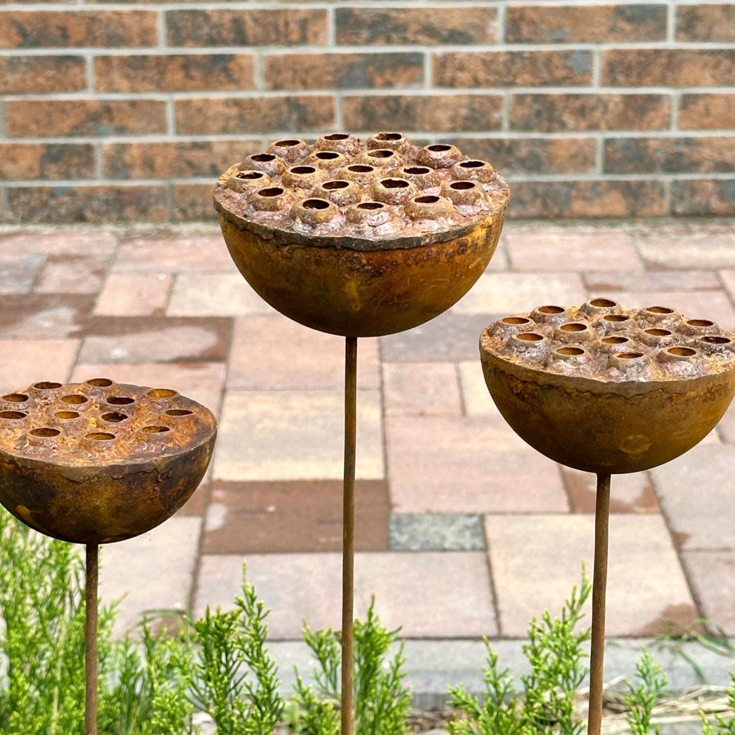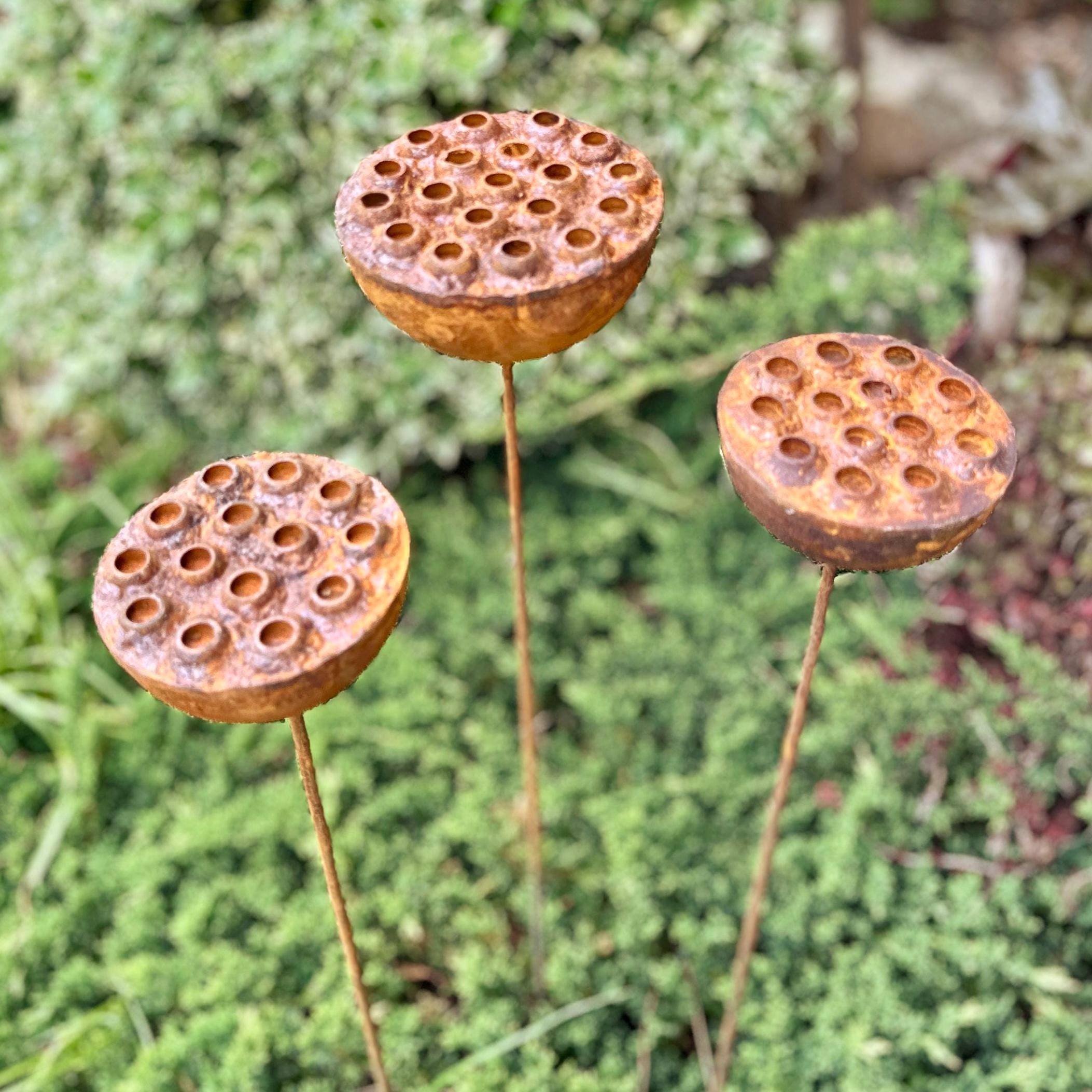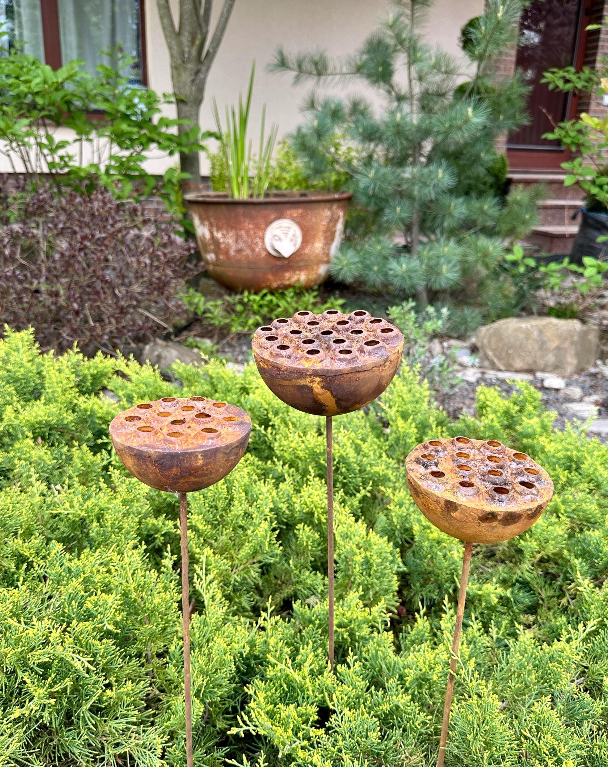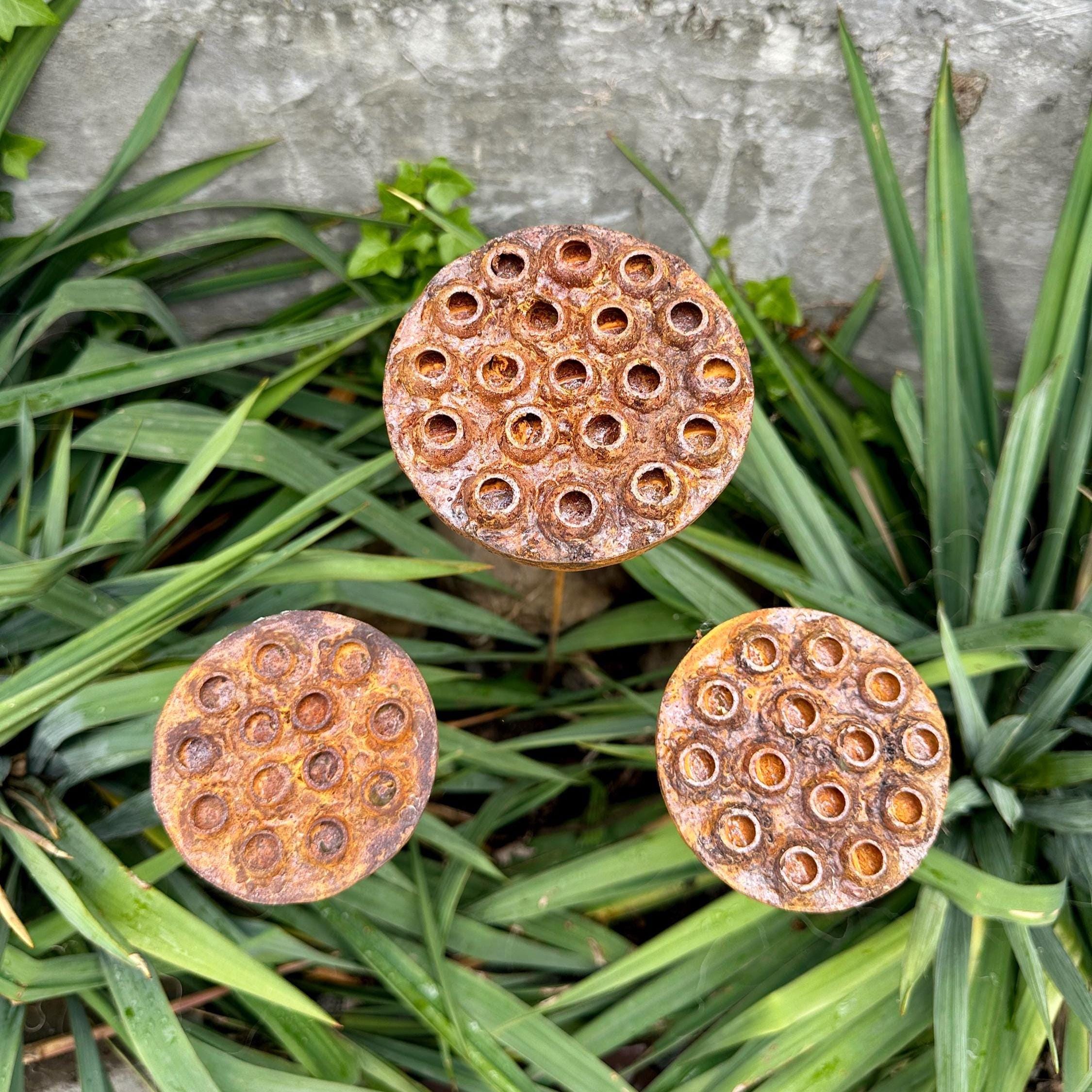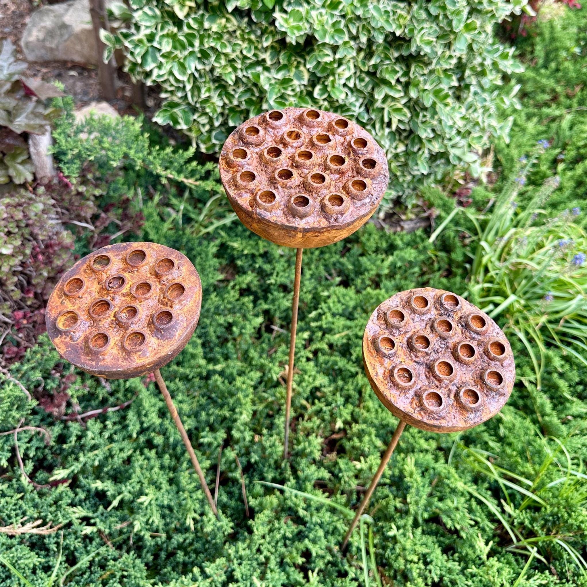 Bring a touch of the unexpected to your garden with this set of three handcrafted rustic metal exotic flowers. These unique sculptures add an artistic and eye-catching element to your landscaping, flower beds, or patio décor.