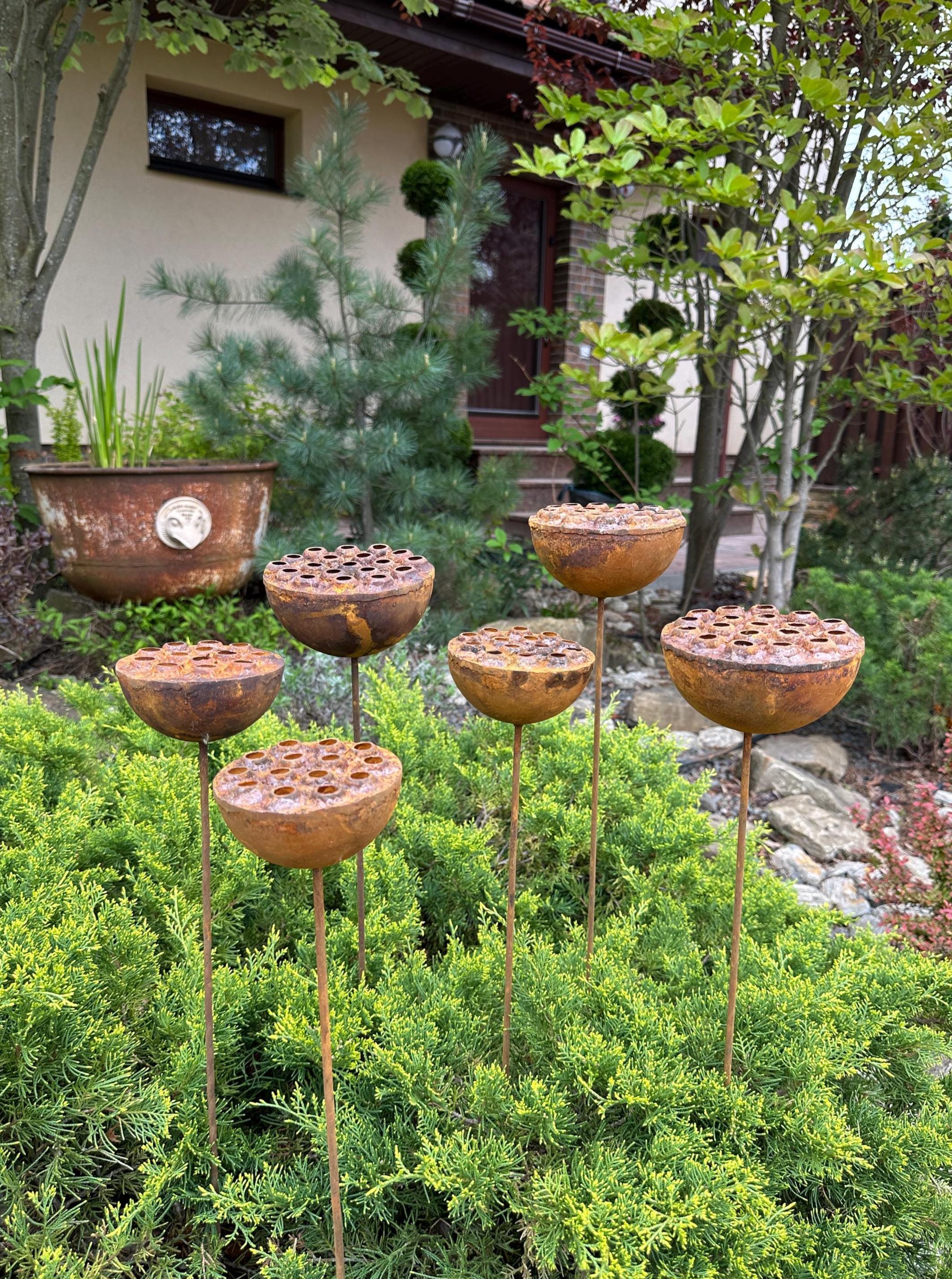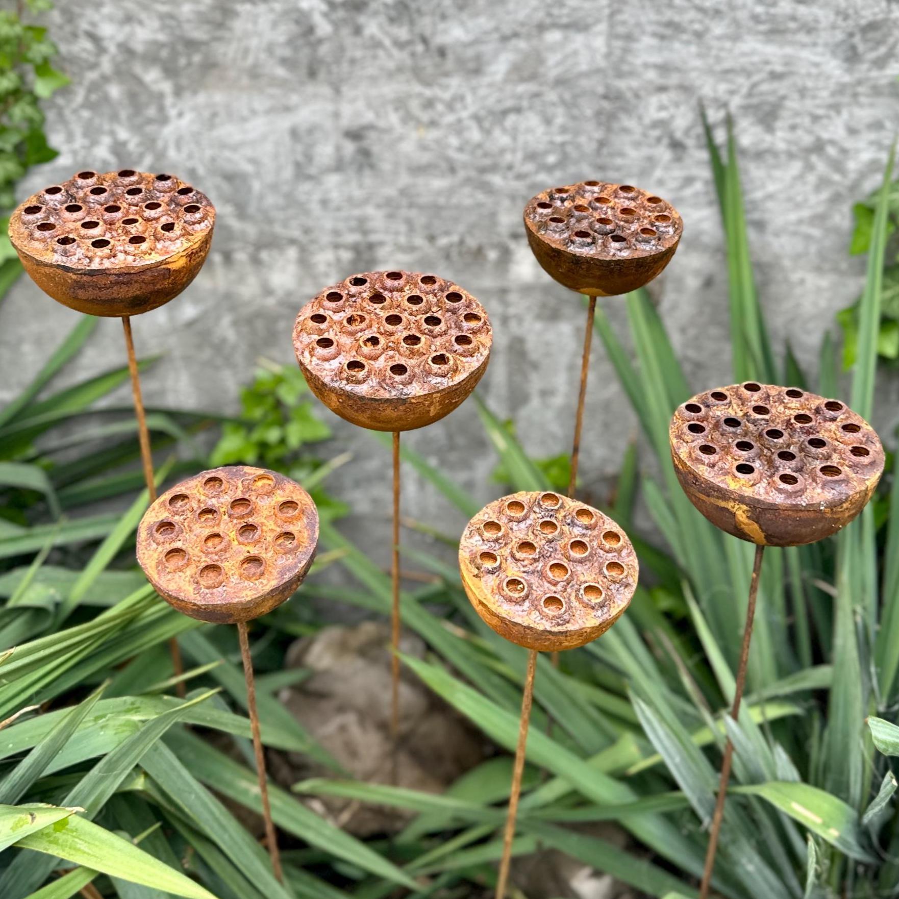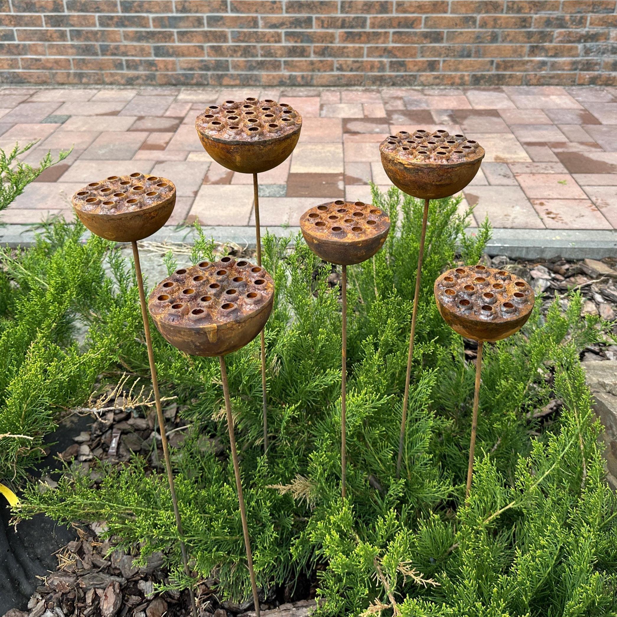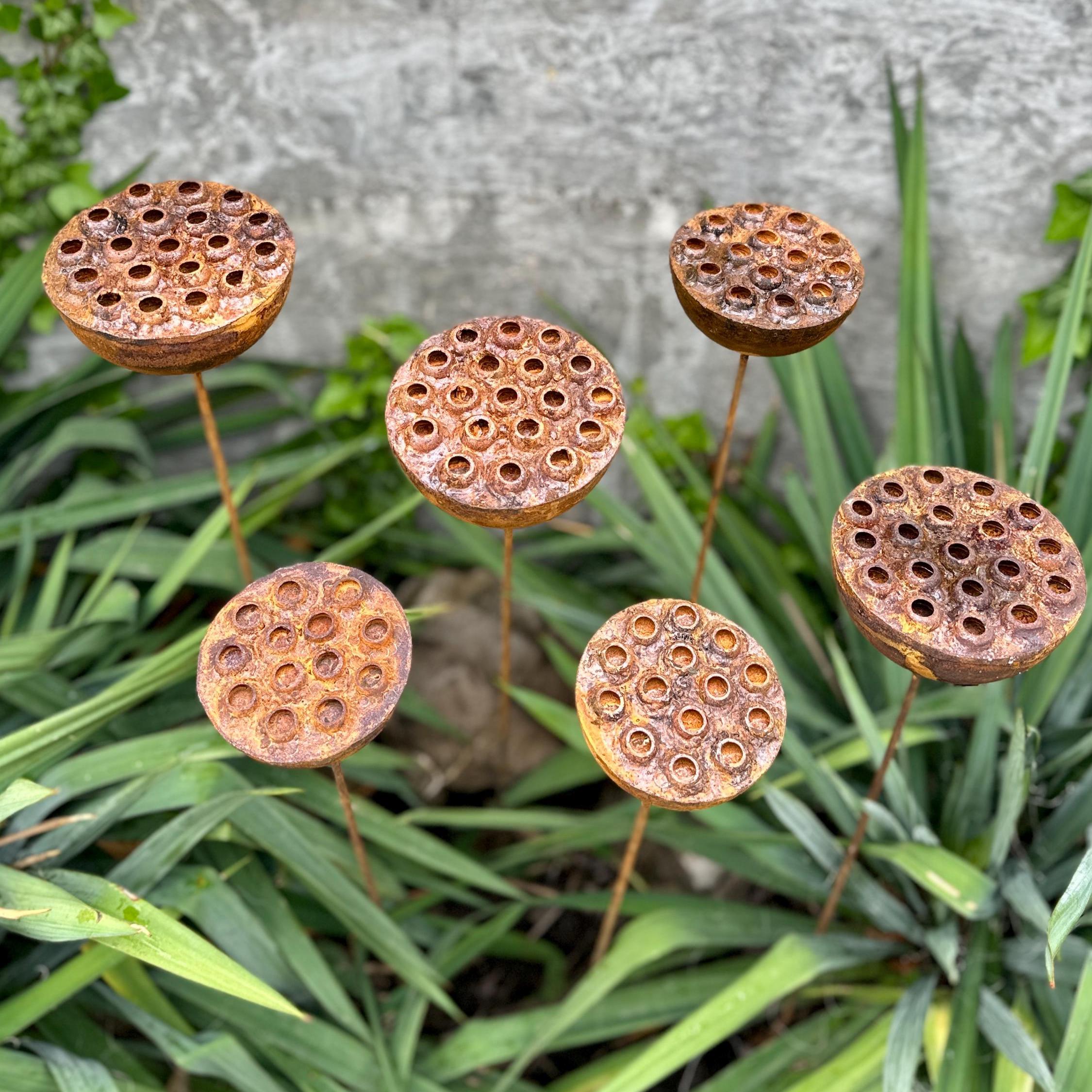 Bring bold, sculptural beauty to your outdoor space with this set of six handcrafted rustic metal lotus flowers. Their exotic design and natural rust patina create an eye-catching accent for flower beds, pathways, or patio planters—blending rustic charm with modern artistry.