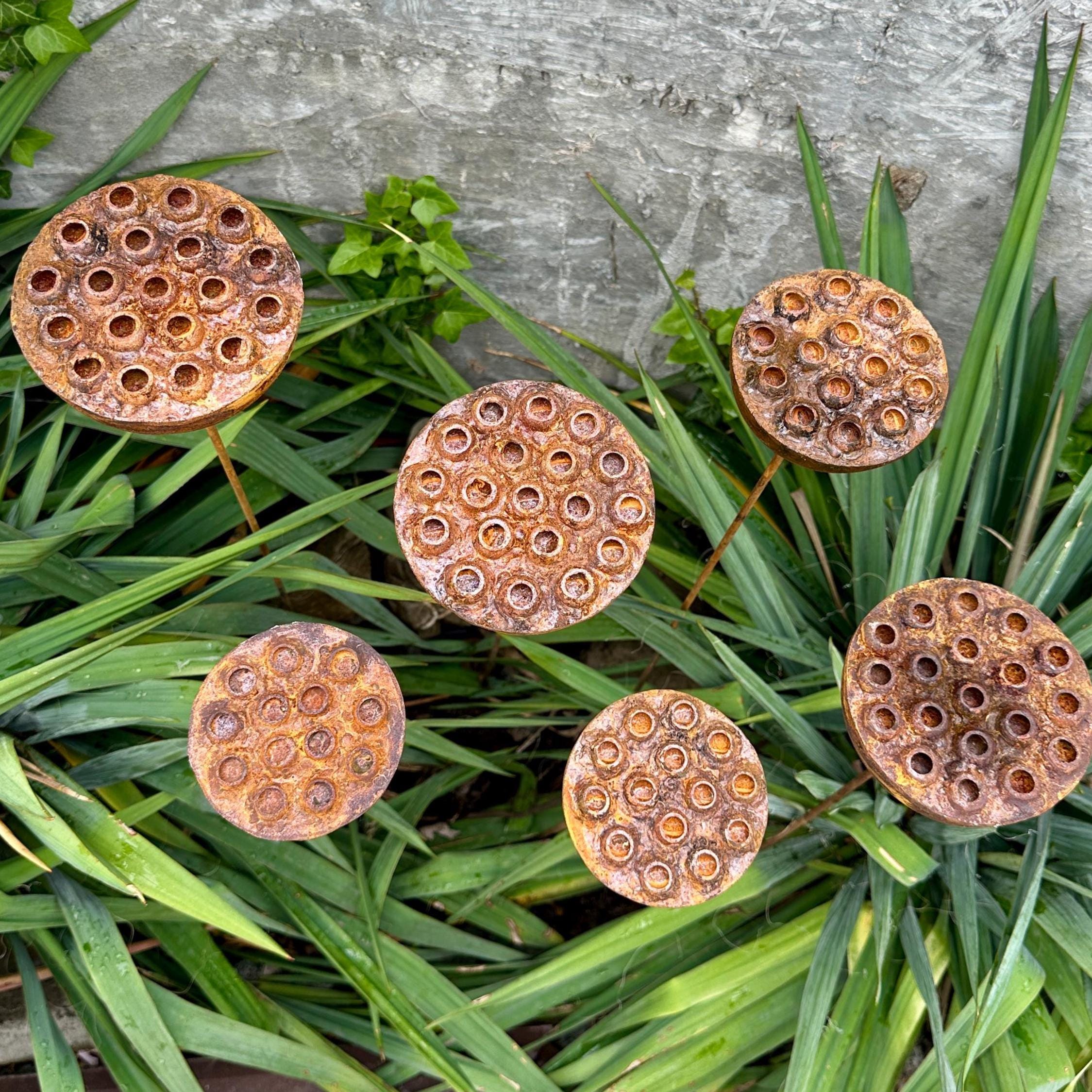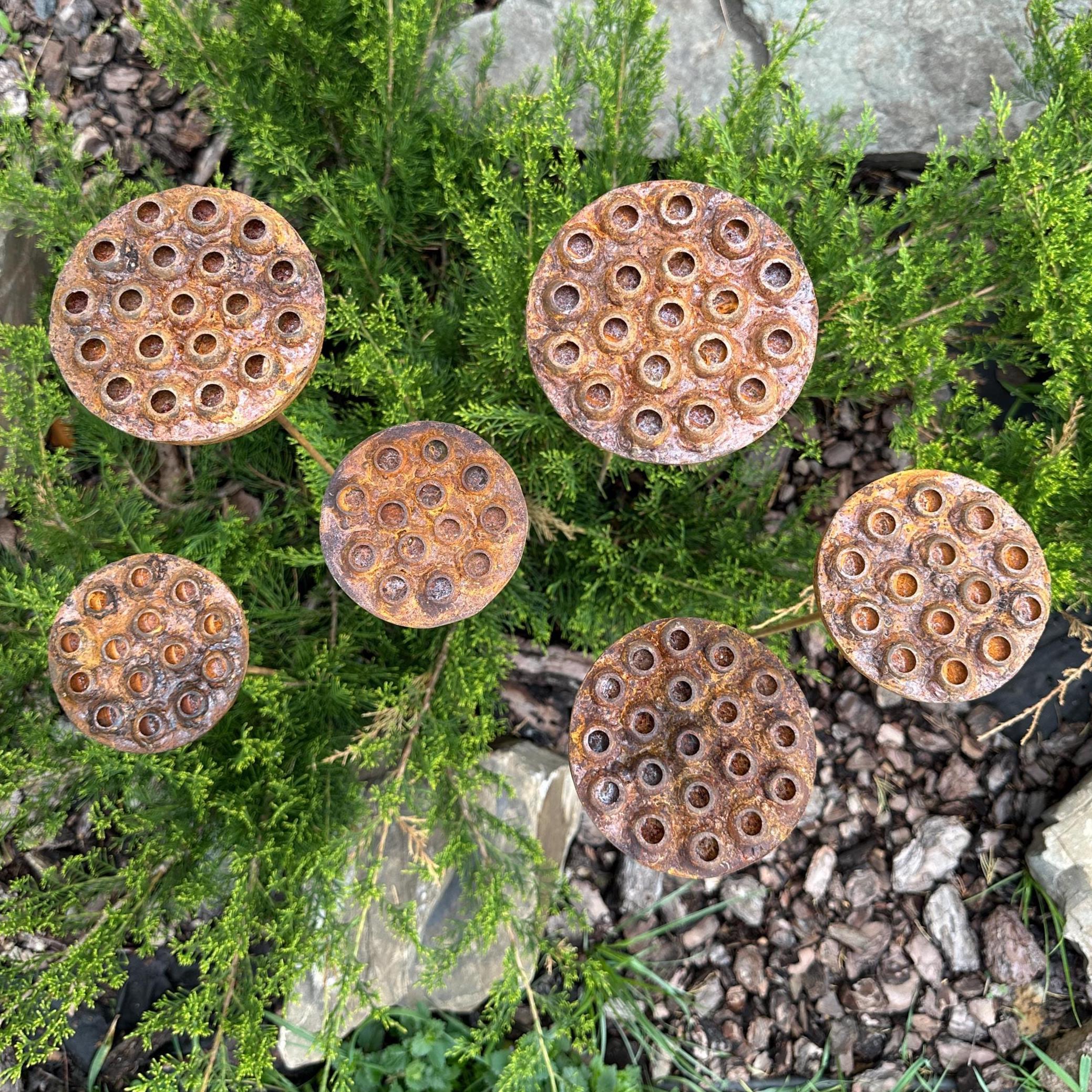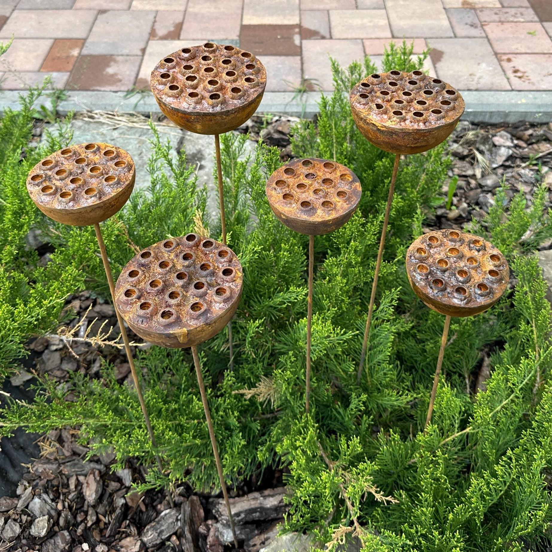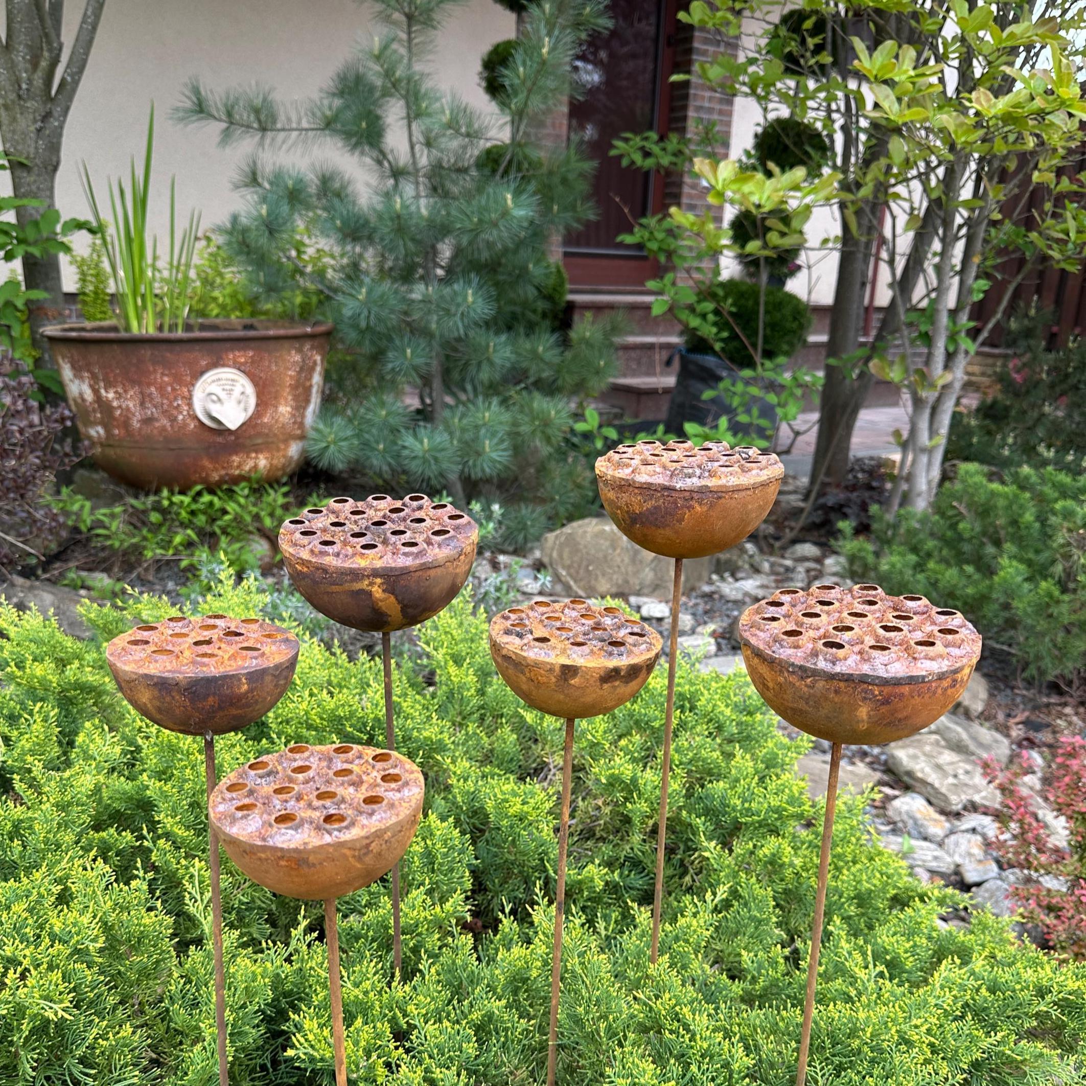 Bring bold, sculptural beauty to your outdoor space with this set of six handcrafted rustic metal lotus flowers. Their exotic design and natural rust patina create an eye-catching accent for flower beds, pathways, or patio planters—blending rustic charm with modern artistry.