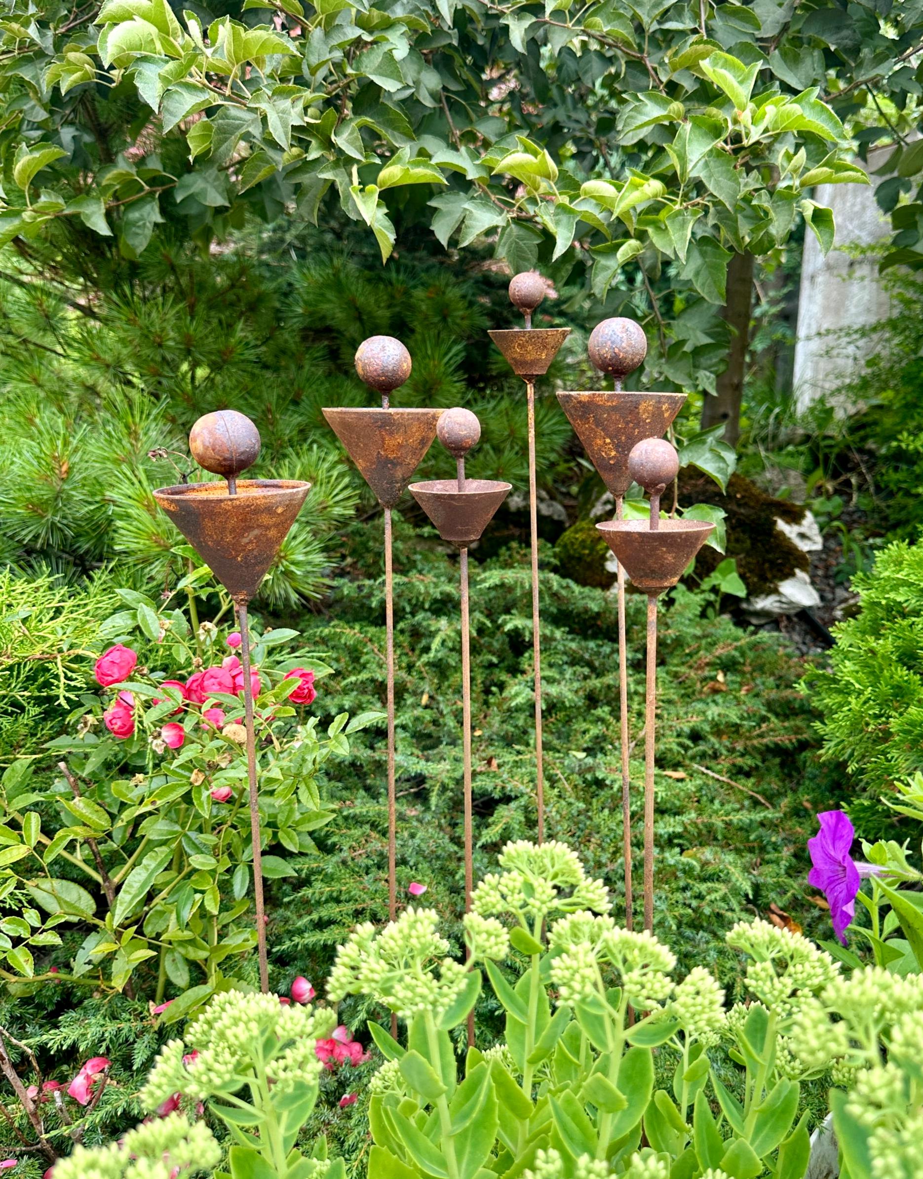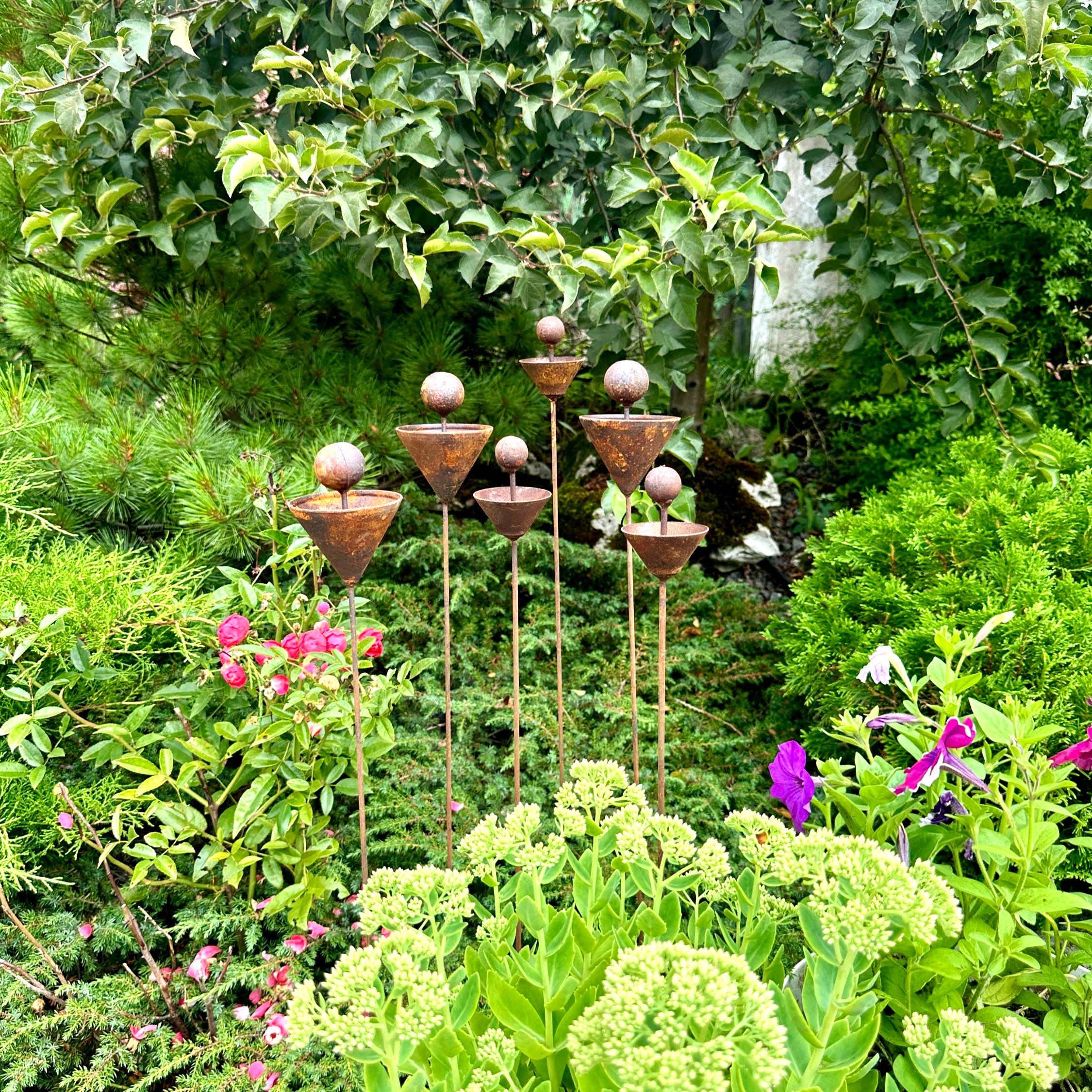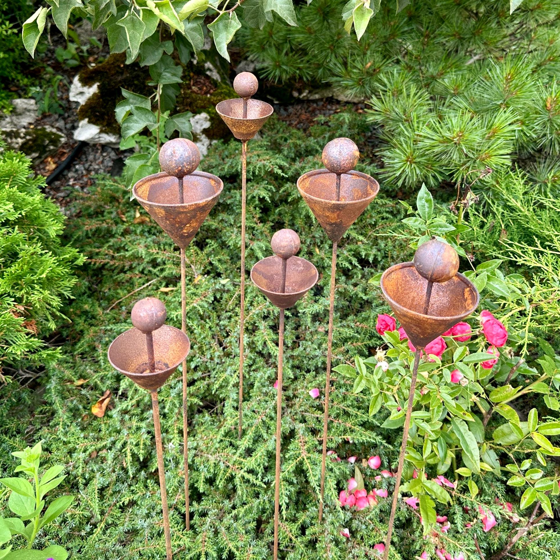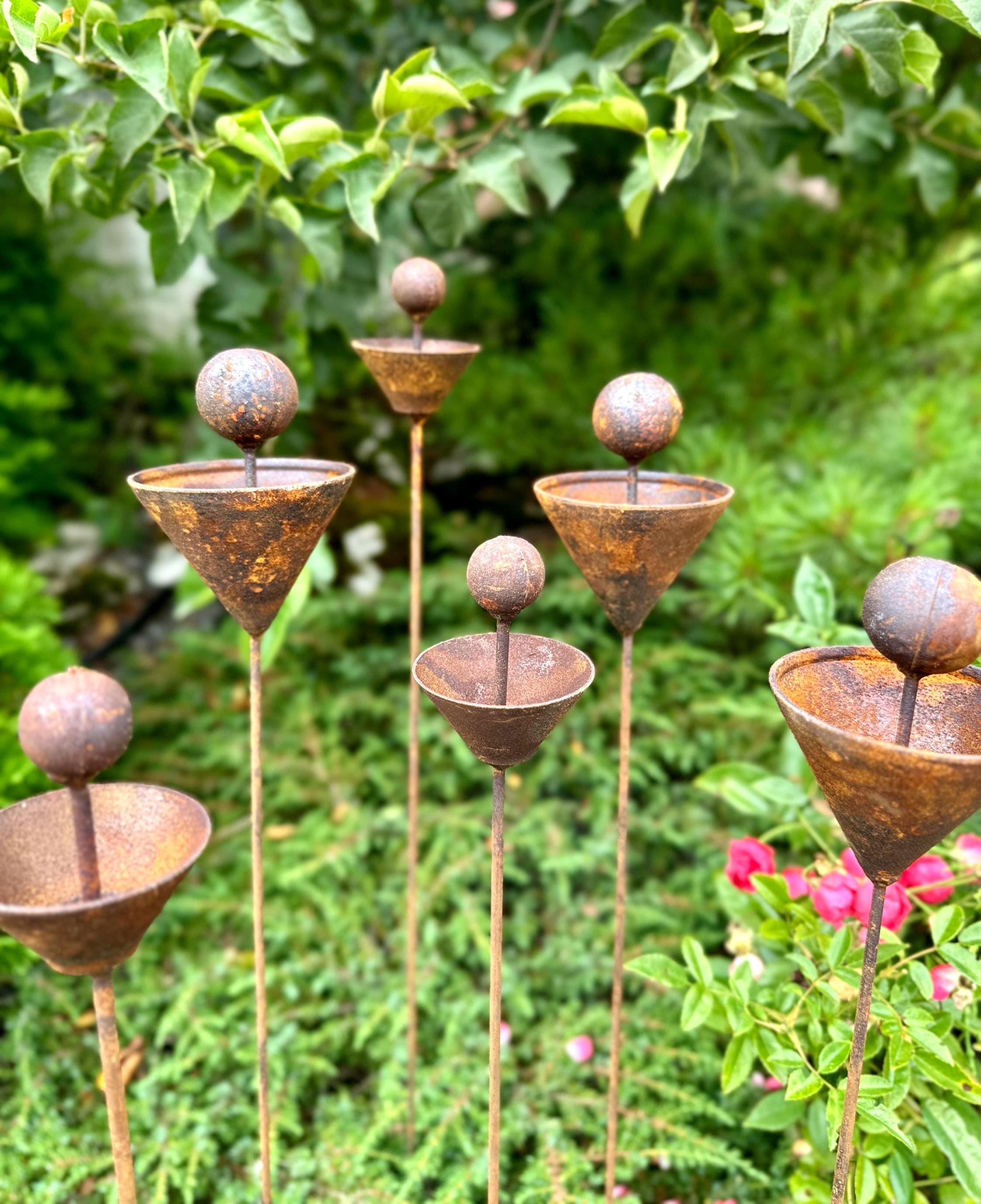 Handcrafted from natural steel and covered with a natural rust finish, these sculptures are made to withstand the elements year-round — resistant to rain, snow, and direct sunlight. Each flower is mounted on its own sturdy metal stake, allowing you to arrange them individually in beds, planters, or throughout your garden.