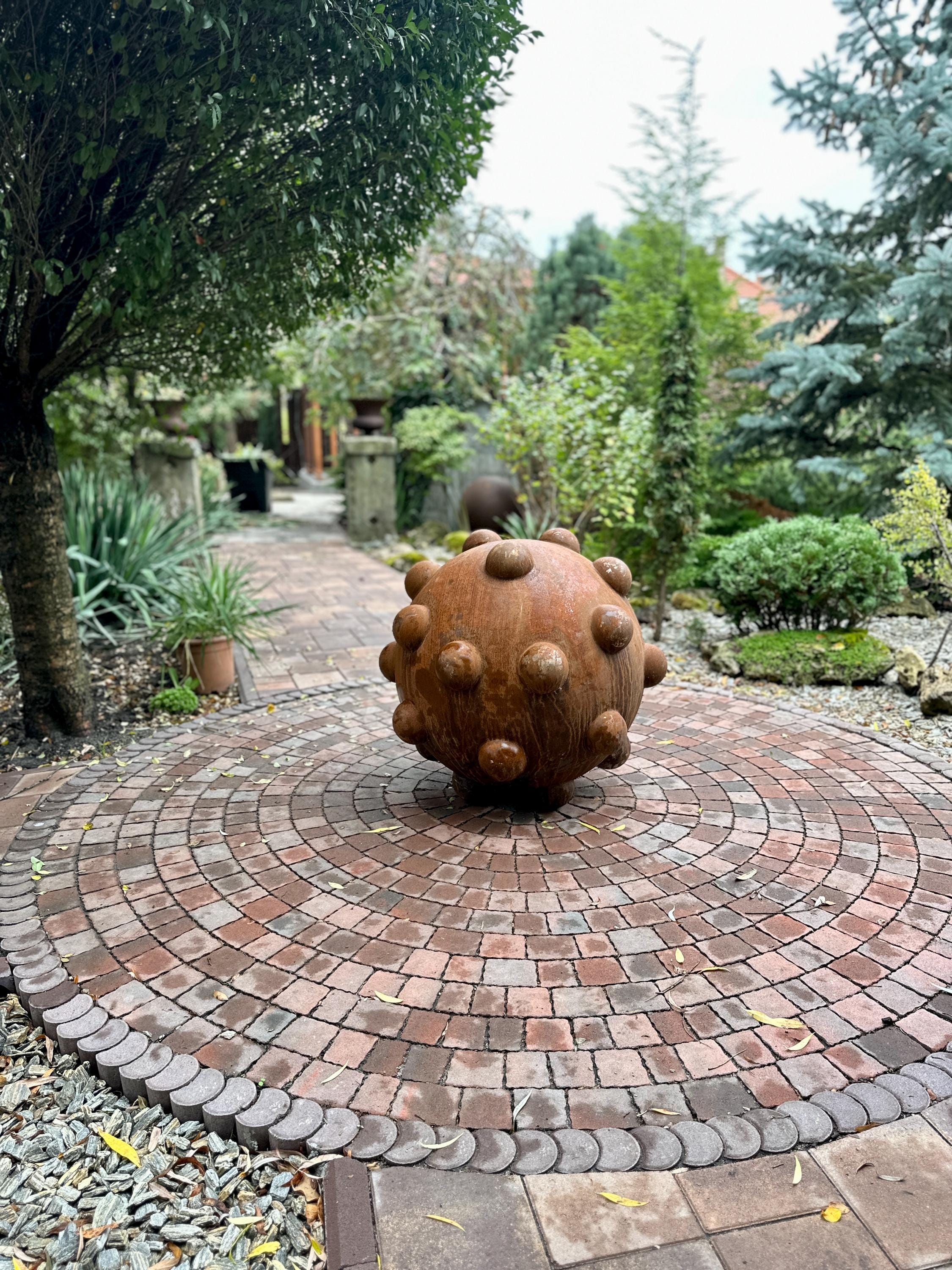 Enhance your outdoor space with this Corten Steel Garden Sphere, a handcrafted 31-inch sculpture designed to bring rustic charm and artistic elegance to any setting. Made from weathering steel, this metal sphere features a warm rust-like patina that develops naturally over time, blending beautifully with garden landscapes, patios, and courtyards.